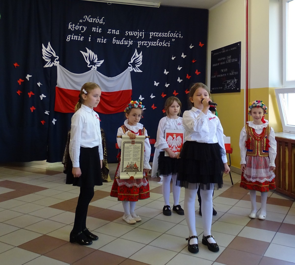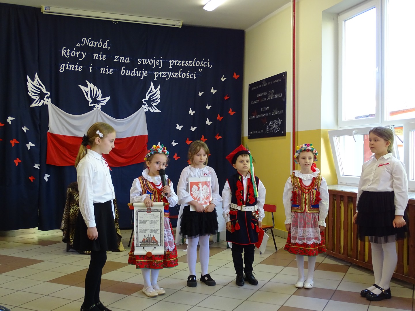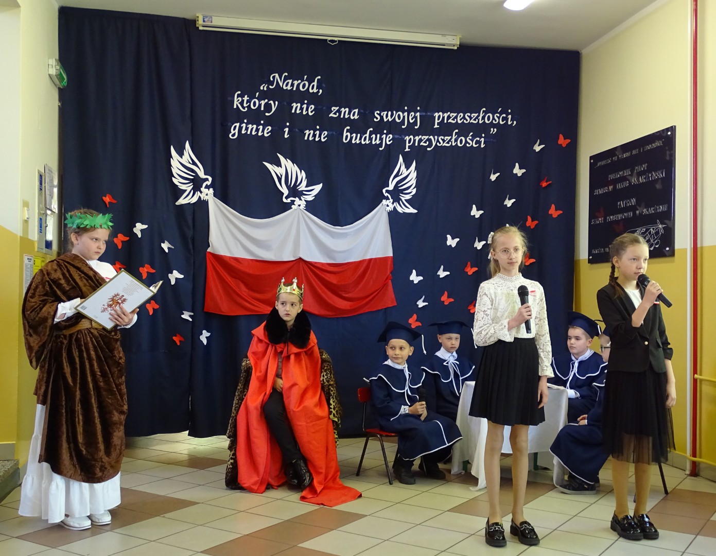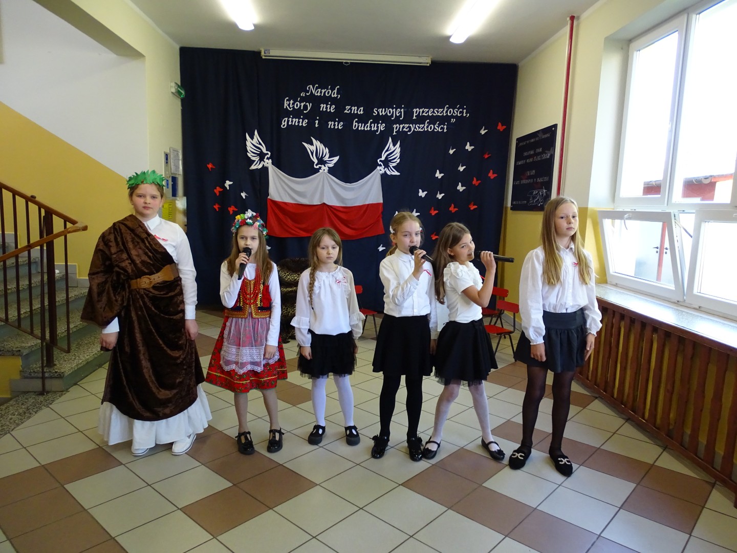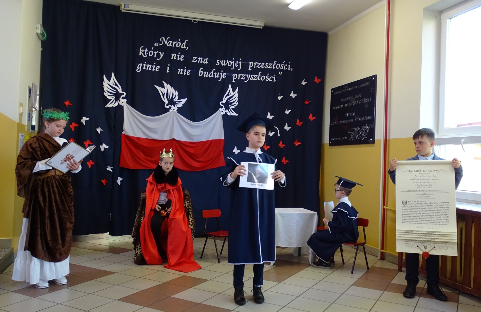 Podczas uroczystości uczniowie klas I – IV przenieśli zebranych do czasów panowania króla Stanisława Augusta Poniatowskiego i obrad Sejmu Wielkiego podczas którego uchwalono polską konstytucję. Młodzi artyści przypomnieli również polskie symbole narodowe, wyjaśnili czym jest patriotyzm, a także jak ważna jest dbałość o mowę ojczystą i tradycje. Najważniejsze informacje dotyczące tak ważnego wydarzenia dla naszej ojczyzny jakim było uchwalenie konstytucji przekazali w przystępny i atrakcyjny sposób szczególnie dla najmłodszych uczniów naszej szkoły. Akademia była okazją do refleksji i przypomnienia ważnych wydarzeń dotyczących naszego kraju, bo przecież naród, który nie zna swojej przeszłości, umiera i nie buduje przyszłości. Jest to także okazja do pielęgnowania naszych wartości narodowych i uzmysłowienia uczniom znaczenie takich słów jak: patriotyzm, wolność, naród, ojczyzna i tradycja.