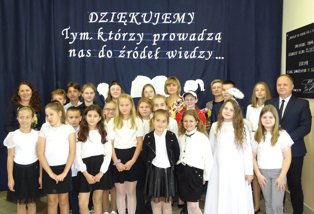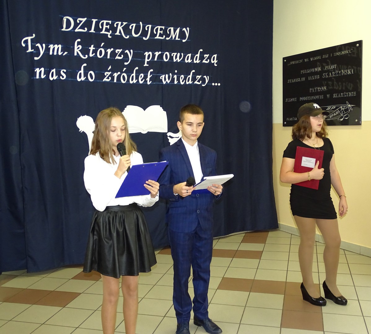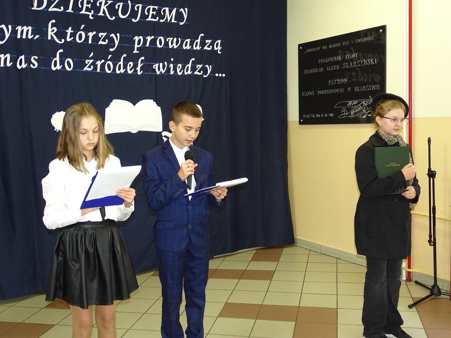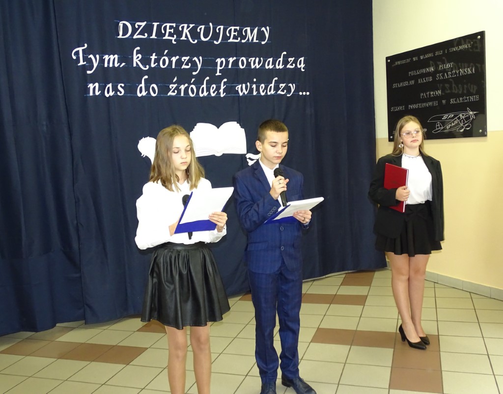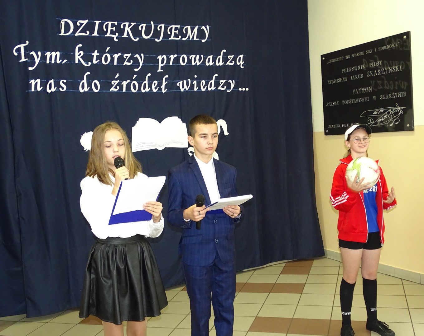 „Dziękujemy Tym, którzy prowadzą nas do źródeł wiedzy.” Pod takim hasłem przebiegała uroczystość Dnia Edukacji Narodowej, która odbyła się dnia 13 października 2023r. w Szkole Podstawowej im. płk. pil. St. J. Skarżyńskiego w Skarżynie. W tym roku obchodziliśmy 250 rocznicę utworzenia Komisji Edukacji Narodowej o czym przypomnieli przedstawiciele Samorządu Uczniowskiego i Dyrektor Szkoły w swoim przemówieniu. Po przywitaniu wszystkich przybyłych na uroczystość uczniowie prowadzący przedstawili w sposób żartobliwy malownicze sylwetki naszych kochanych pedagogów, bez których szkoła straciłaby bardzo wiele na swej atrakcyjności. Po przedstawieniu wszystkich typów nauczycieli przyszedł czas na uczniów, których trafnie scharakteryzował wiersz Wiktora Woroszylskiego pt. "My i nasza Pani". A skoro święto to nie mogło zabraknąć życzeń. Wygłosili je uczniowie w wierszu pt. Kwiaty dla nauczycieli” i piosence pt. „ Wyśpiewać dziś chcemy wam życzenia”. Na koniec Samorząd Uczniowski wręczył bukiety kwiatów wszystkim nauczycielom i pracownikom szkoły. Po części artystycznej Dyrektor Szkoły przypomniał założenia Komisji Edukacji Narodowej, podziękował nauczycielom i pracownikom szkoły za ich pracę i trud wkładany w proces edukacji młodego pokolenia. Jako wyraz uznania wręczył nagrody dyrektora nauczycielom i pracownikom szkoły, którzy w ubiegłym roku szkolnym wyróżnili się swoimi osiągnięciami. Na koniec głos zabrała Przewodnicząca Rady Rodziców pani Róża Froncala, która na ręce Pana Dyrektora złożyła kwiaty i życzenia dla wszystkich nauczycieli i pracowników szkoły. Na tym uroczystość się zakończyła a dalsza część dnia przebiegała w miłej i świątecznej atmosferze.