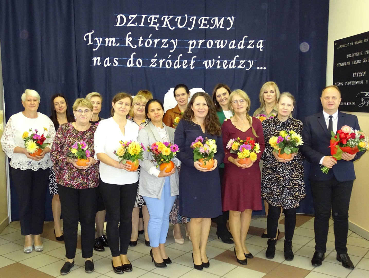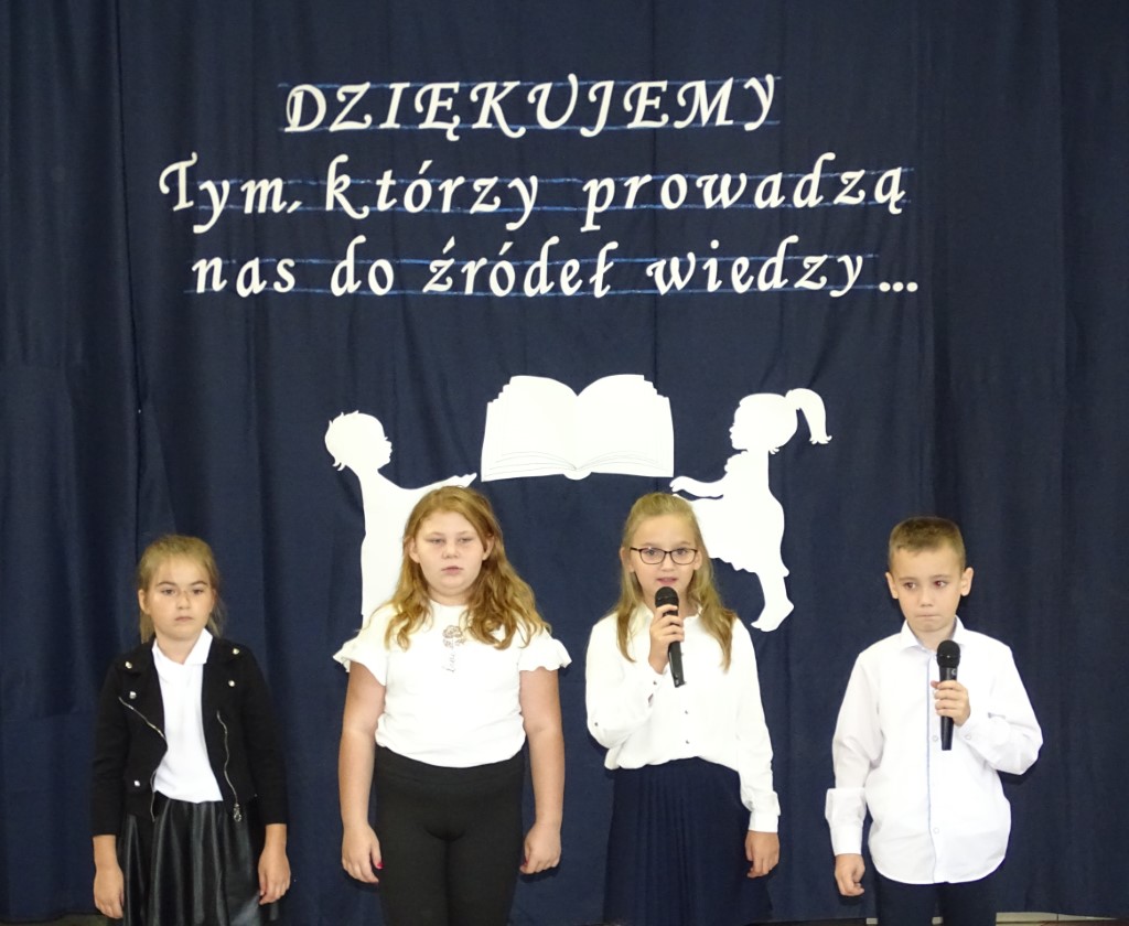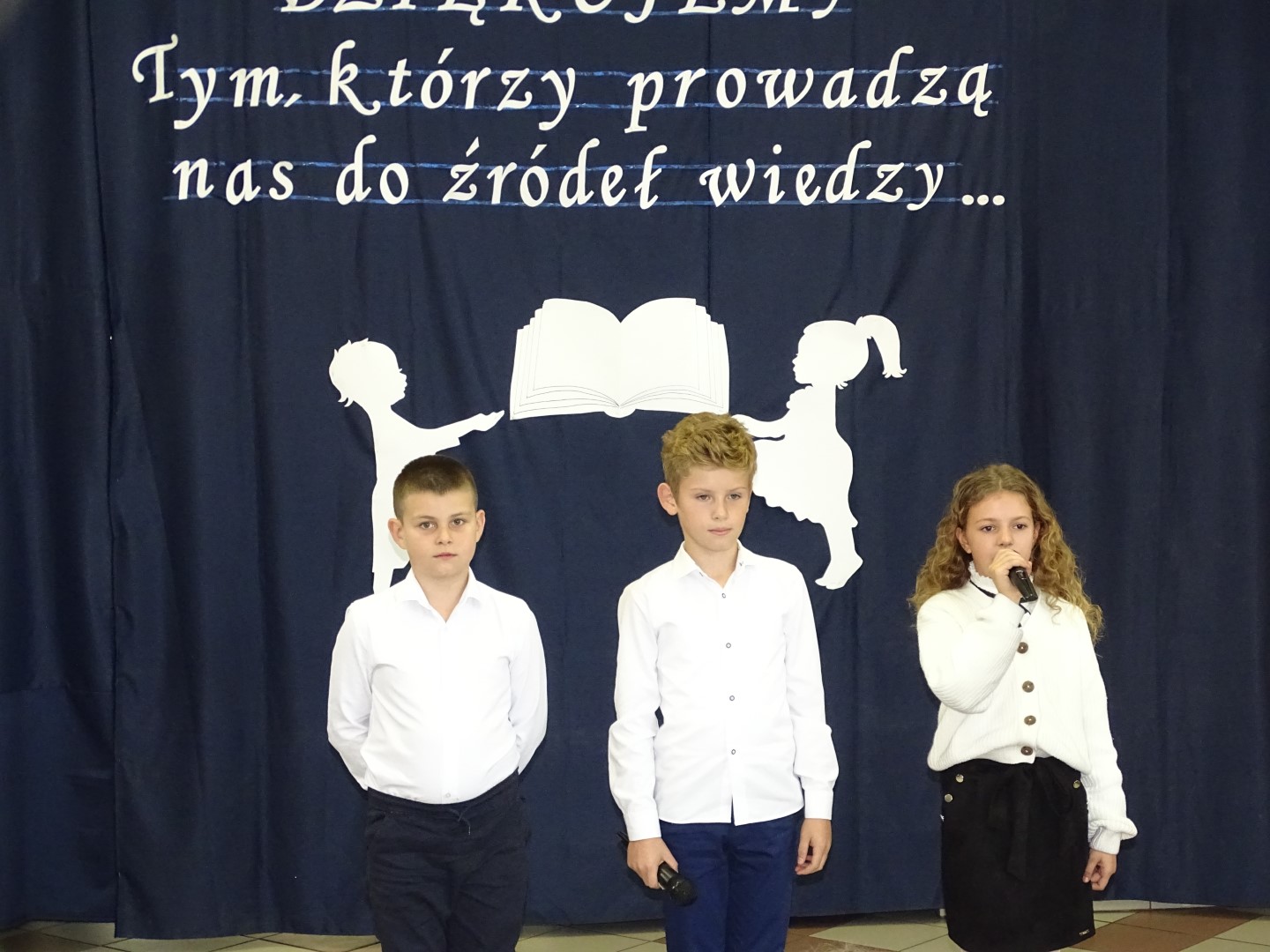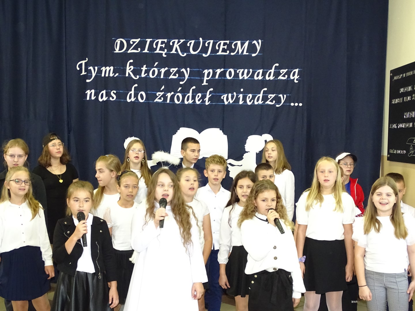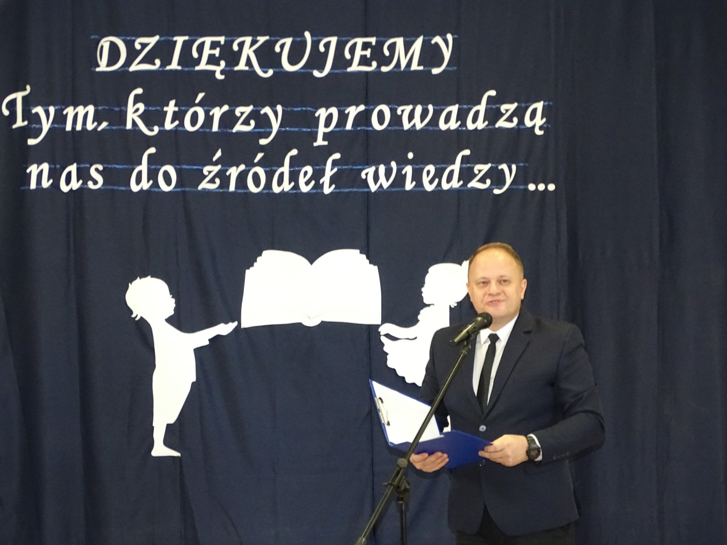 „Dziękujemy Tym, którzy prowadzą nas do źródeł wiedzy.” Pod takim hasłem przebiegała uroczystość Dnia Edukacji Narodowej, która odbyła się dnia 13 października 2023r. w Szkole Podstawowej im. płk. pil. St. J. Skarżyńskiego w Skarżynie. W tym roku obchodziliśmy 250 rocznicę utworzenia Komisji Edukacji Narodowej o czym przypomnieli przedstawiciele Samorządu Uczniowskiego i Dyrektor Szkoły w swoim przemówieniu. Po przywitaniu wszystkich przybyłych na uroczystość uczniowie prowadzący przedstawili w sposób żartobliwy malownicze sylwetki naszych kochanych pedagogów, bez których szkoła straciłaby bardzo wiele na swej atrakcyjności. Po przedstawieniu wszystkich typów nauczycieli przyszedł czas na uczniów, których trafnie scharakteryzował wiersz Wiktora Woroszylskiego pt. "My i nasza Pani". A skoro święto to nie mogło zabraknąć życzeń. Wygłosili je uczniowie w wierszu pt. Kwiaty dla nauczycieli” i piosence pt. „ Wyśpiewać dziś chcemy wam życzenia”. Na koniec Samorząd Uczniowski wręczył bukiety kwiatów wszystkim nauczycielom i pracownikom szkoły. Po części artystycznej Dyrektor Szkoły przypomniał założenia Komisji Edukacji Narodowej, podziękował nauczycielom i pracownikom szkoły za ich pracę i trud wkładany w proces edukacji młodego pokolenia. Jako wyraz uznania wręczył nagrody dyrektora nauczycielom i pracownikom szkoły, którzy w ubiegłym roku szkolnym wyróżnili się swoimi osiągnięciami. Na koniec głos zabrała Przewodnicząca Rady Rodziców pani Róża Froncala, która na ręce Pana Dyrektora złożyła kwiaty i życzenia dla wszystkich nauczycieli i pracowników szkoły. Na tym uroczystość się zakończyła a dalsza część dnia przebiegała w miłej i świątecznej atmosferze.