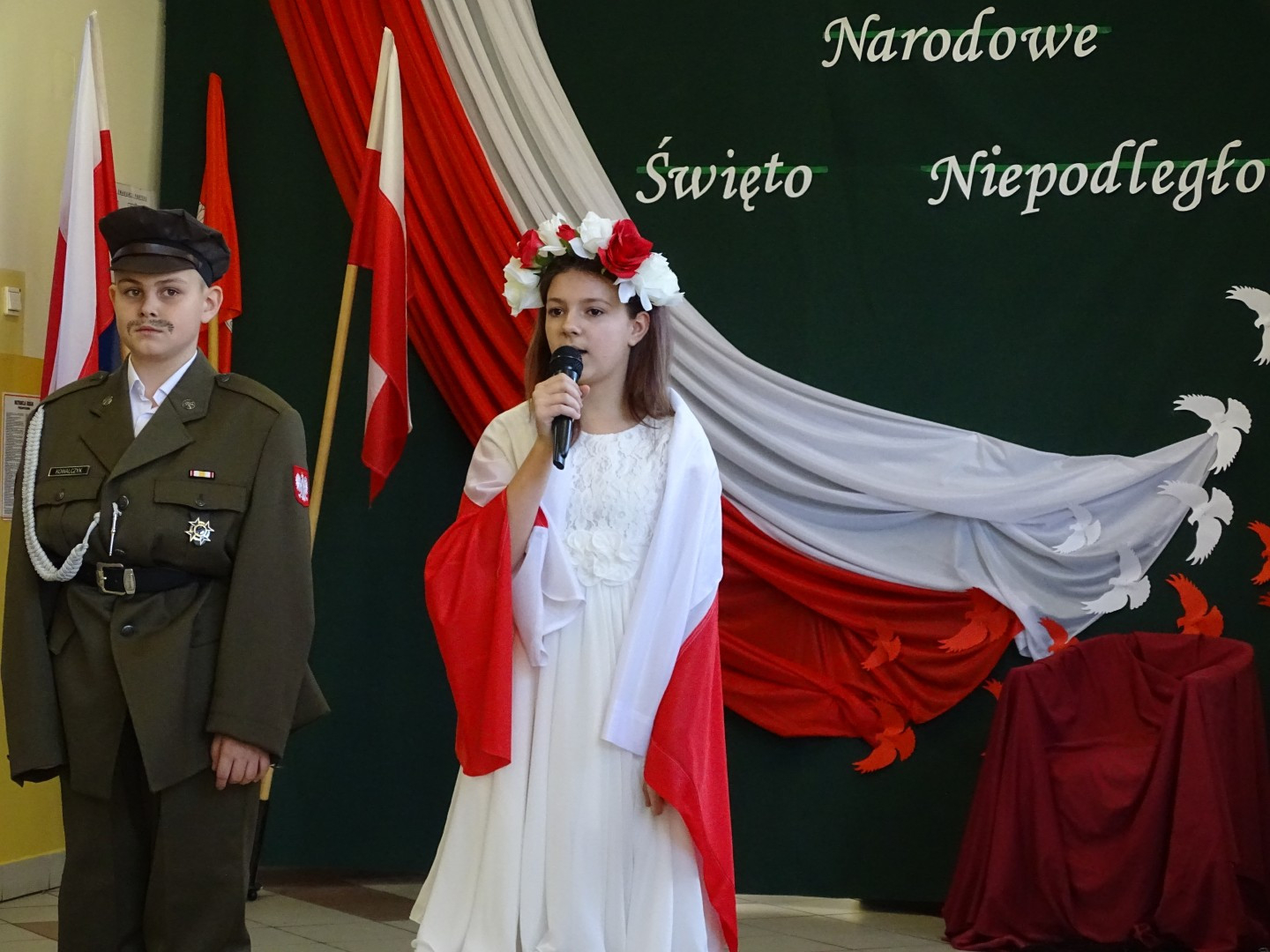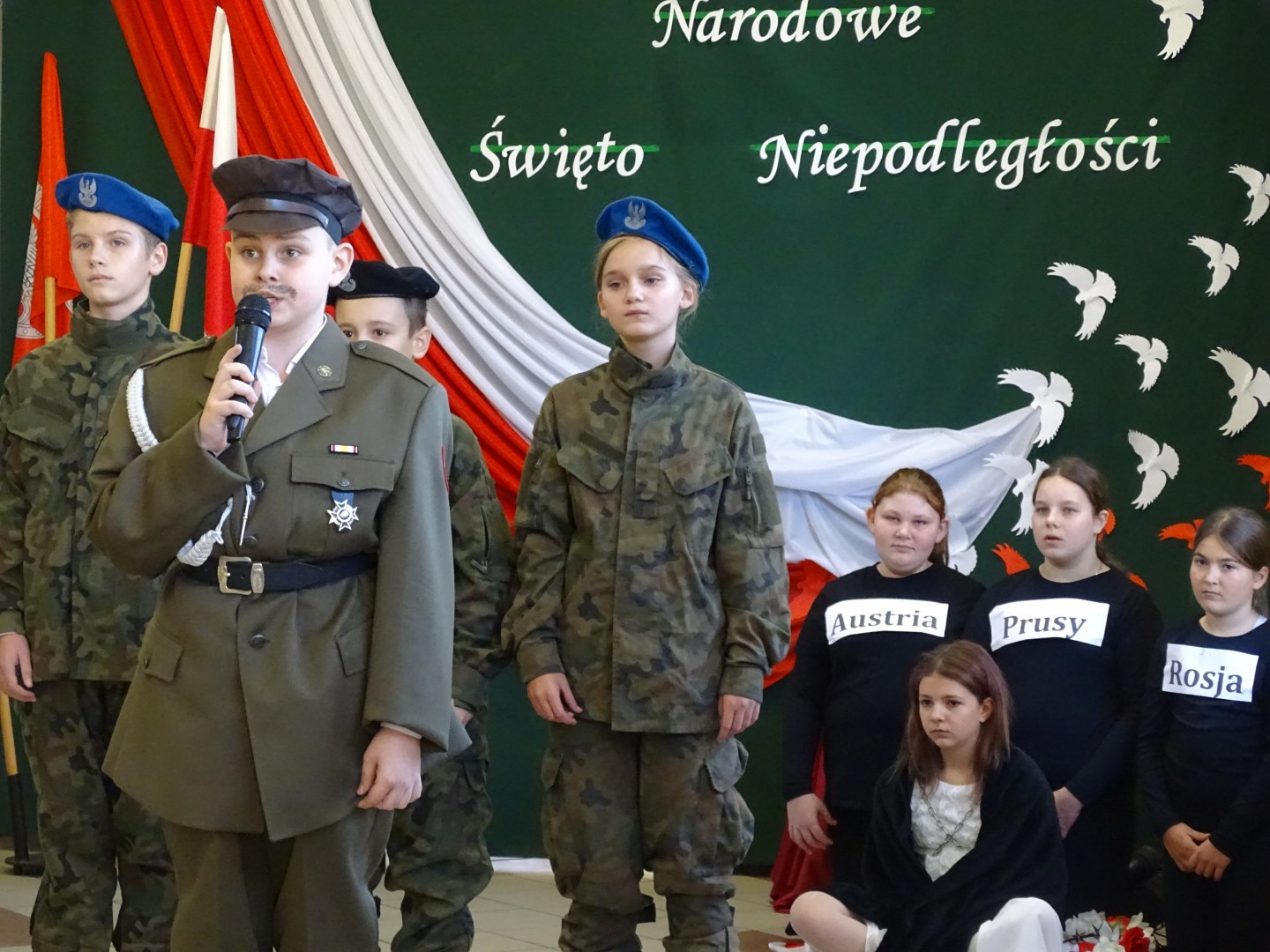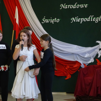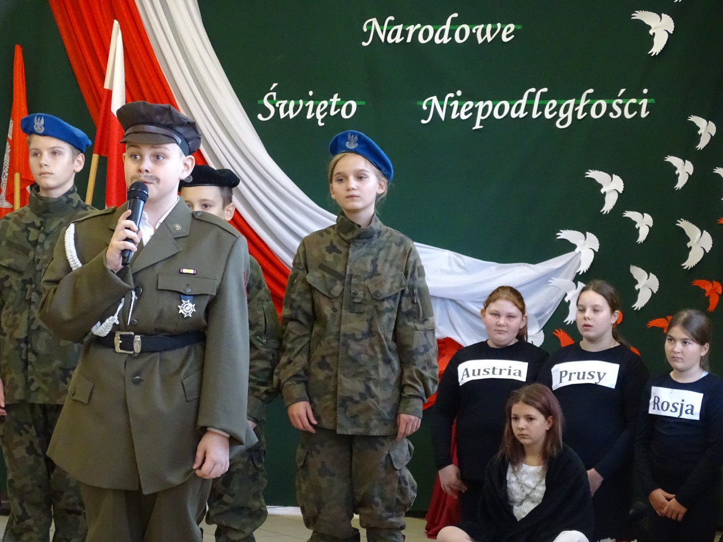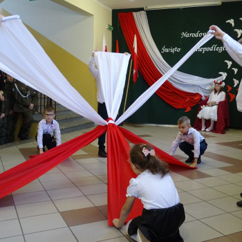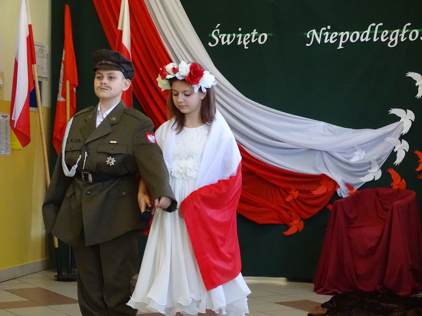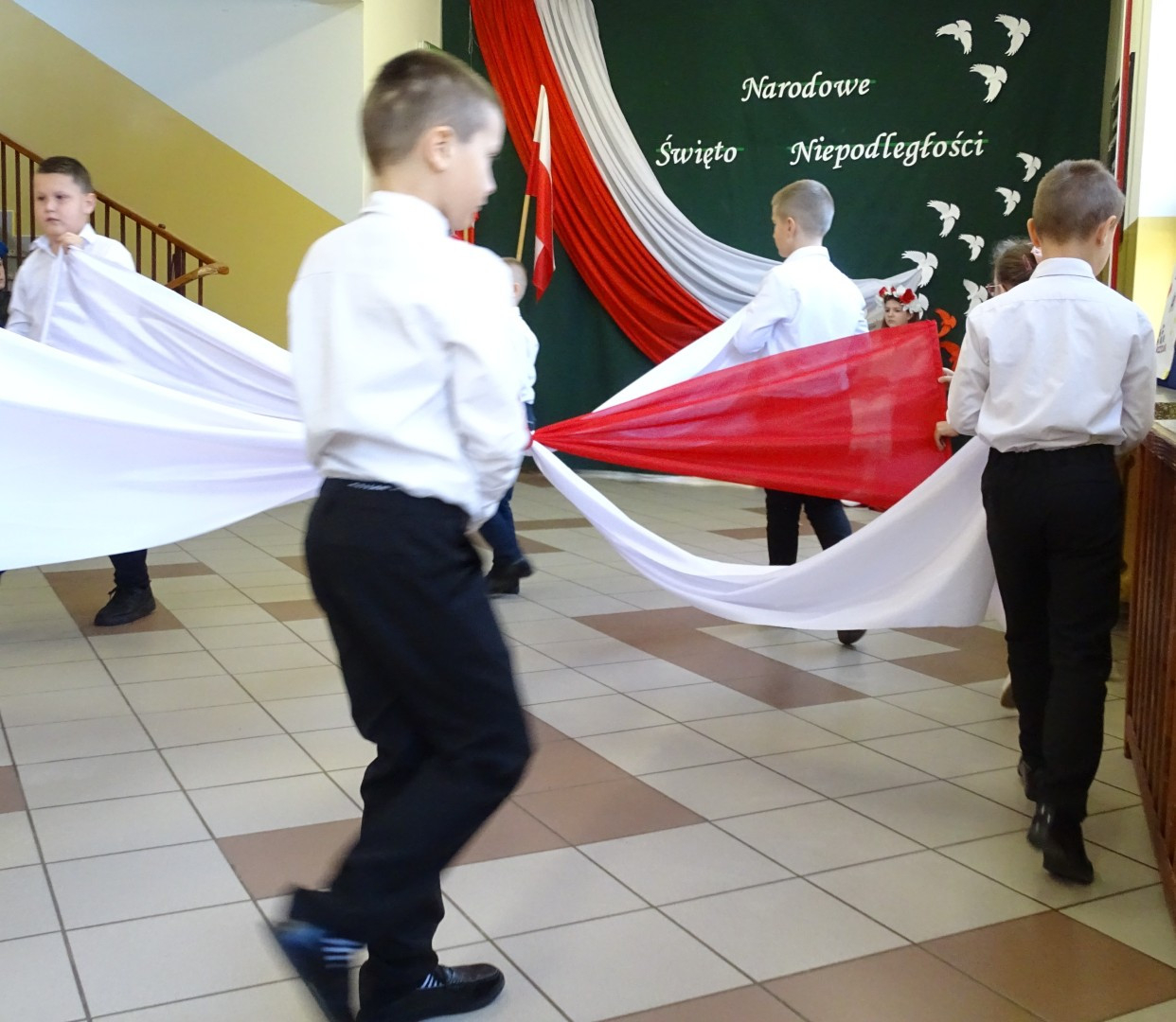 W montażu słowno – wokalno – tanecznym uczniowie naszej szkoły przypomnieli wydarzenia z czasów rozbiorów oraz walki o niepodległość naszego kraju. Młodzi artyści najważniejsze informacje dotyczące, tak ważnych wydarzenia dla naszej ojczyzny przekazali w przystępny i atrakcyjny sposób szczególnie dla najmłodszych uczniów naszej szkoły. Akademia została wzbogacona o piosenki i pieśni patriotyczne a także o przepiękny taniec w wykonaniu uczniów kasy II. Powagi uroczystości nadała także dekoracja, poczet flagowy oraz odświętne stroje i kotyliony narodowe, które mieli wszyscy uczniowie.