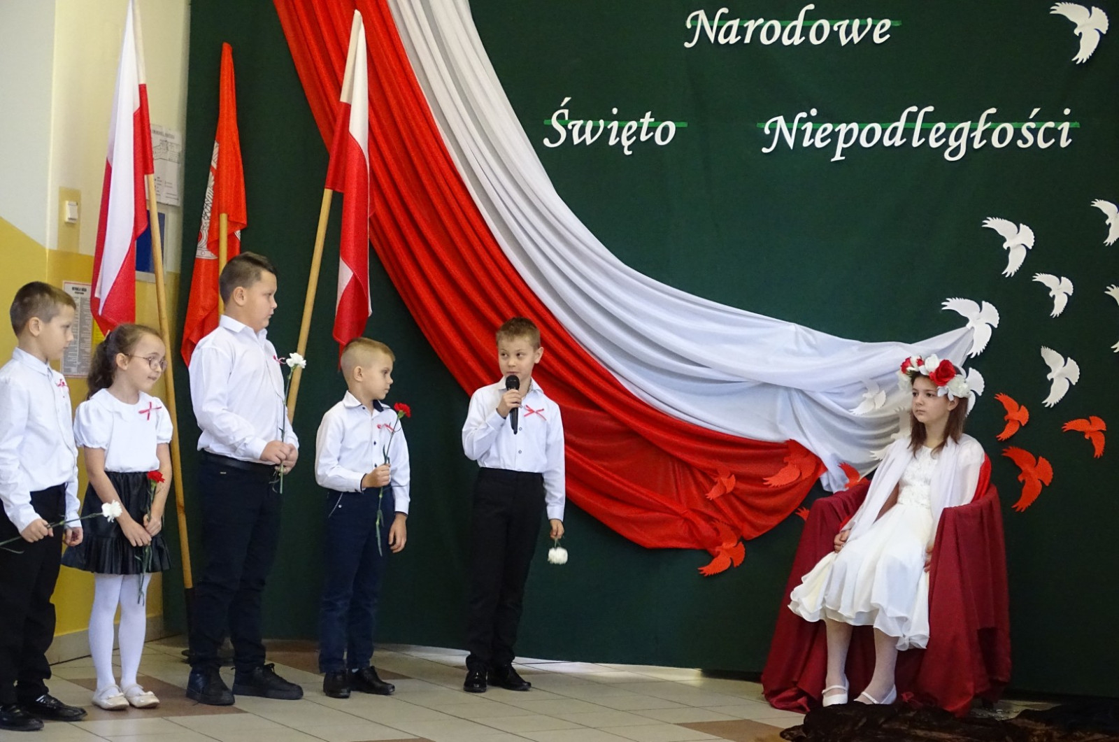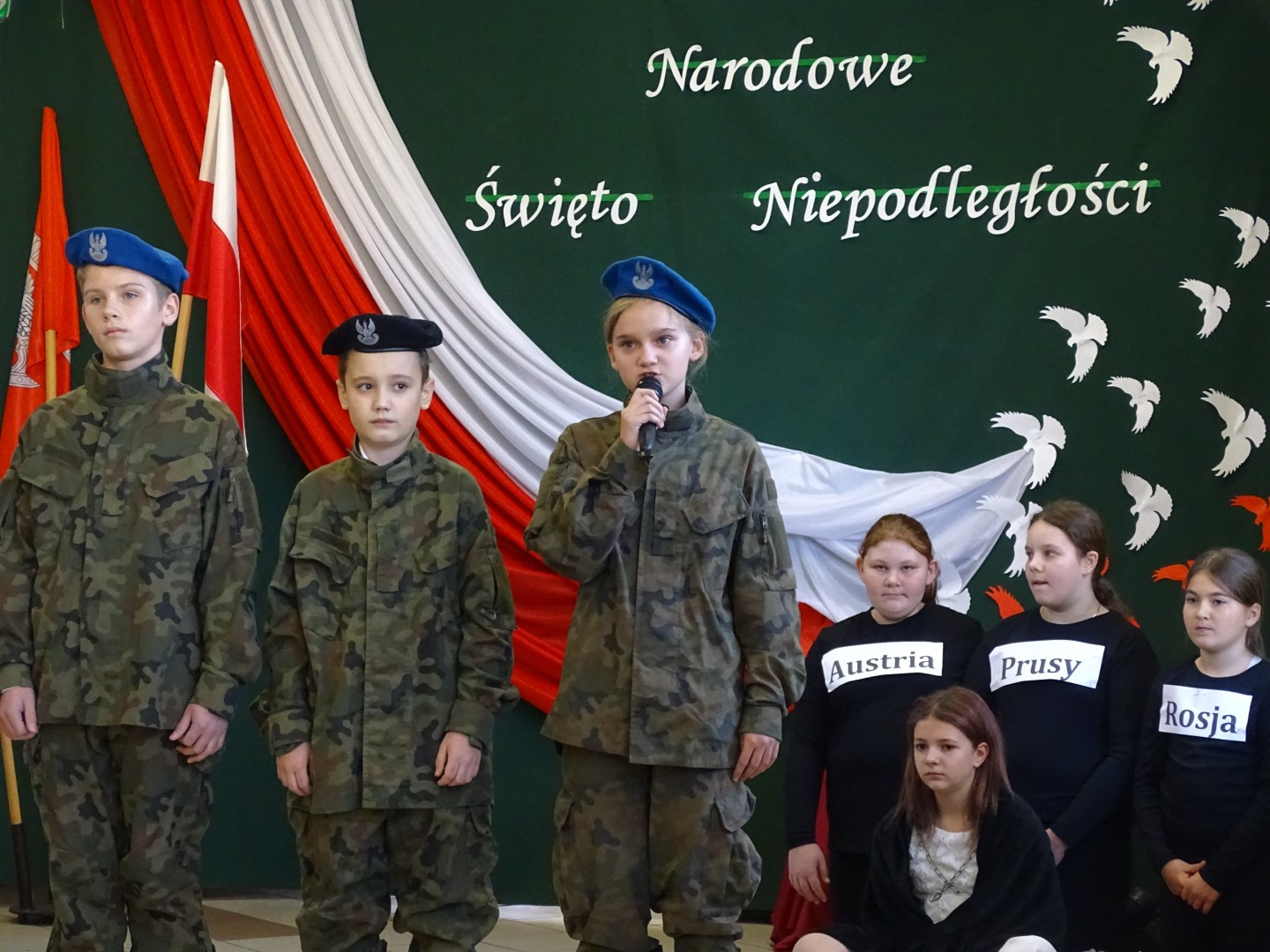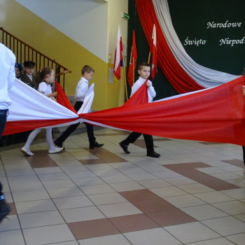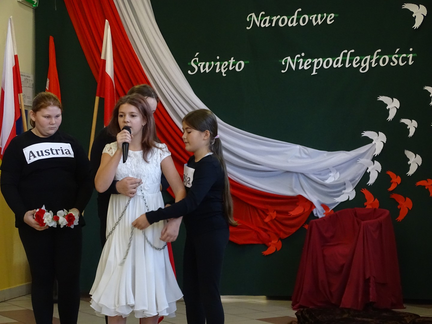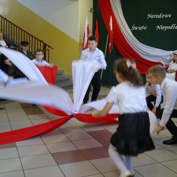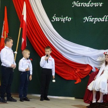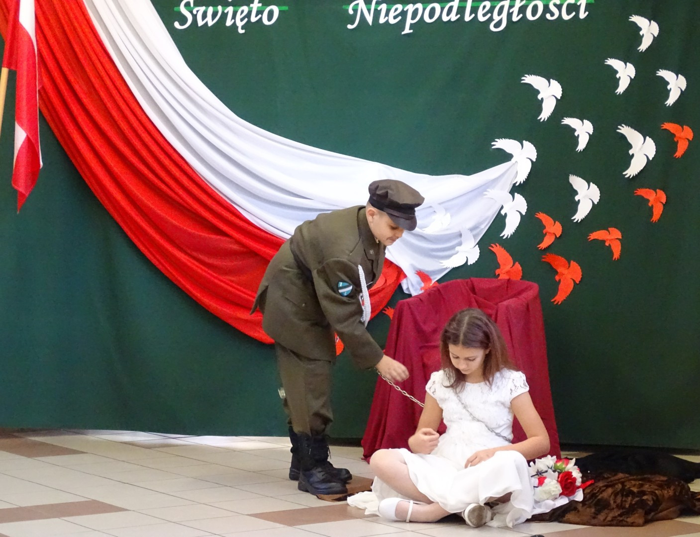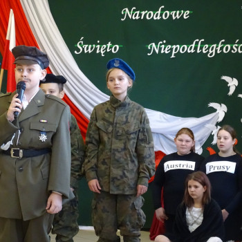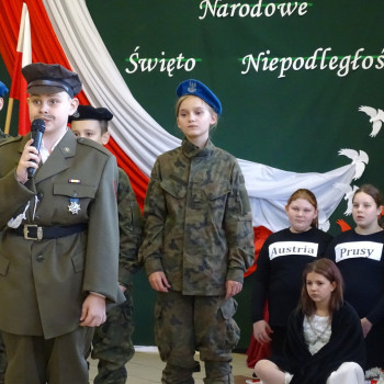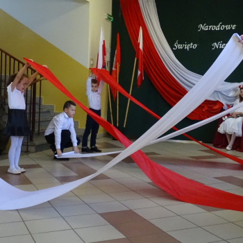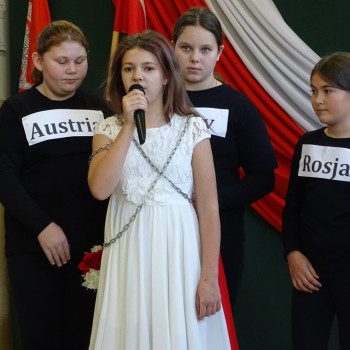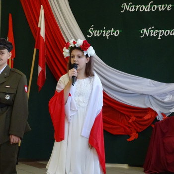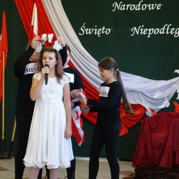 W montażu słowno – wokalno – tanecznym uczniowie naszej szkoły przypomnieli wydarzenia z czasów rozbiorów oraz walki o niepodległość naszego kraju. Młodzi artyści najważniejsze informacje dotyczące, tak ważnych wydarzenia dla naszej ojczyzny przekazali w przystępny i atrakcyjny sposób szczególnie dla najmłodszych uczniów naszej szkoły. Akademia została wzbogacona o piosenki i pieśni patriotyczne a także o przepiękny taniec w wykonaniu uczniów kasy II. Powagi uroczystości nadała także dekoracja, poczet flagowy oraz odświętne stroje i kotyliony narodowe, które mieli wszyscy uczniowie.