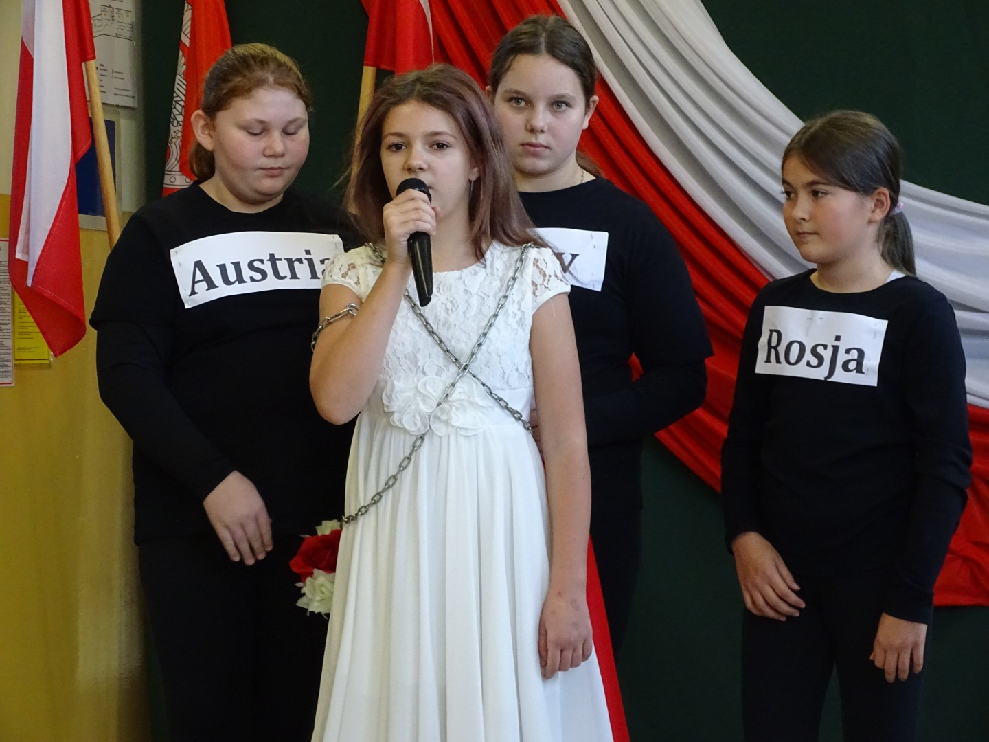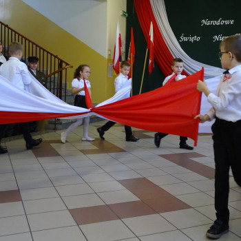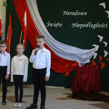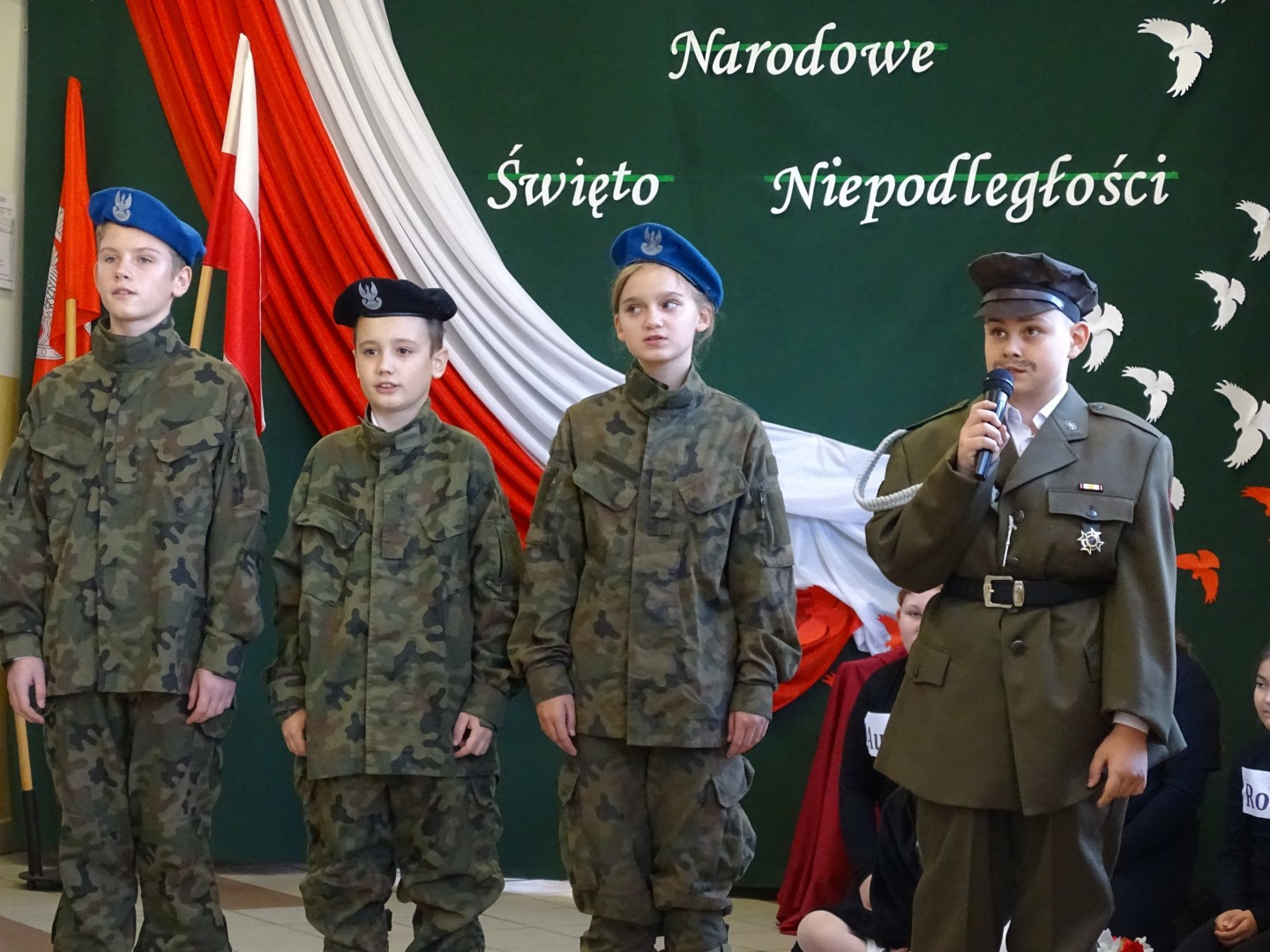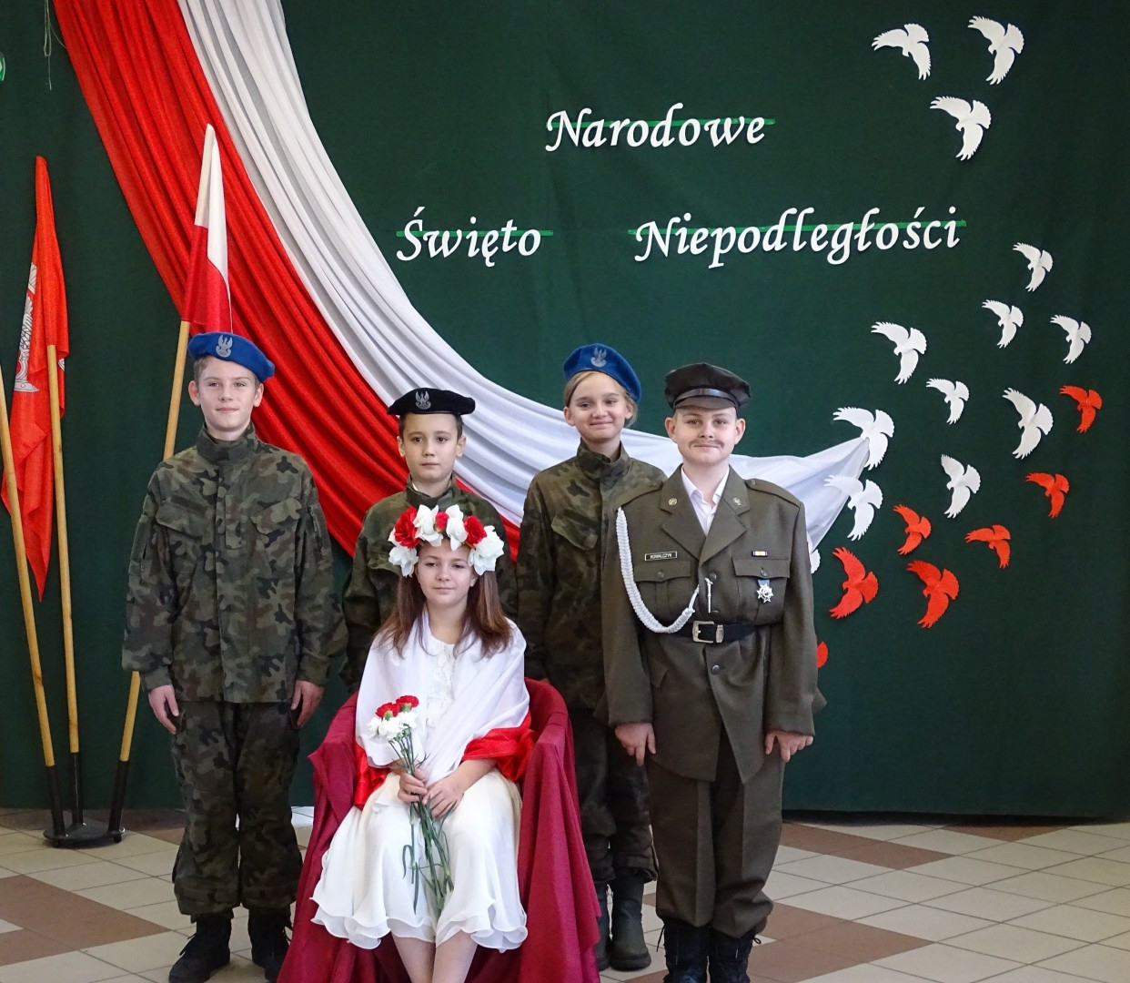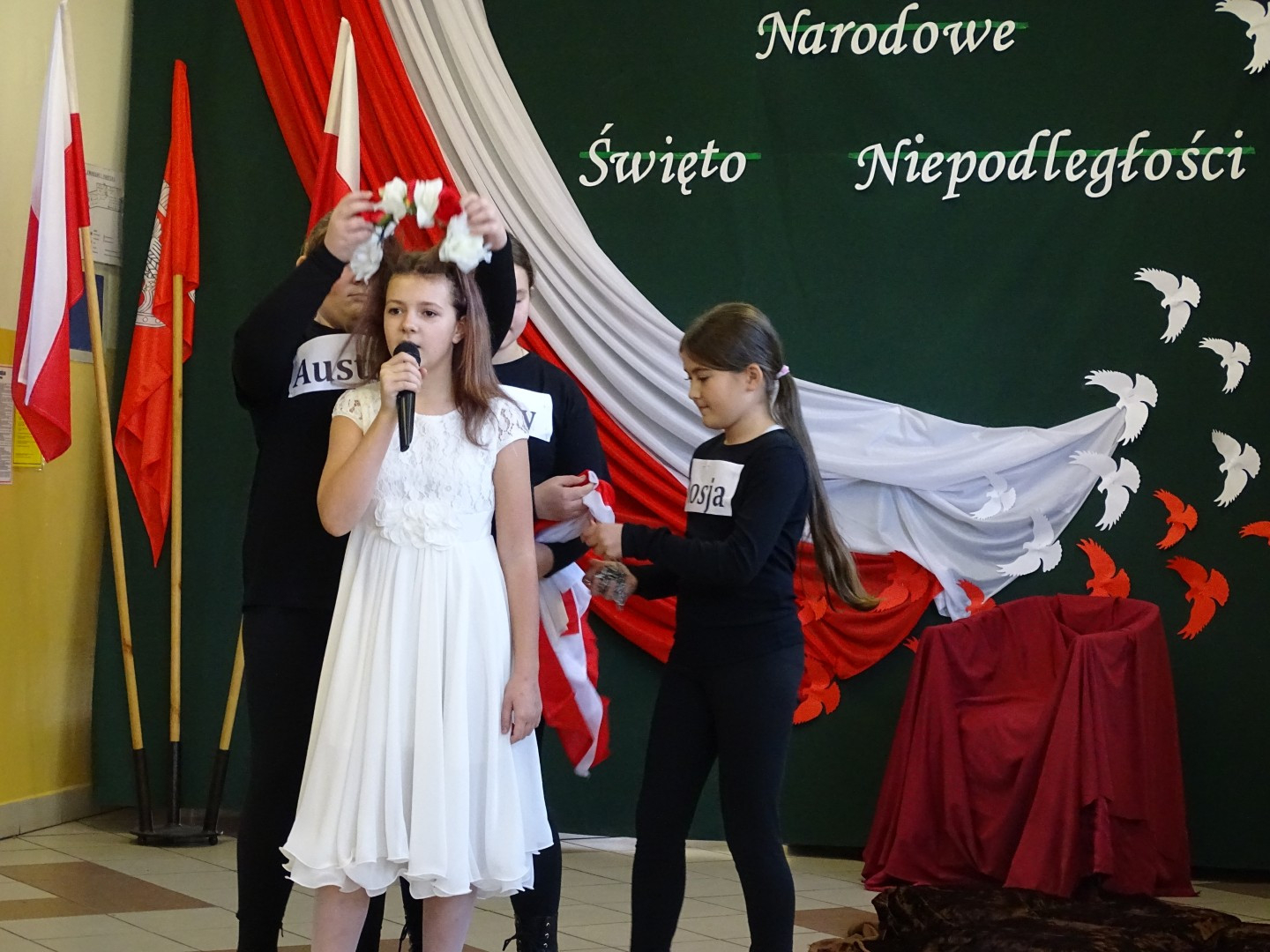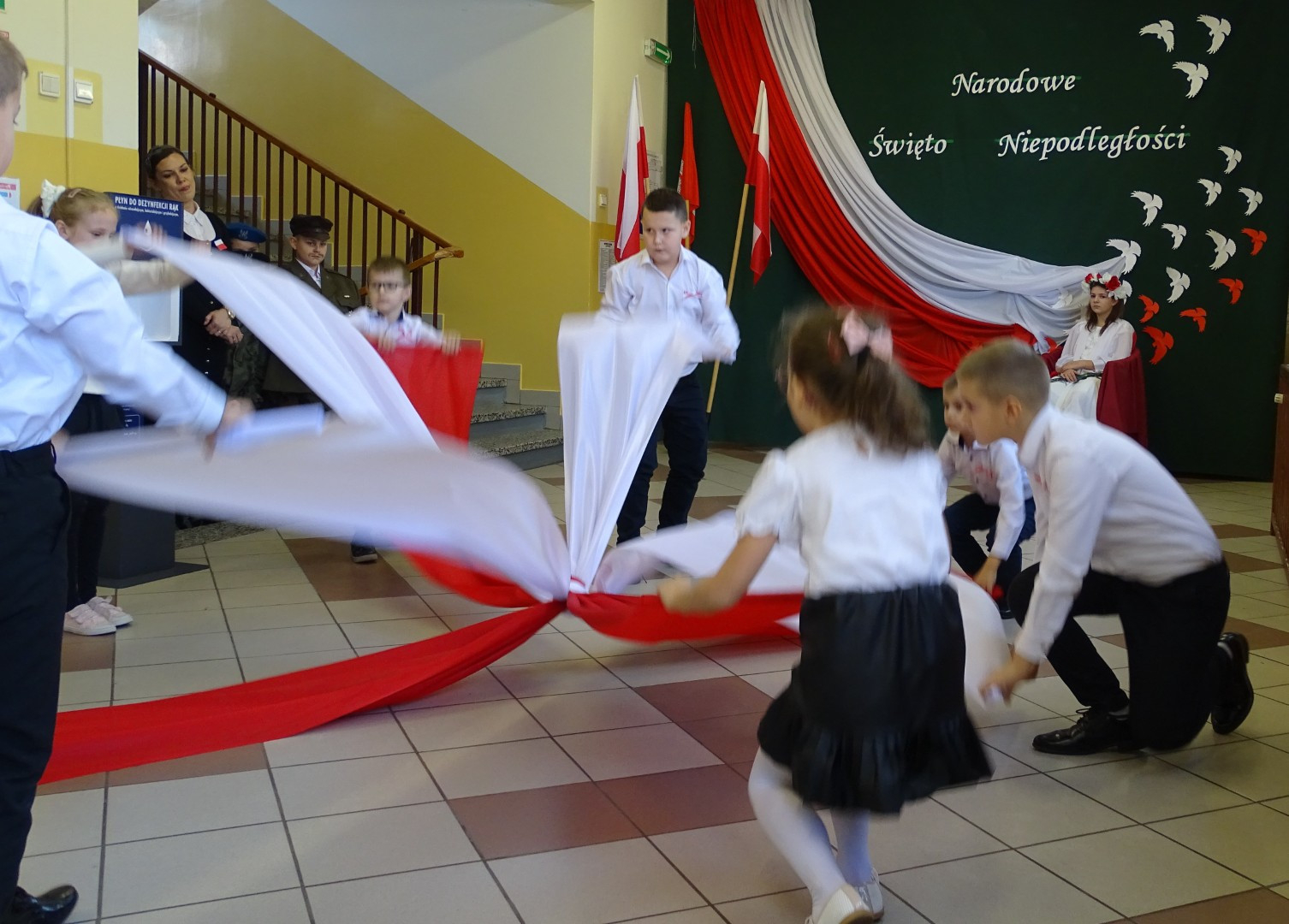 W montażu słowno – wokalno – tanecznym uczniowie naszej szkoły przypomnieli wydarzenia z czasów rozbiorów oraz walki o niepodległość naszego kraju. Młodzi artyści najważniejsze informacje dotyczące, tak ważnych wydarzenia dla naszej ojczyzny przekazali w przystępny i atrakcyjny sposób szczególnie dla najmłodszych uczniów naszej szkoły. Akademia została wzbogacona o piosenki i pieśni patriotyczne a także o przepiękny taniec w wykonaniu uczniów kasy II. Powagi uroczystości nadała także dekoracja, poczet flagowy oraz odświętne stroje i kotyliony narodowe, które mieli wszyscy uczniowie.
