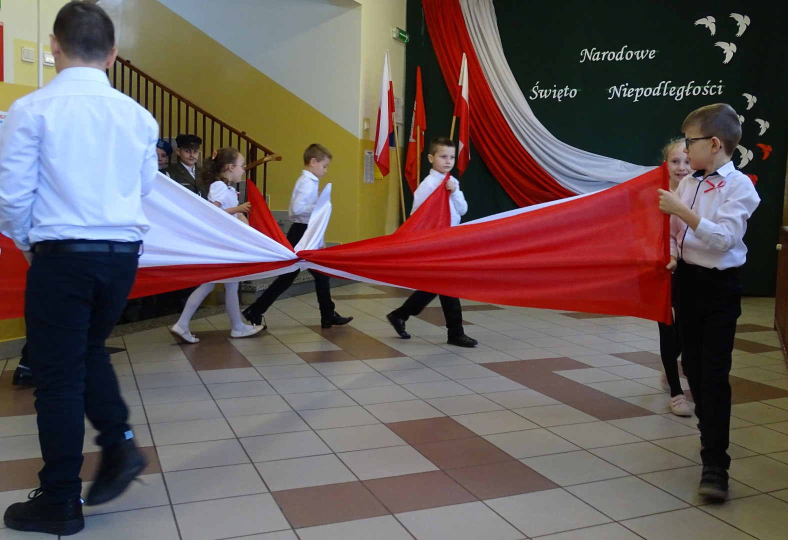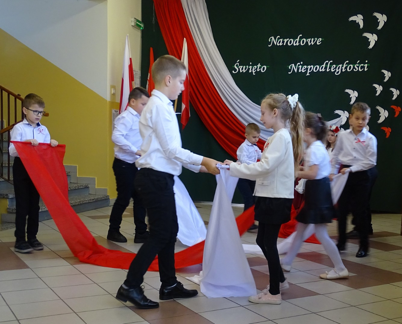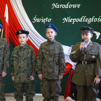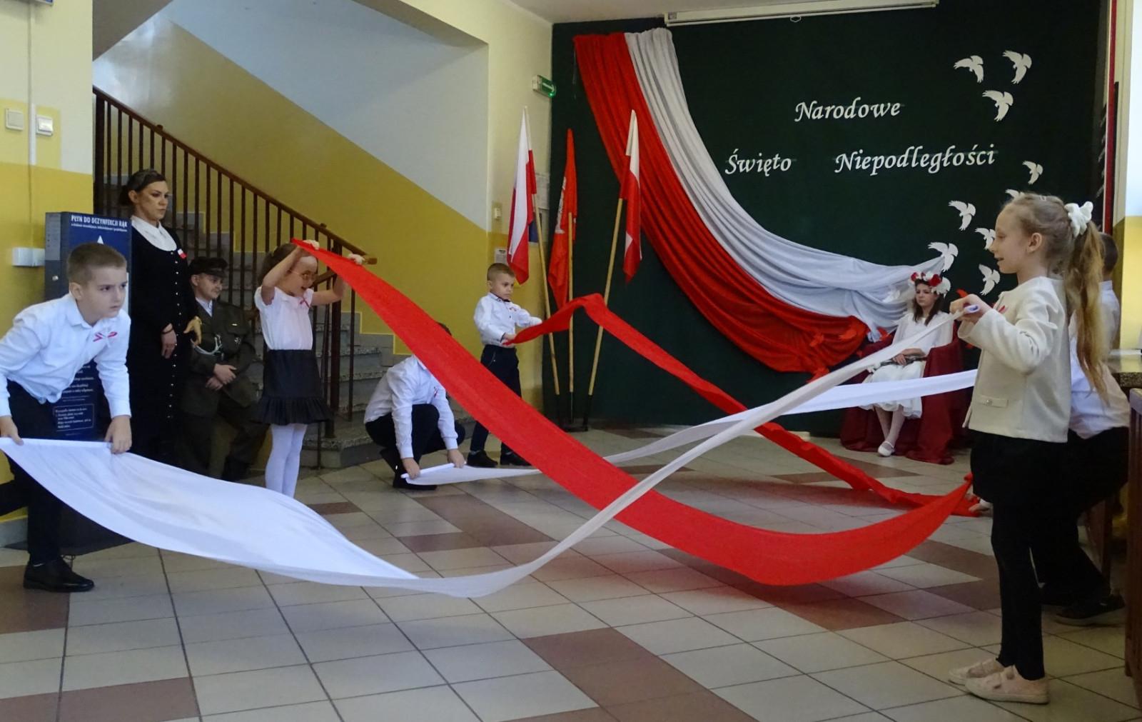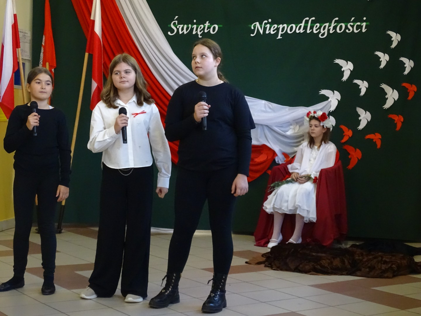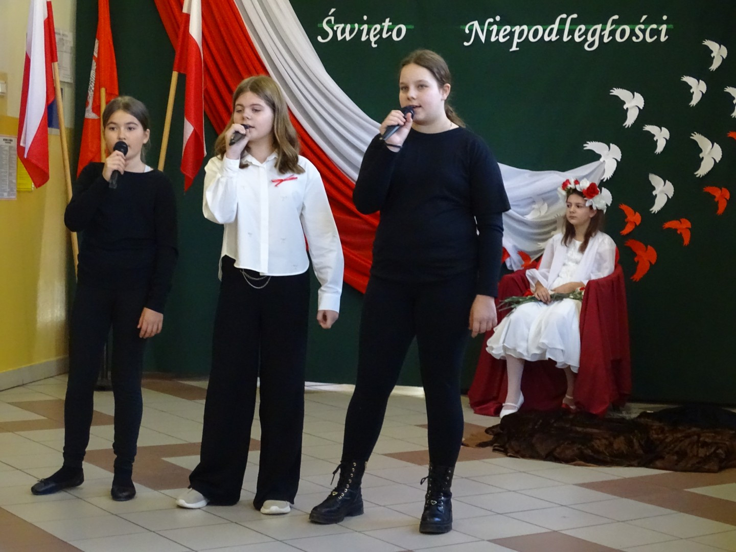 W montażu słowno – wokalno – tanecznym uczniowie naszej szkoły przypomnieli wydarzenia z czasów rozbiorów oraz walki o niepodległość naszego kraju. Młodzi artyści najważniejsze informacje dotyczące, tak ważnych wydarzenia dla naszej ojczyzny przekazali w przystępny i atrakcyjny sposób szczególnie dla najmłodszych uczniów naszej szkoły. Akademia została wzbogacona o piosenki i pieśni patriotyczne a także o przepiękny taniec w wykonaniu uczniów kasy II. Powagi uroczystości nadała także dekoracja, poczet flagowy oraz odświętne stroje i kotyliony narodowe, które mieli wszyscy uczniowie.