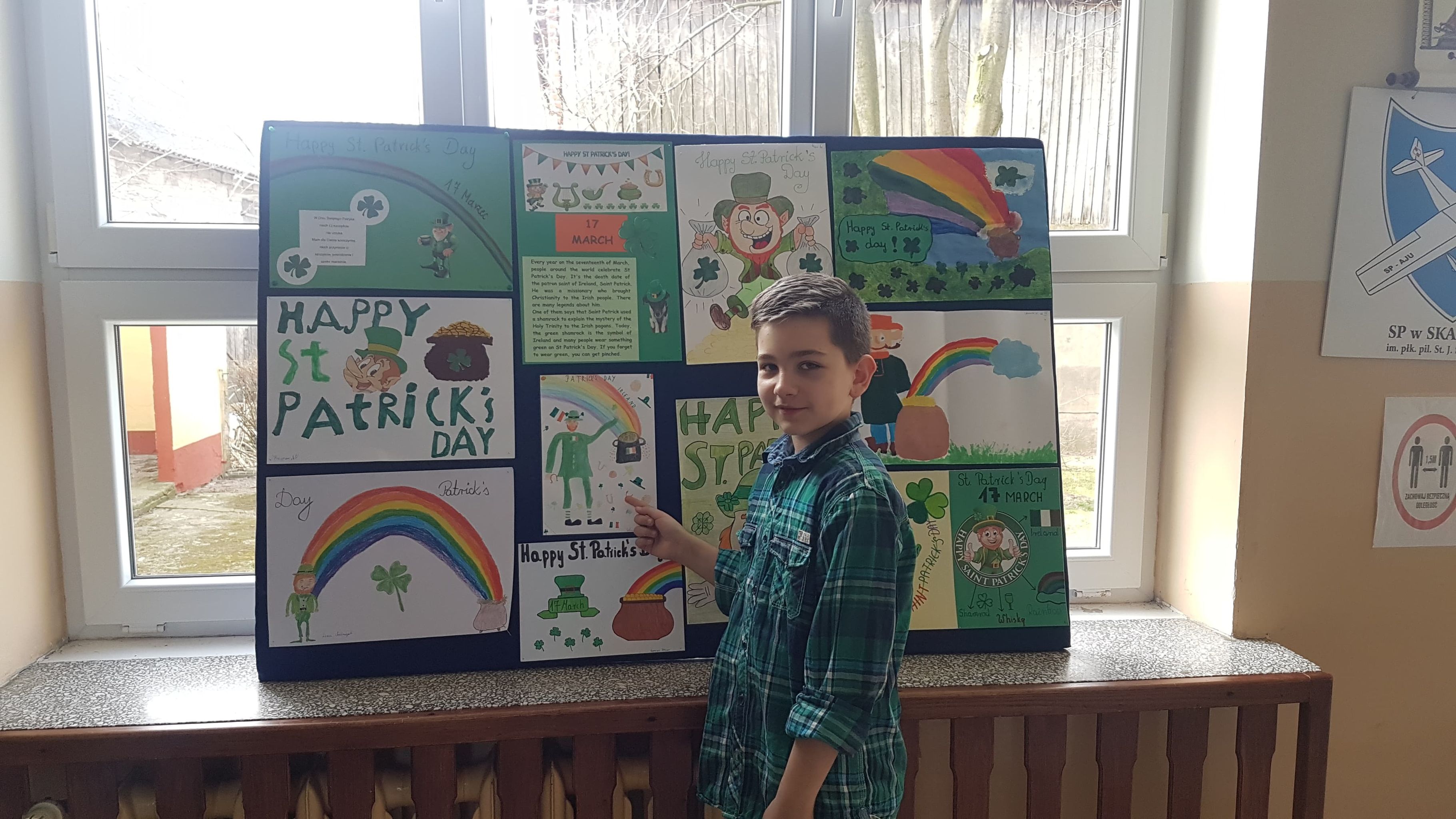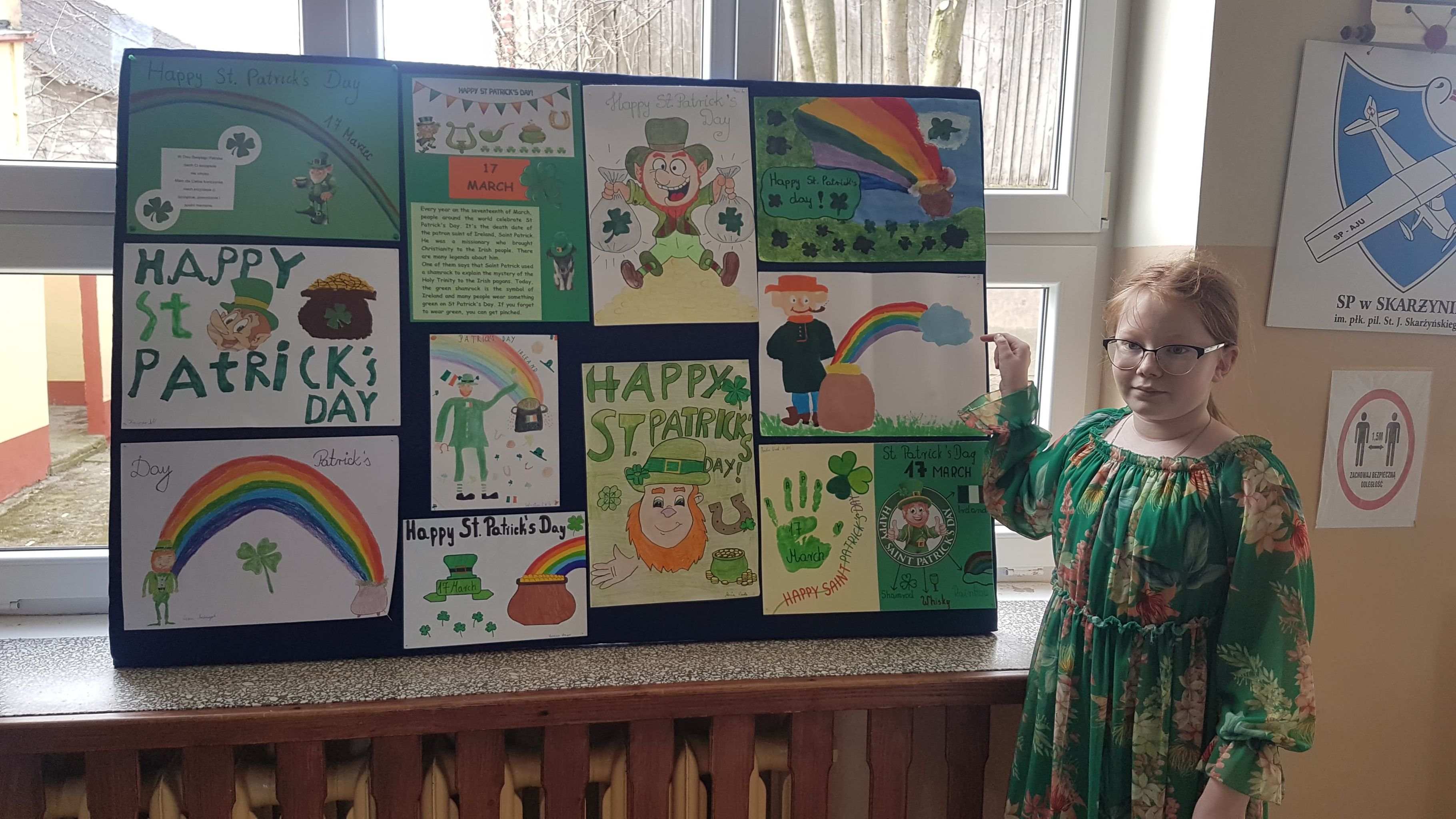 Dzień Świętego Patryka - irlandzkie święto narodowe i religijne obchodzone 17 marca. Jest to święto patrona Irlandii. Na stałe wpisało się w kalendarz wydarzeń szkolnych w Szkole Podstawowej w Skarżynie. W tym dniu dominował kolor zielony. Zgodnie z tradycją kto nie był ubrany na zielono, został uszczypnięty. W klasach młodszych uczniowie kolorowali symbole Irlandii oraz wykonali opaski z koniczynami. W klasach IV-VIII chętni uczniowie wykonali plakaty związane z Dniem Św. Patryka. Na lekcjach języka angielskiego uczniowie poznali fakty dotyczące Św. Patryka oraz grali w gry i zabawy językowe.