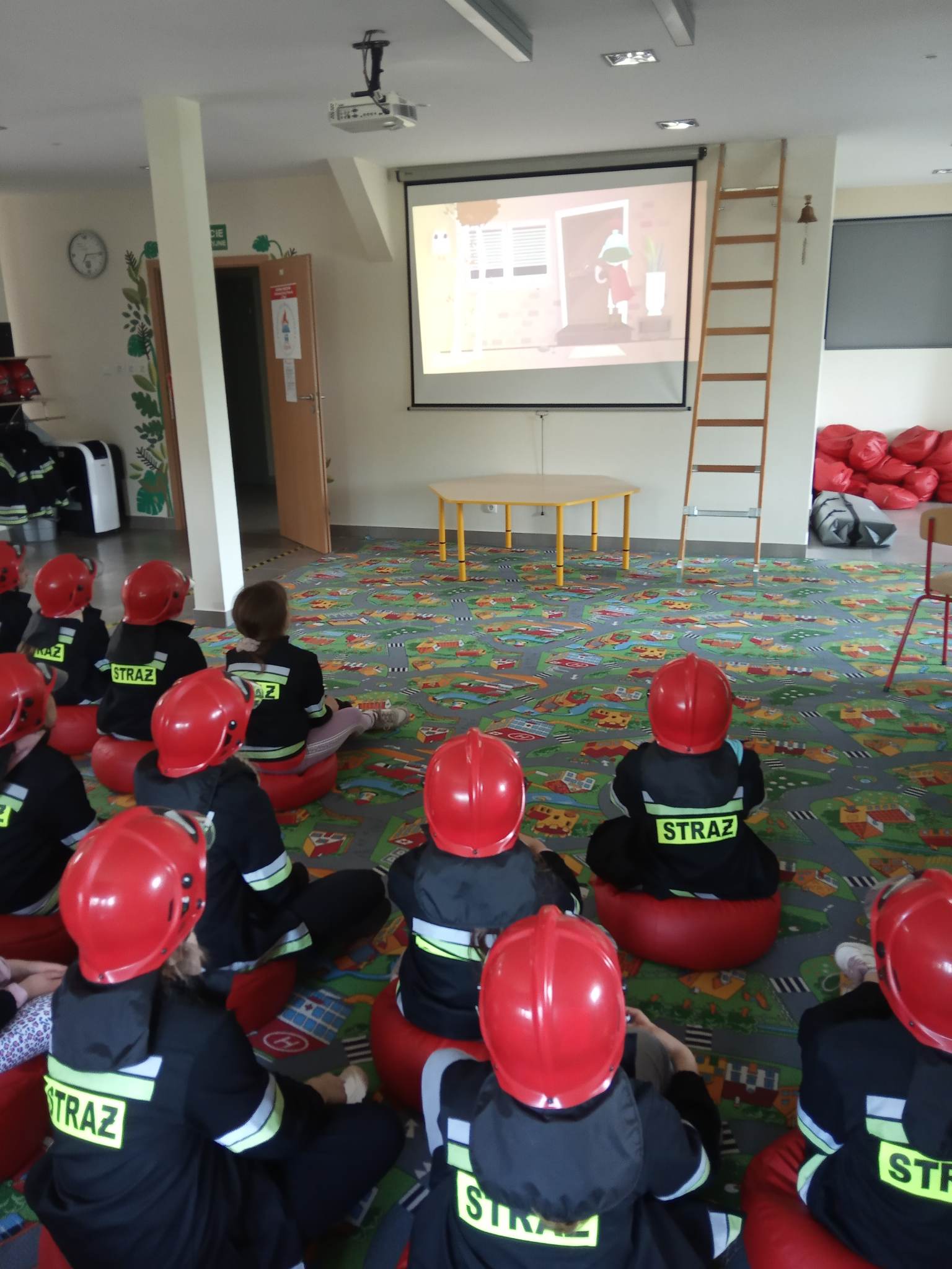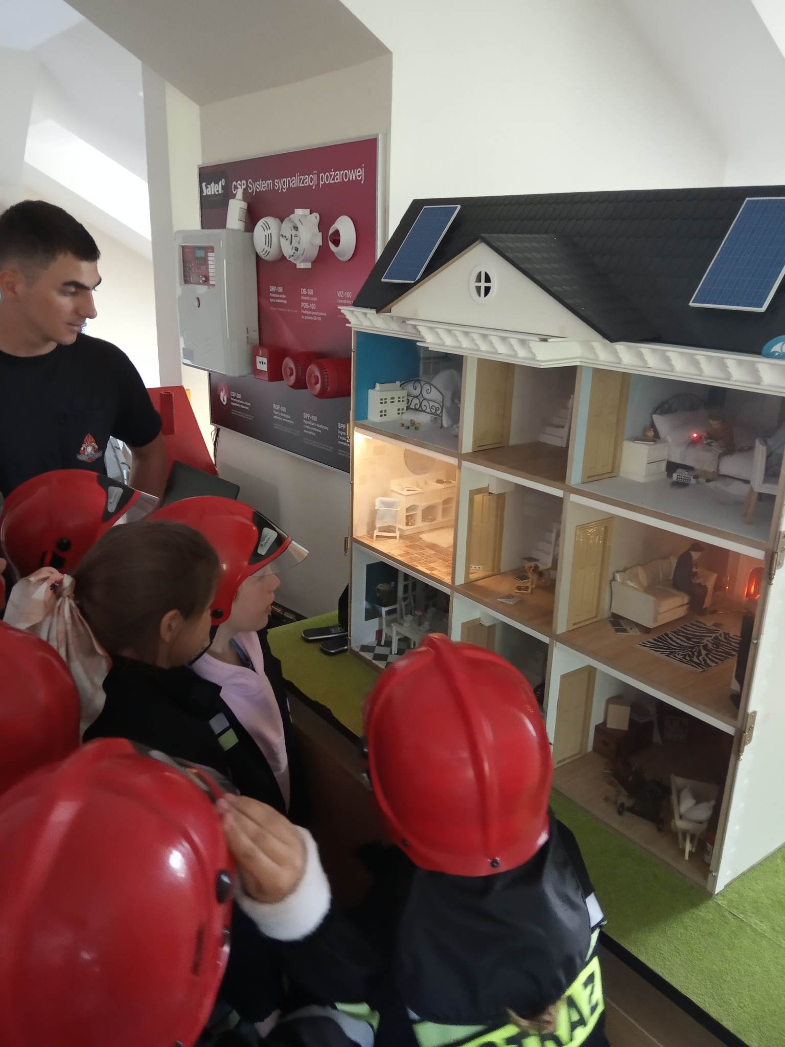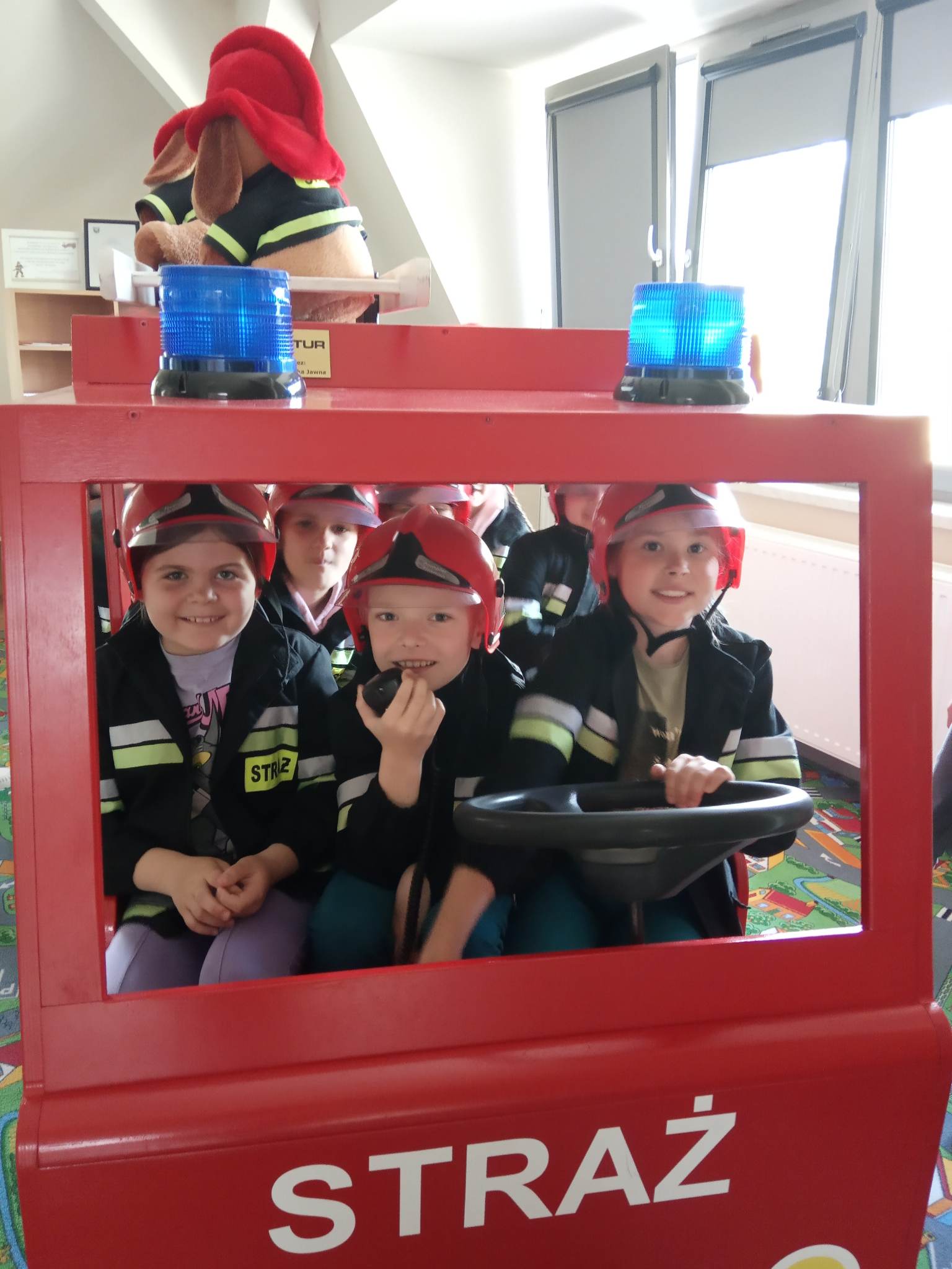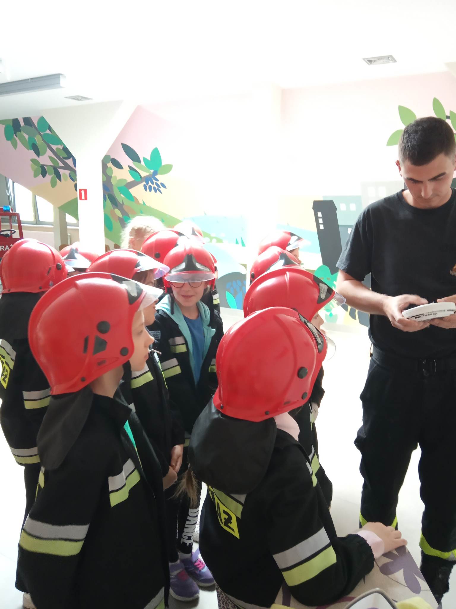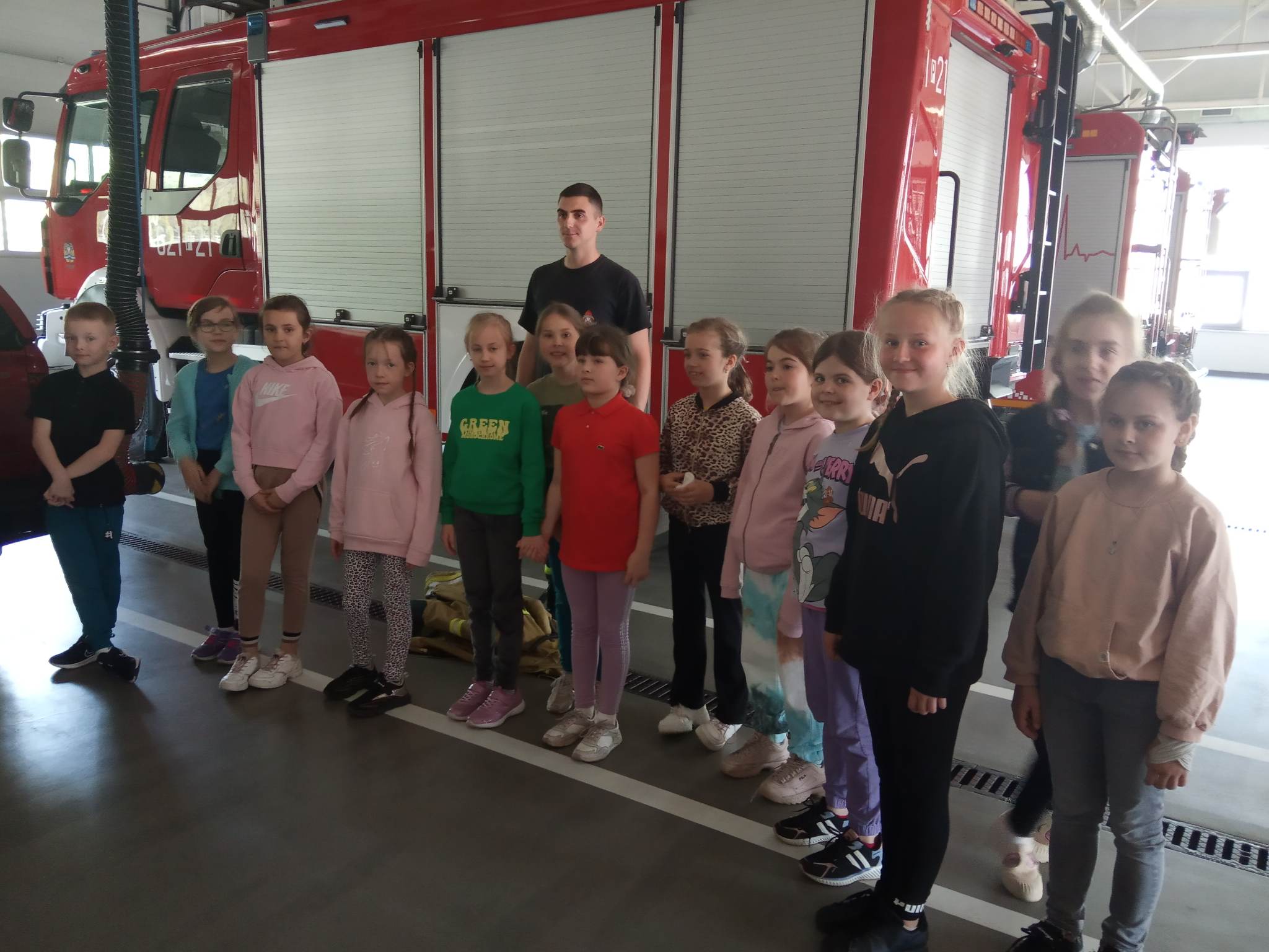 Kolejnym punktem wycieczki były zajęcia w interaktywnej sali edukacyjnej „Ognik”, gdzie specjalnie przeszkoleni funkcjonariusze Państwowej Straży Pożarnej w Turku przeprowadzili warsztaty dotyczące szeroko rozumianego bezpieczeństwa. Interaktywne i bogate wyposażenie sali edukacyjnej pozwoliło na wzbogacenie wiedzy i umiejętności dzieci na temat właściwych sposobów reagowania w sytuacjach niebezpiecznych dla życia i zdrowia. Dzieci utrwaliły sobie takie umiejętności jak: prawidłowe zgłoszenie zdarzeń, podstawy pierwszej pomocy oraz zasady właściwej ewakuacji. Miały również możliwość zobaczyć centrum dowodzenia oraz wszystkie pojazdy znajdujące się na wyposażeniu Państwowej Straży Pożarnej w Turku. Po spotkaniu ze strażakami udaliśmy się na posiłek.