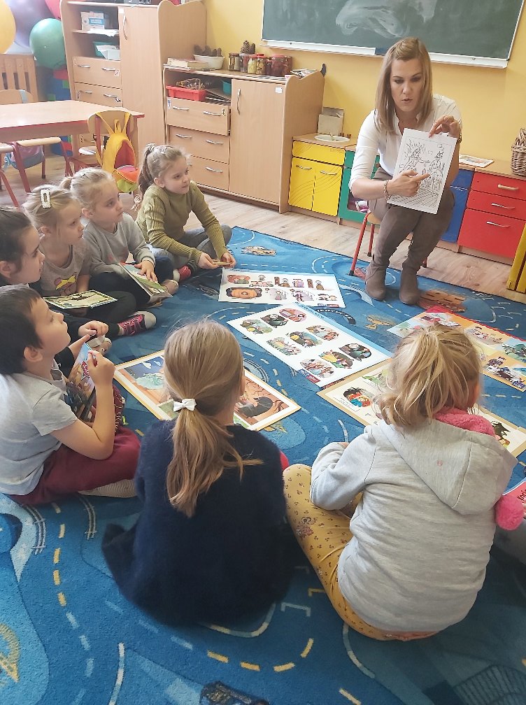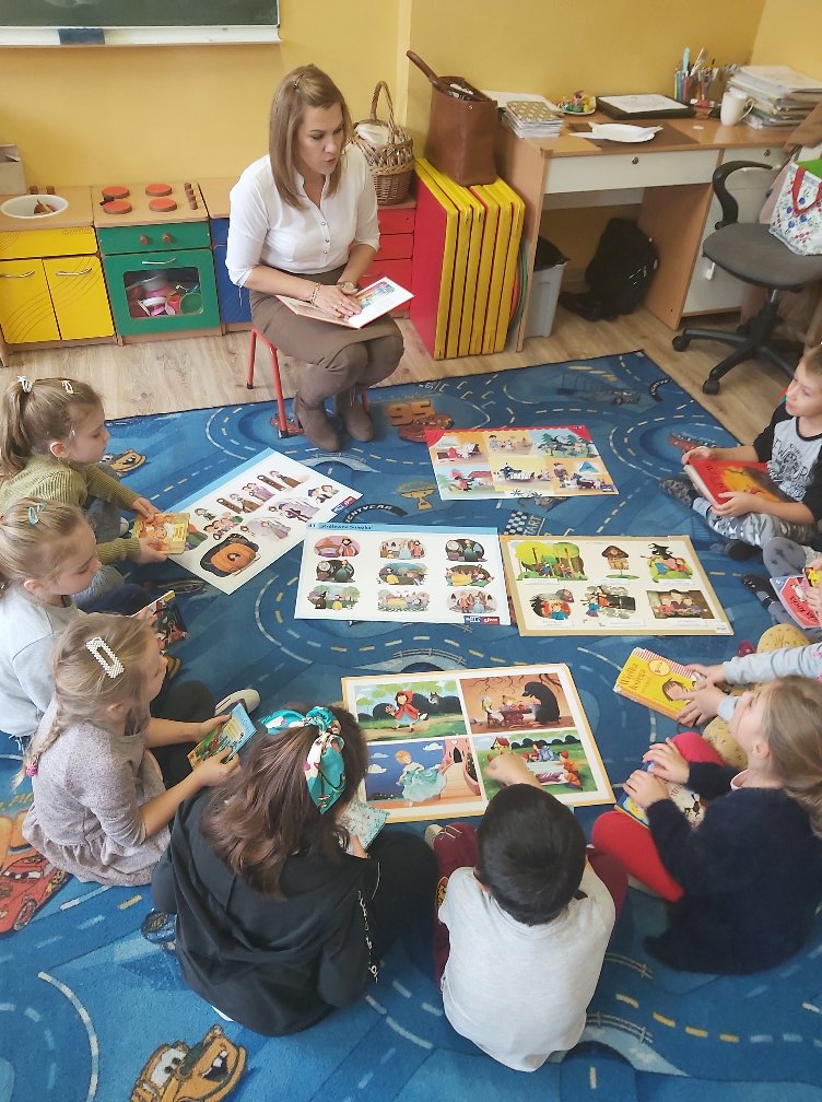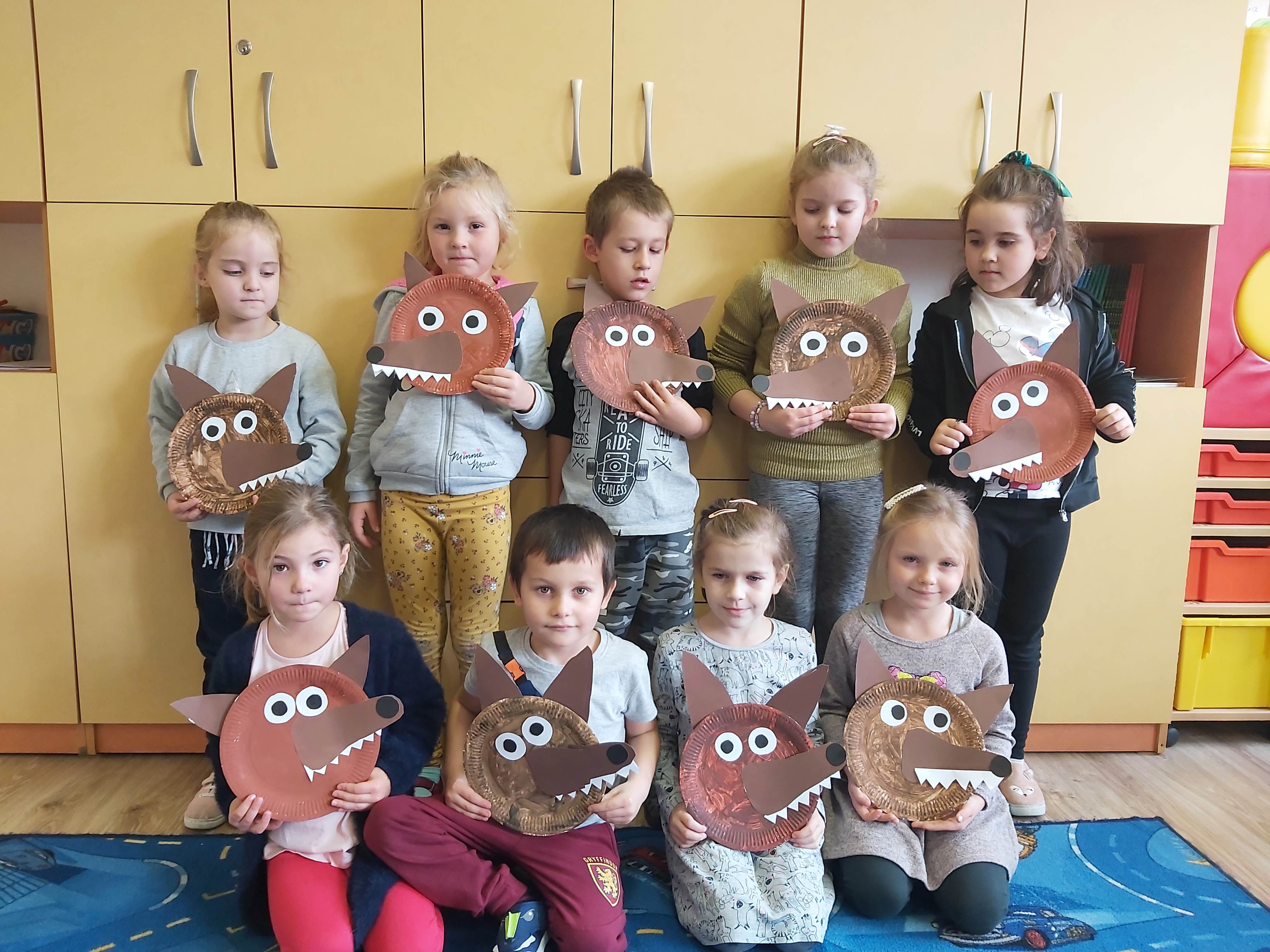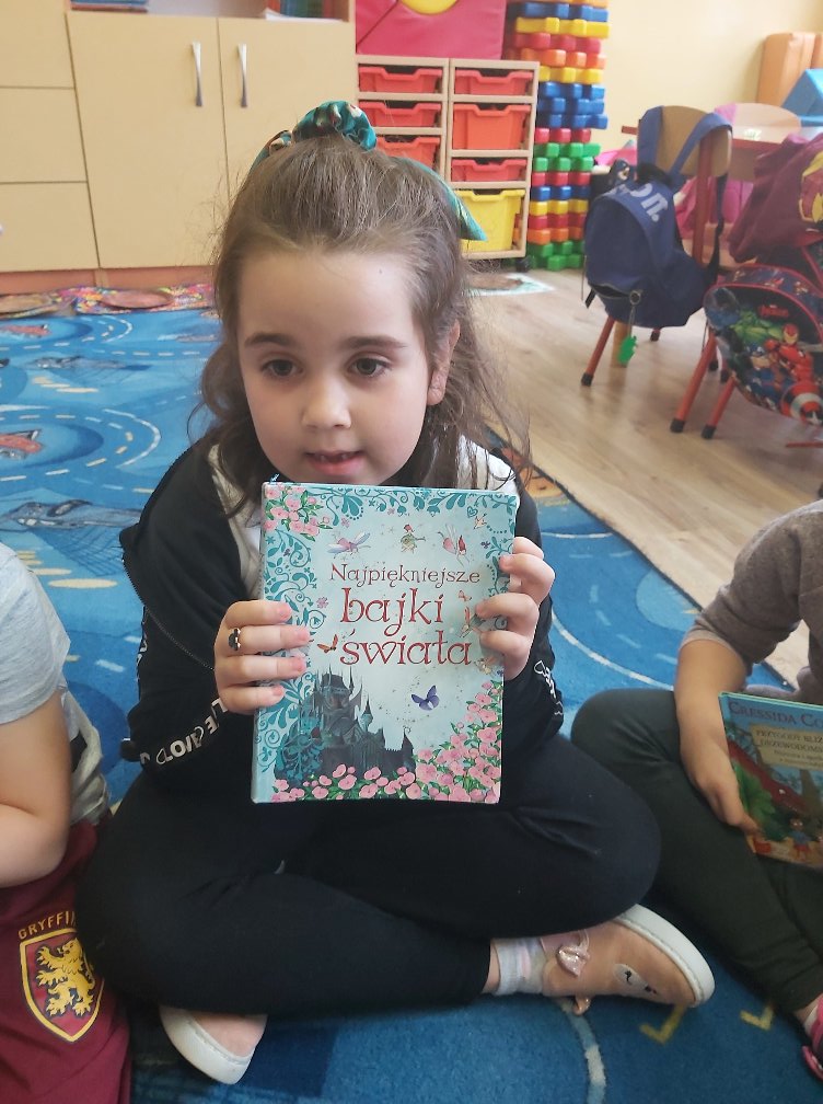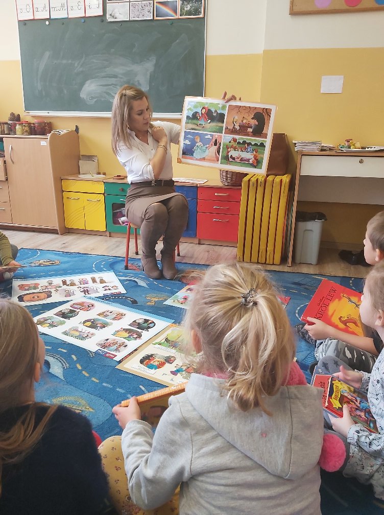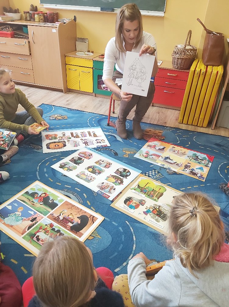 Z tej okazji przedszkolaki - zarówno starszaki jaki i maluszki wzięły udział w bajkowym spotkaniu, podczas którego opowiadały o swoich ulubionych bajkowych postaciach oraz oglądały książki z bajkami, które przyniosły. Wspólnie obejrzały również bajkę „Czerwony Kapturek” i wykonały pracę plastyczną „Wilk”. Podczas wielu zabaw dzieci wykazały się znajomością treści bajek, tych znanych i mniej znanych, m.in. dzieci rozwiązywały zagadki, rozpoznawały bajkę po rekwizycie oraz po przeczytaniu fragmentu książki, oglądały prezentację multimedialną prezentującą różne bajki. Wspólnie śpiewały i tańczyły do znanych utworów muzycznych pochodzących z bajek.