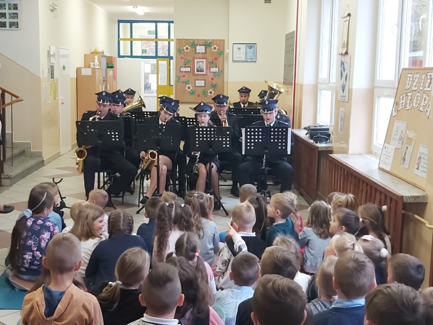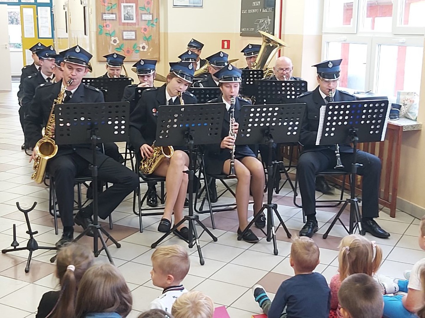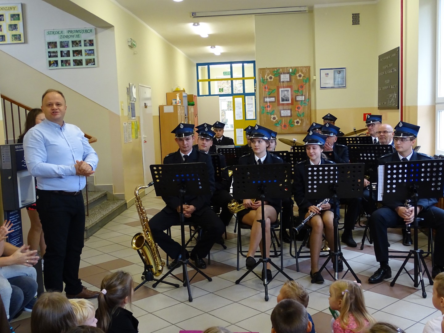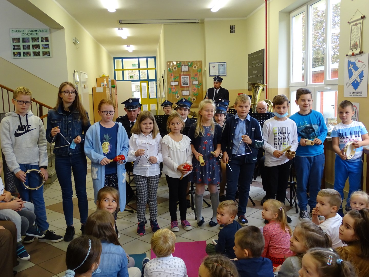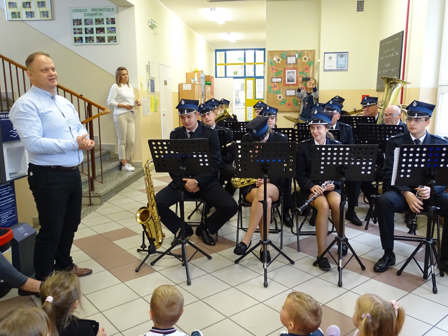 Dnia 30 września 2021 roku w naszej szkole odbyła się ,,Nietypowa lekcja muzyki’’ przeprowadzona w ramach realizowanego projektu przez Orkiestrę Dętą działającą przy OSP w Tokarach pod batutą p. Adriana Wałowskiego. Podczas przygotowanego programu kierownik zespołu p. Amadeusz Dzikowski opowiedział o zakresie działalności zespołu, przedstawił członków orkiestry oraz zaprezentował poszczególne instrumenty. Ponadto uczniowie i nauczyciele wysłuchali koncertu przygotowanego na tę okazję. Występ zespołu dostarczył dużo radości i był niewątpliwie ważnym elementem w muzycznej edukacji dzieci. Poszczególni uczniowie mieli bowiem okazję zagrać razem z orkiestrą kilka utworów. Podsumowaniem i sprawdzeniem zdobytej wiedzy podczas występu były konkursy oraz nagrody w formie słodkiego upominku. Na zakończenie uczniowie podziękowali gromkimi brawami za występ. Nie obyło się bez zaproszenia na kolejny koncert. Radość dzieci i zaangażowanie w tę niecodzienną lekcję w szkole przełoży się niewątpliwie na rozbudzenie muzycznych zainteresowań uczniów. Kierownik i kapelmistrz orkiestry zaprosili uczniów, którzy wyrażają zainteresowania muzyczne i chcą podjąć się nauki gry na instrumencie na czwartkowe próby orkiestry do sali OSP w Tokarach. Warto dodać, iż to niecodzienne wydarzenie miało miejsce w Dzień Chłopca oraz w przeddzień Światowego Dnia Muzyki, który przypada na pierwszego października