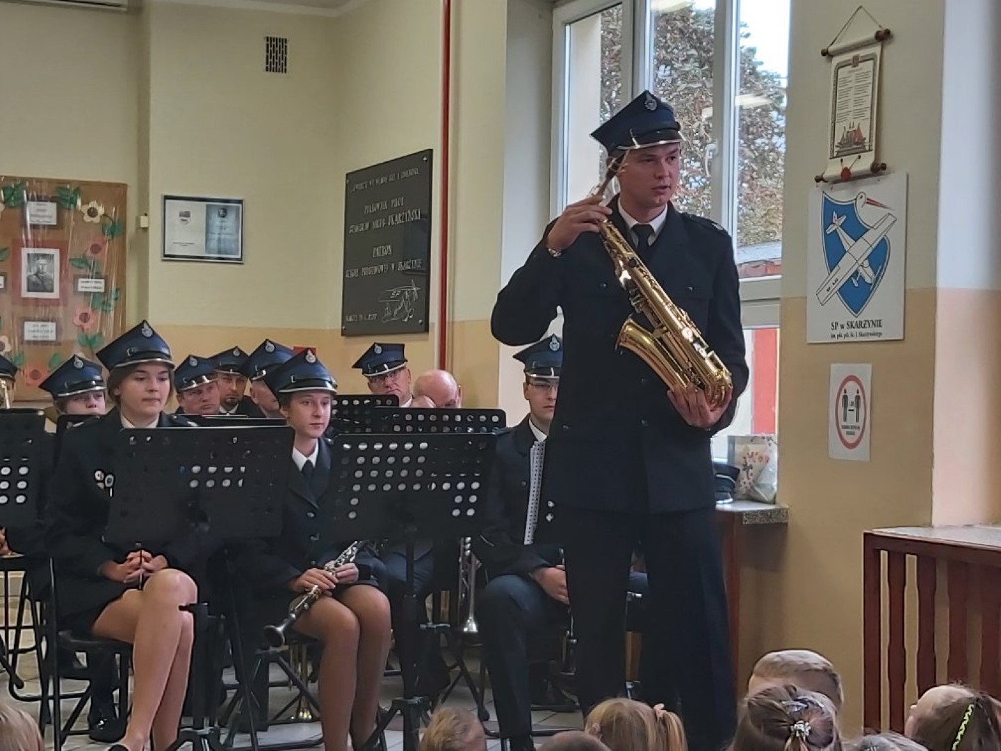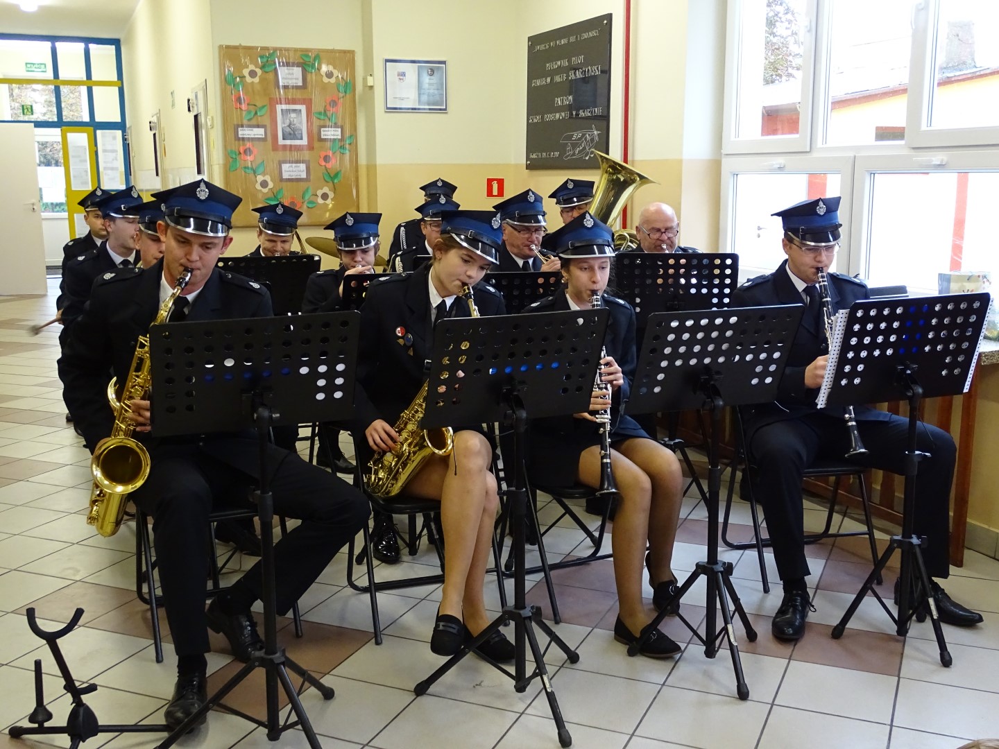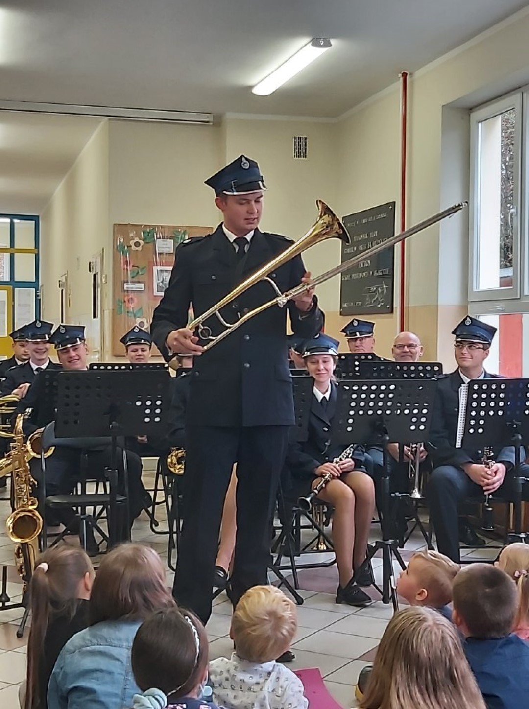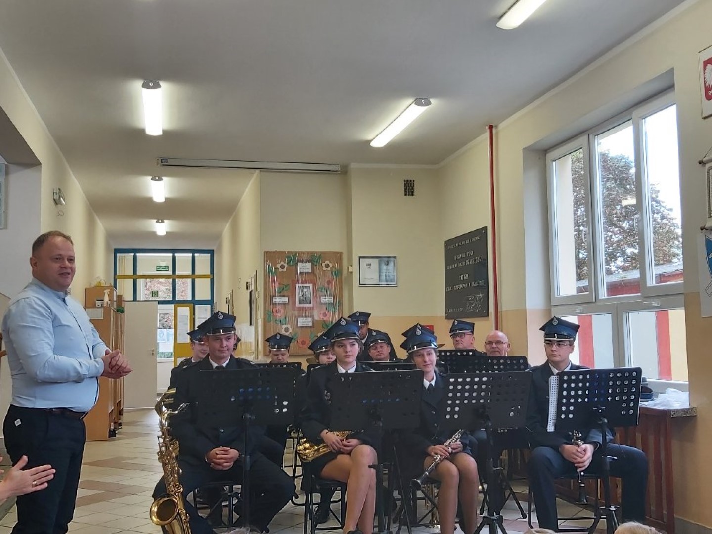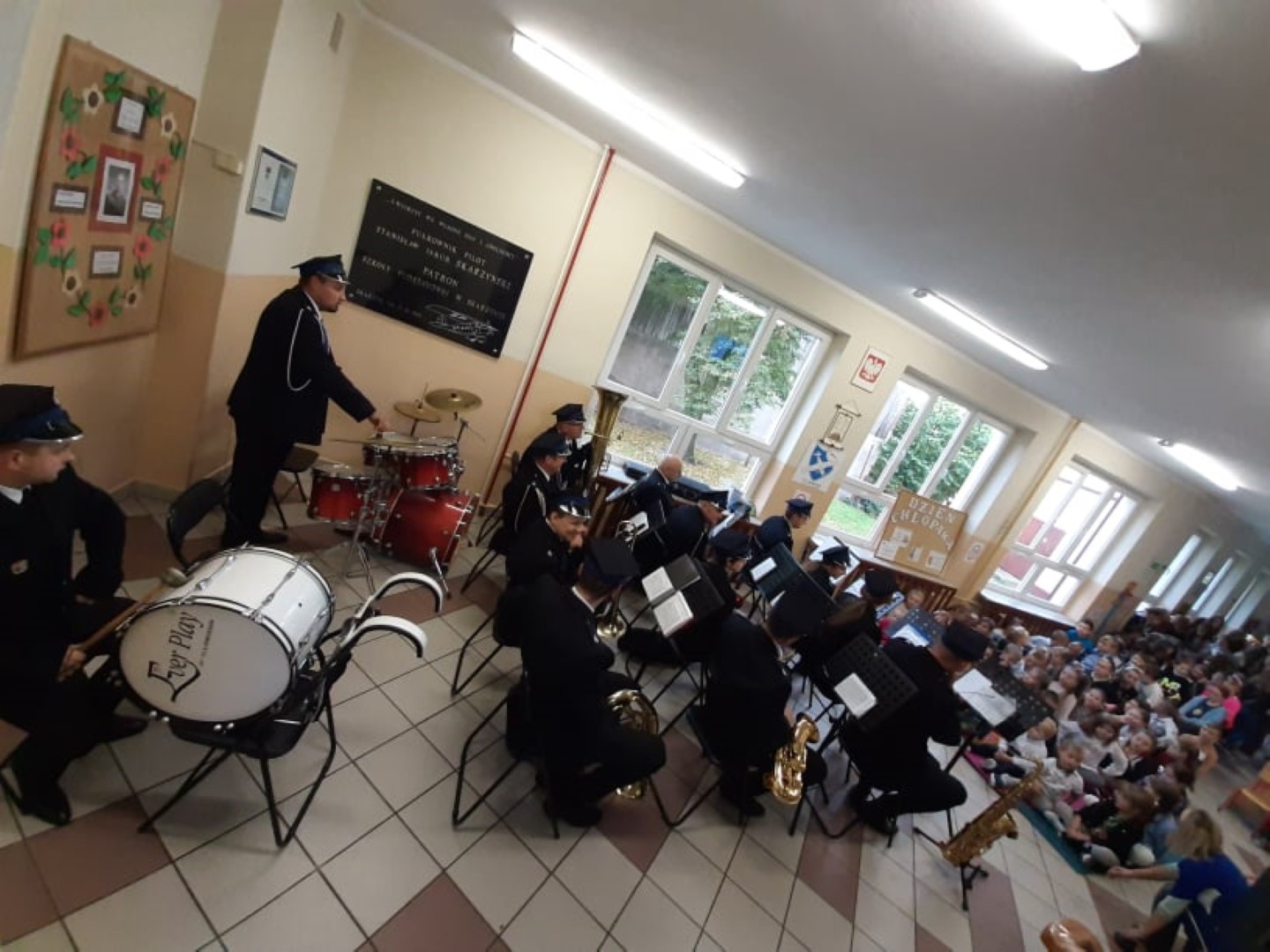 Dnia 30 września 2021 roku w naszej szkole odbyła się ,,Nietypowa lekcja muzyki’’ przeprowadzona w ramach realizowanego projektu przez Orkiestrę Dętą działającą przy OSP w Tokarach pod batutą p. Adriana Wałowskiego. Podczas przygotowanego programu kierownik zespołu p. Amadeusz Dzikowski opowiedział o zakresie działalności zespołu, przedstawił członków orkiestry oraz zaprezentował poszczególne instrumenty. Ponadto uczniowie i nauczyciele wysłuchali koncertu przygotowanego na tę okazję. Występ zespołu dostarczył dużo radości i był niewątpliwie ważnym elementem w muzycznej edukacji dzieci. Poszczególni uczniowie mieli bowiem okazję zagrać razem z orkiestrą kilka utworów. Podsumowaniem i sprawdzeniem zdobytej wiedzy podczas występu były konkursy oraz nagrody w formie słodkiego upominku. Na zakończenie uczniowie podziękowali gromkimi brawami za występ. Nie obyło się bez zaproszenia na kolejny koncert. Radość dzieci i zaangażowanie w tę niecodzienną lekcję w szkole przełoży się niewątpliwie na rozbudzenie muzycznych zainteresowań uczniów. Kierownik i kapelmistrz orkiestry zaprosili uczniów, którzy wyrażają zainteresowania muzyczne i chcą podjąć się nauki gry na instrumencie na czwartkowe próby orkiestry do sali OSP w Tokarach. Warto dodać, iż to niecodzienne wydarzenie miało miejsce w Dzień Chłopca oraz w przeddzień Światowego Dnia Muzyki, który przypada na pierwszego października