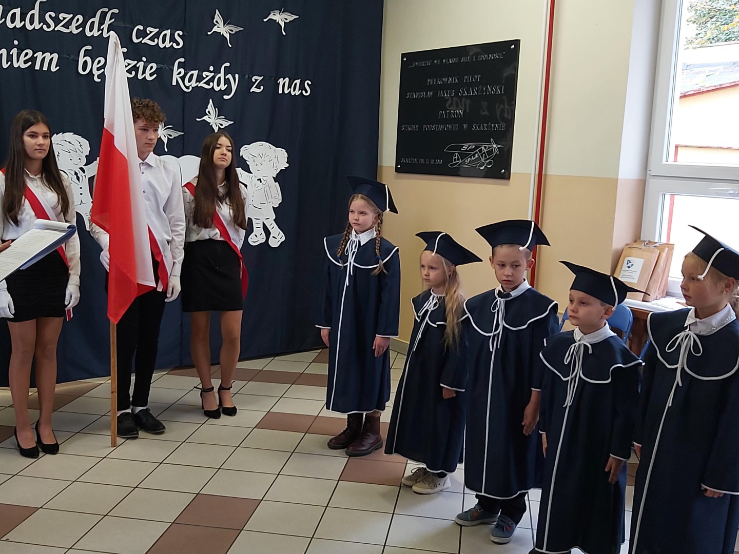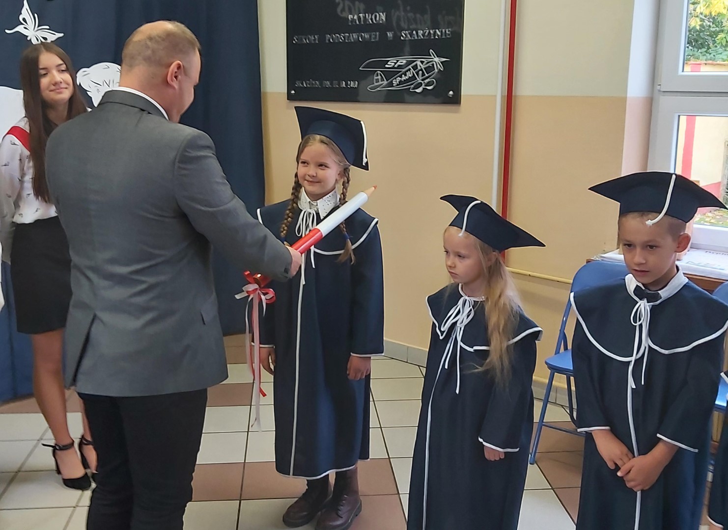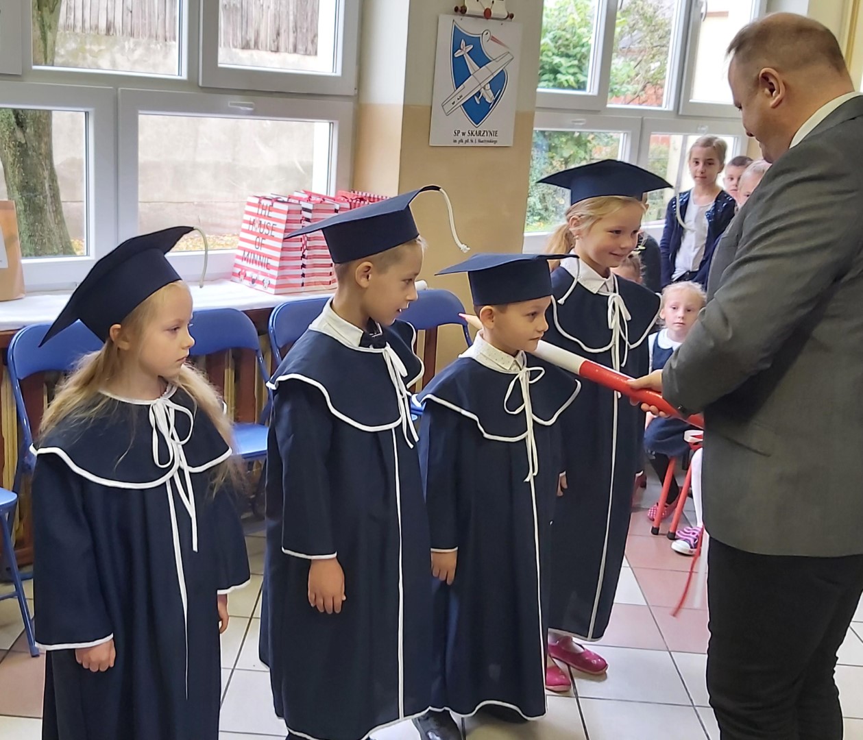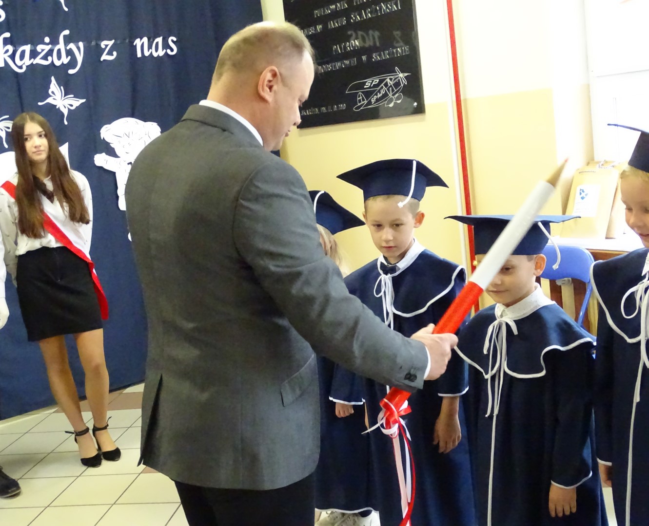 Po złożeniu ślubowania każdy z pierwszoklasistów został pasowany przez dyrektora szkoły p. Krzysztofa Jesionka  na ucznia Szkoły Podstawowej im. płk. pil. St. J. Skarżyńskiego w Skarżynie. Od tej chwili stali się oni nowymi członkami naszej szkolnej społeczności.