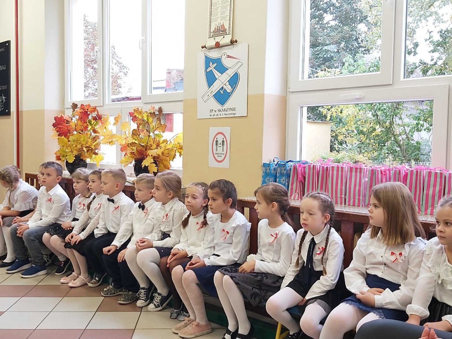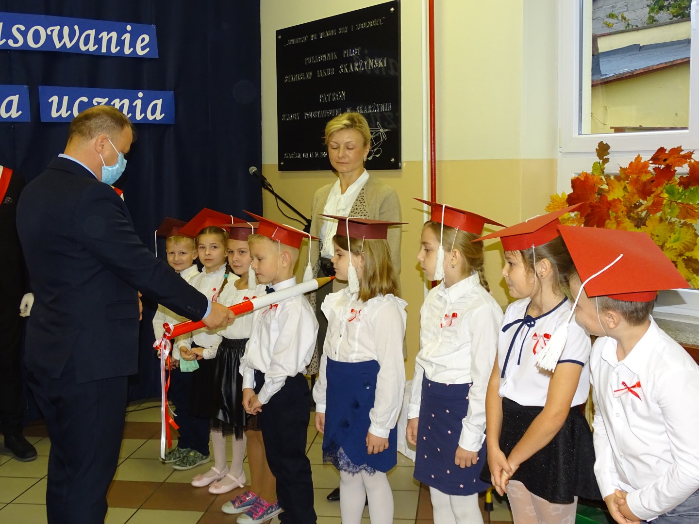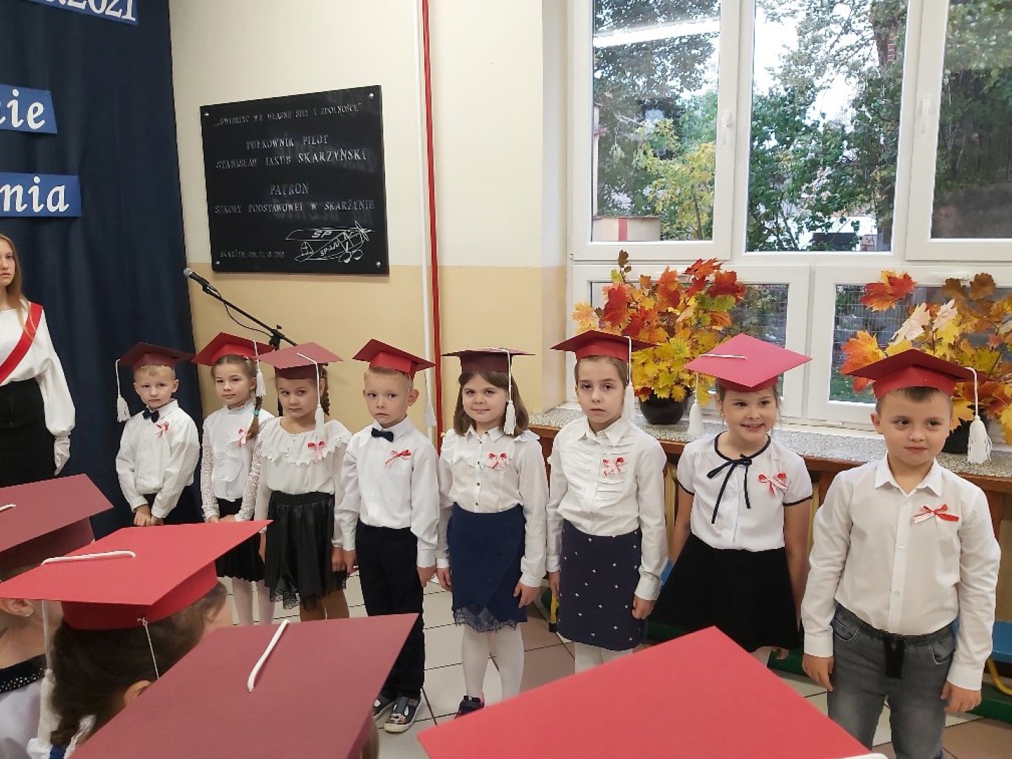 21 października 2021r. najmłodsi uczniowie Szkoły Podstawowej im. płk. pil. Stanisława Jakuba Skarżyńskiego w Skarżynie brali udział w bardzo ważnym i podniosłym dla nich wydarzeniu. W obecności rodziców, nauczycieli, zaproszonych gości, przedstawicieli Samorządu Uczniowskiego, pierwszoklasiści ślubowali być dobrymi Polakami, uczniami, kolegami i dziećmi dla swoich rodziców. Po ślubowaniu rodzice dzieci złożyli przyrzeczenie. W kolejnym punkcie uroczystości dyrektor szkoły pan Krzysztof Jesionek pasował pierwszoklasistów na uczniów skarżyńskiej szkoły. Po pasowaniu uczniowie z klasy I przedstawili bogaty i ciekawy program artystyczny, w którym wspaniale zaprezentowali swoje umiejętności i talenty. Dzieci otrzymały życzenia, gratulacje i upominki od zaproszonych gości: pana Jana Nowaka - Wójta Gminy Kawęczyn, pani Jolanty Cajdler - przedstawicielki Rejonowego Banku Spółdzielczego w Malanowie, pani Róży Froncali – przewodniczącej Rady Rodziców, księdza Piotra Bamberskiego – proboszcza parafii w Przespolewie oraz rodziców, którym serdecznie dziękujemy za ogromne zaangażowanie w przygotowanie uroczystości.