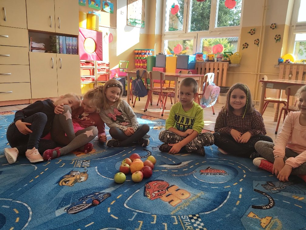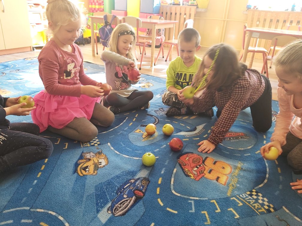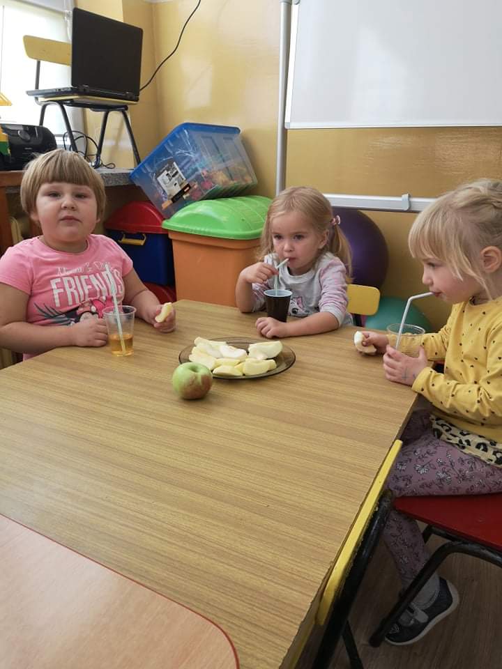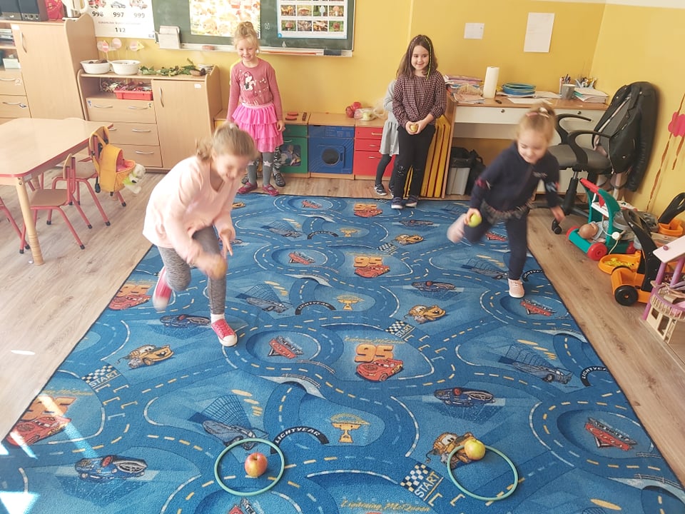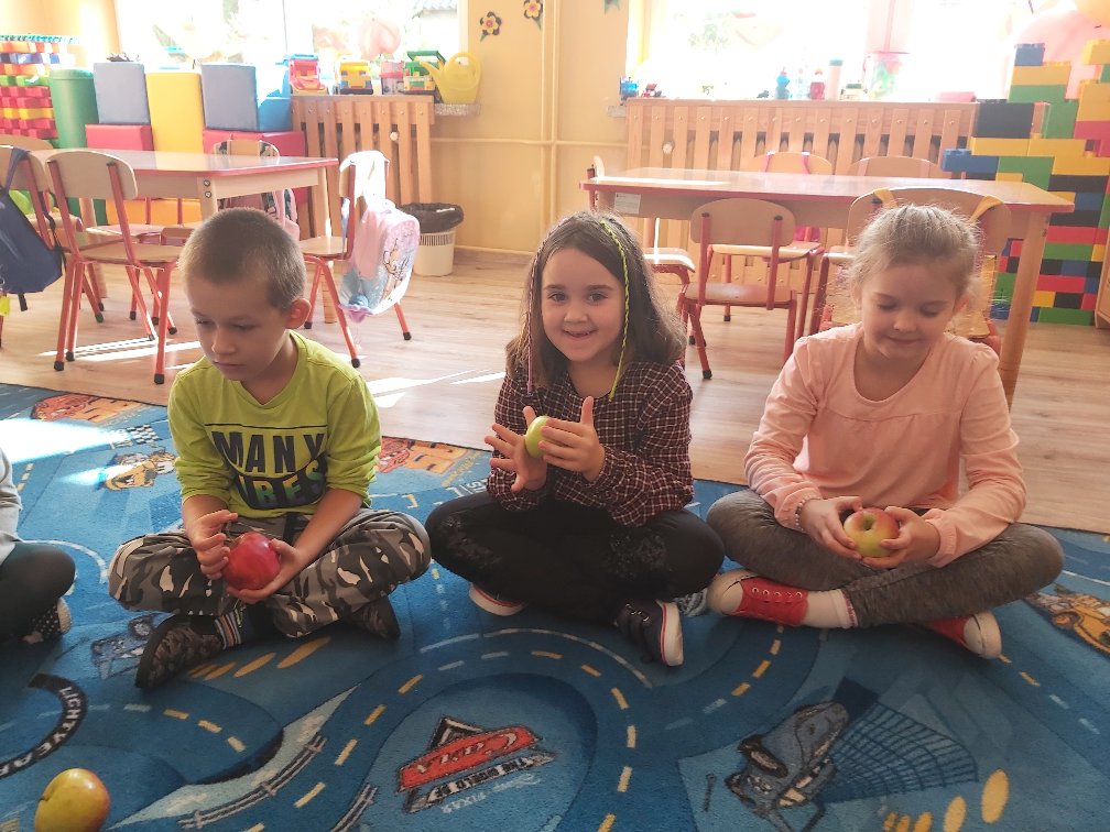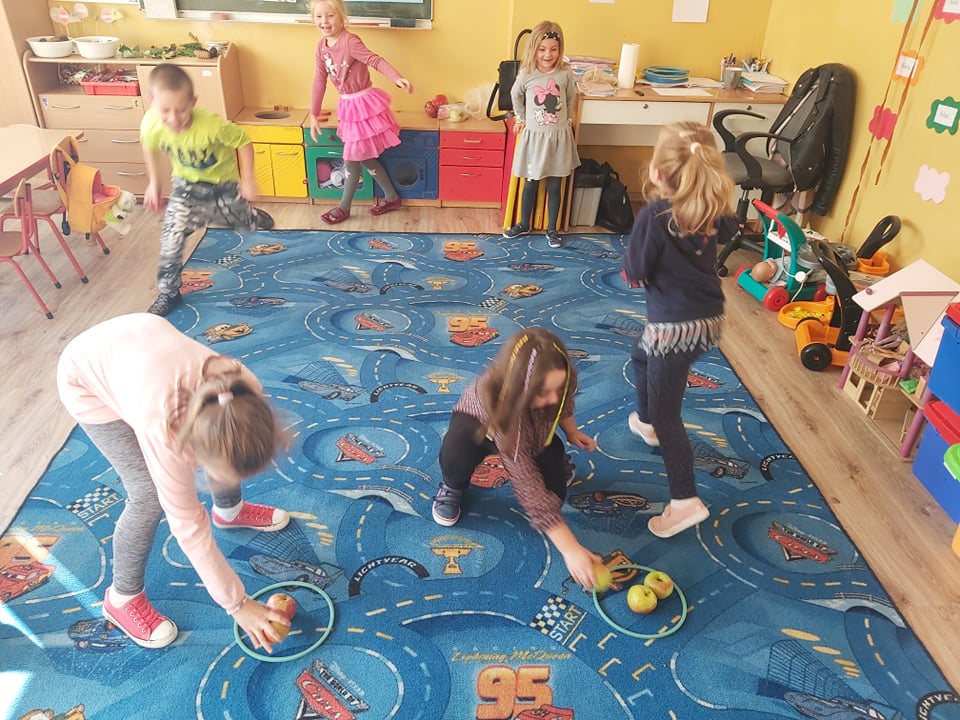 Tego dnia wszystkie gry i zabawy zarówno te ruchowe jak i dydaktyczne były związane tematycznie z jabłkiem, m.in.: „Kelnerzy”, „Gdzie schowało się jabłko?”, „Jabłko – puzzle”. Wszystkie dzieci tańczyły do piosenek „Jabłuszko rumiane” i „Małe czerwone jabłuszko”. Po wspólnych zabawach nadszedł czas na poczęstunek – oczywiście w roli głównej z jabłkami.