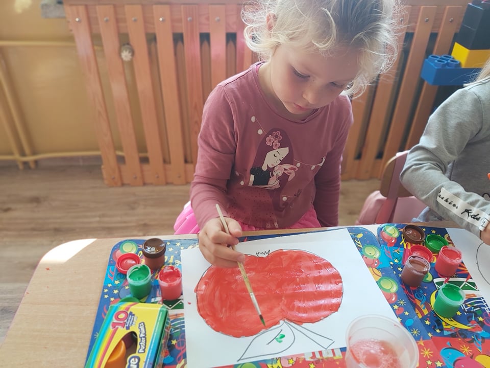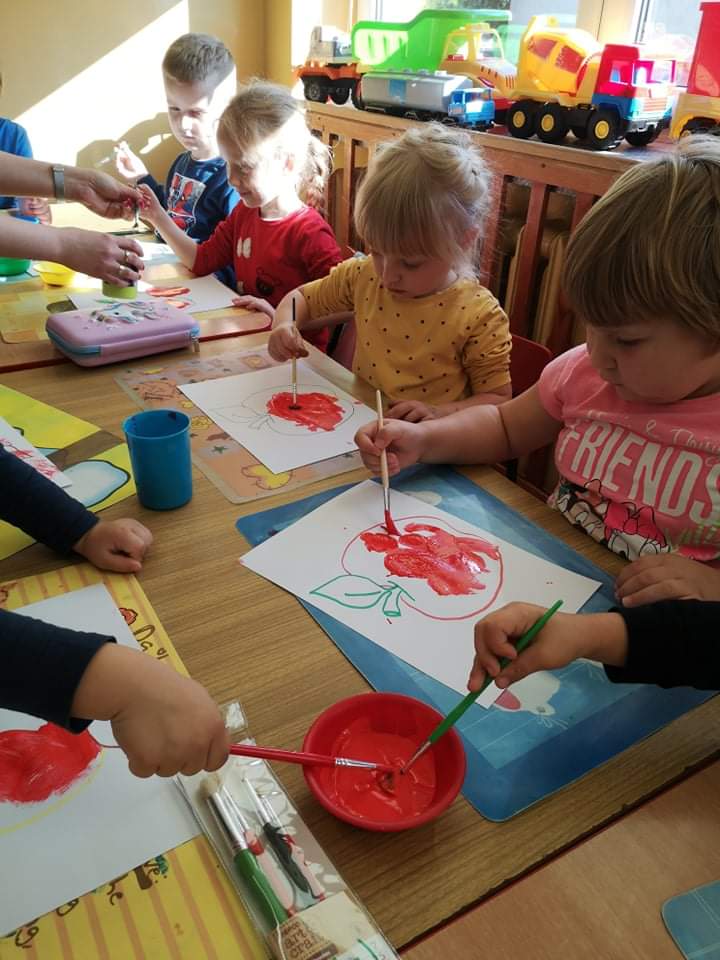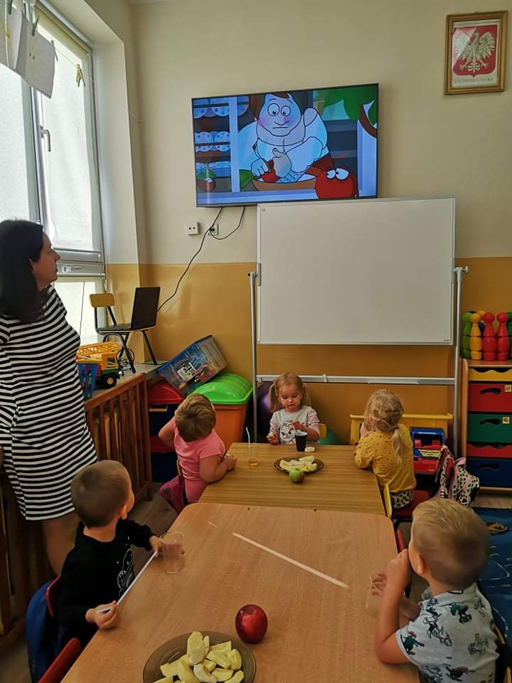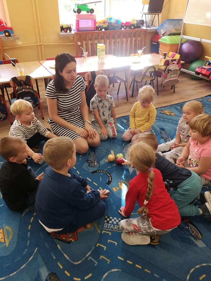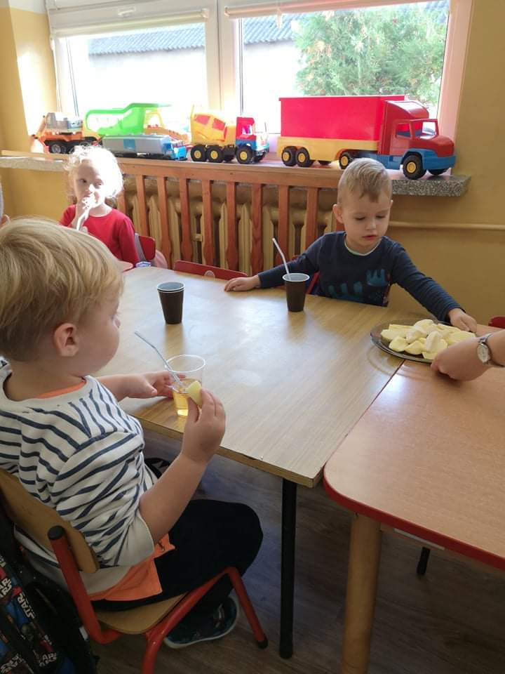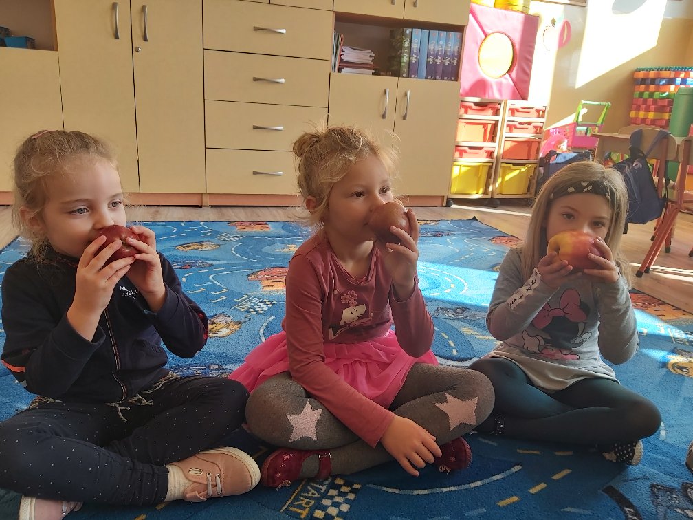 Tego dnia wszystkie gry i zabawy zarówno te ruchowe jak i dydaktyczne były związane tematycznie z jabłkiem, m.in.: „Kelnerzy”, „Gdzie schowało się jabłko?”, „Jabłko – puzzle”. Wszystkie dzieci tańczyły do piosenek „Jabłuszko rumiane” i „Małe czerwone jabłuszko”. Po wspólnych zabawach nadszedł czas na poczęstunek – oczywiście w roli głównej z jabłkami.
