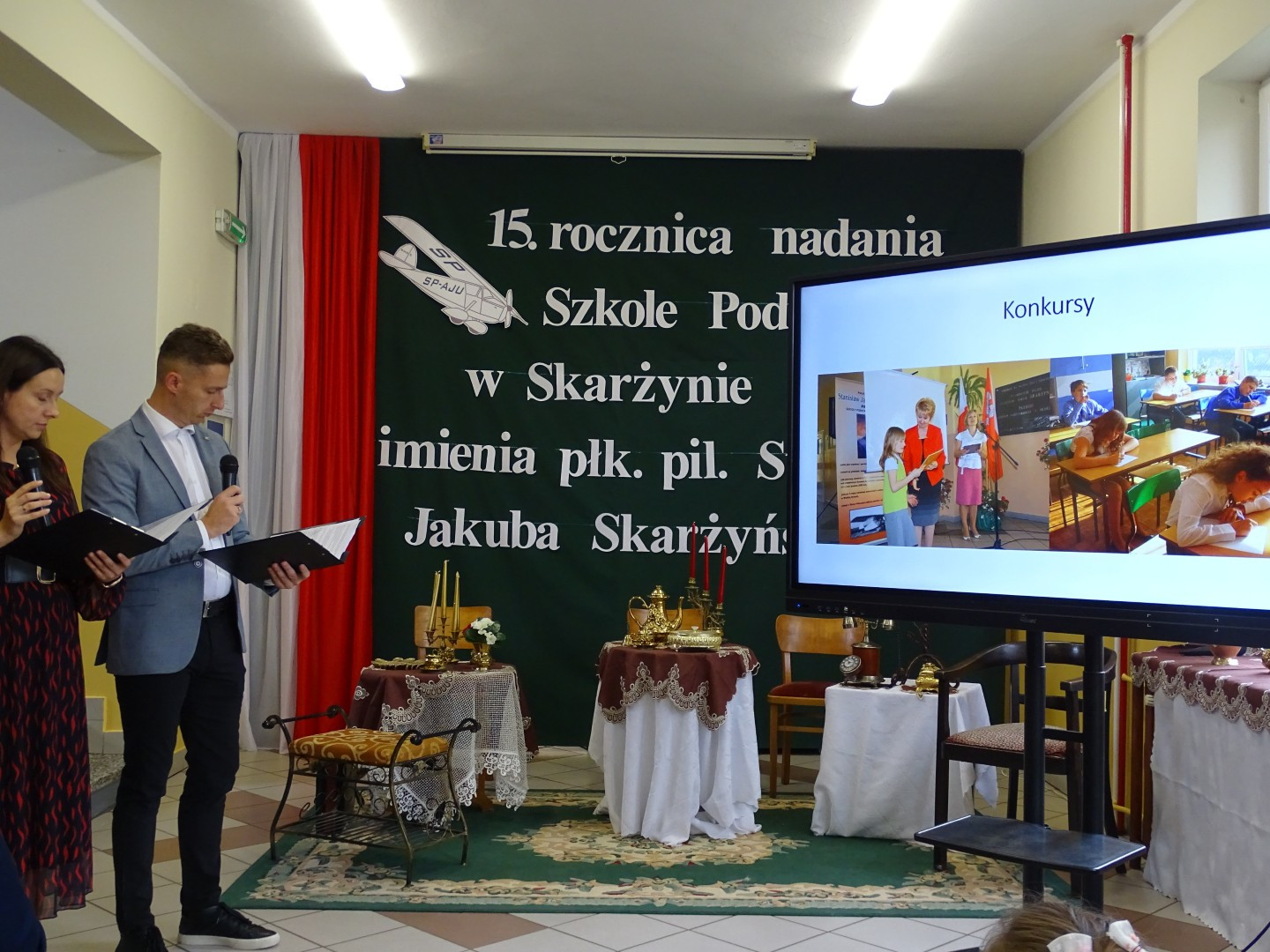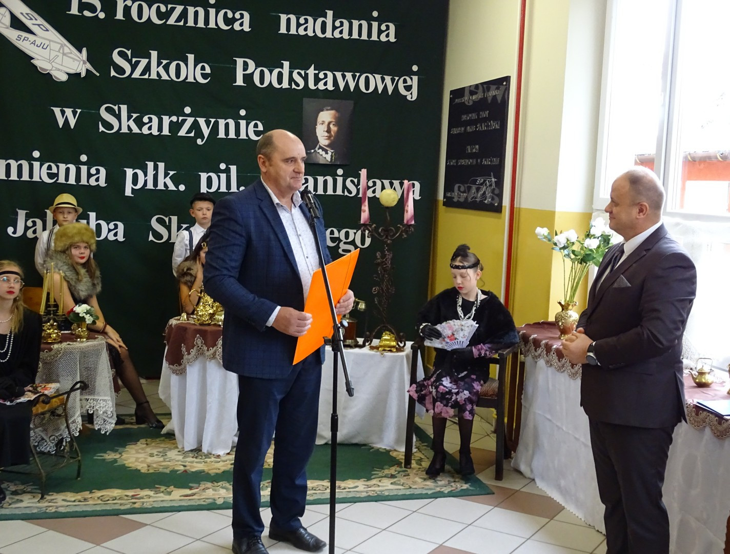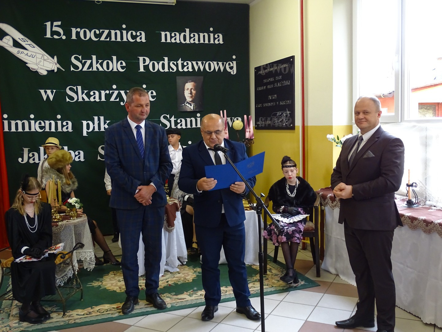 Po wprowadzeniu pocztu flagowego oraz odśpiewaniu hymnu państwowego rozpoczęła się część oficjalna uroczystości, którą poprowadzili nauczyciele p. Agnieszka Deszcz i p. Marcin Mazurek. Przypomnieli oni sylwetkę Stanisława Jakuba Skarżyńskiego oraz okoliczności nadania imienia szkole. Wszyscy zebrami obejrzeli film z uroczystości nadania imienia oraz prezentację multimedialną, która przedstawiała obchody Dnia Patrona na przestrzeni minionych 15 lat. Skierowano również słowa podziękowania dla p. Sylwestra Dzikowskiego za udostępnienie szkole publikacji prasowych dotyczących płk. pil. Stanisława Jakuba Skarżyńskiego.