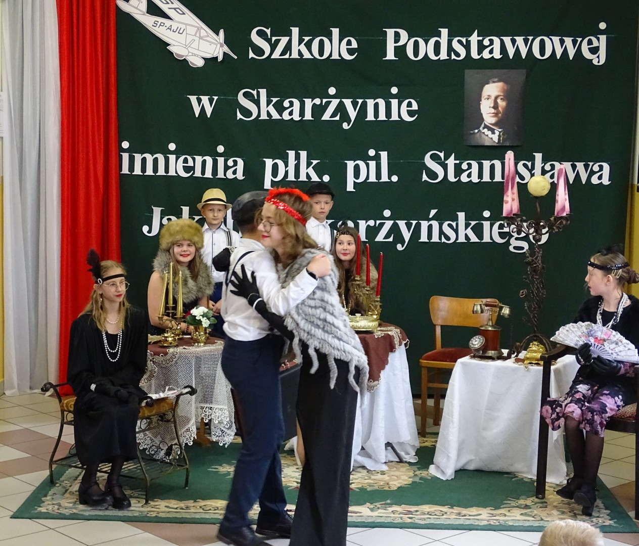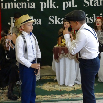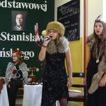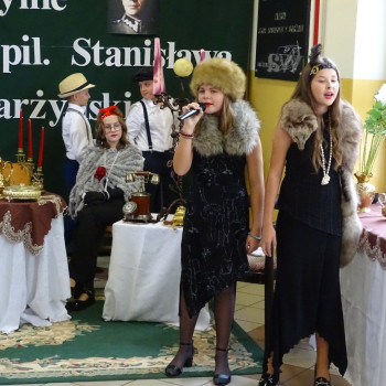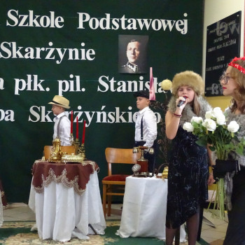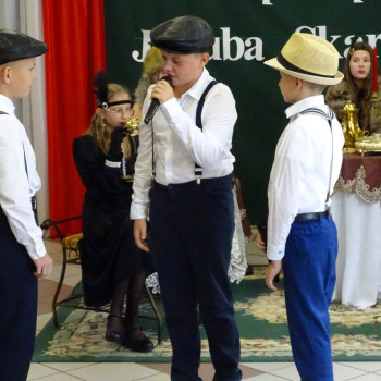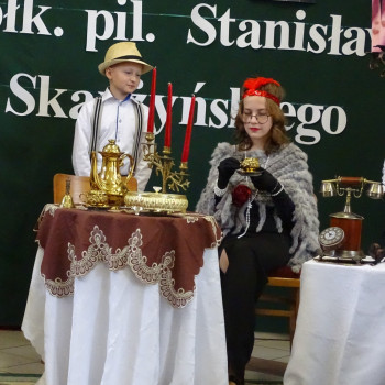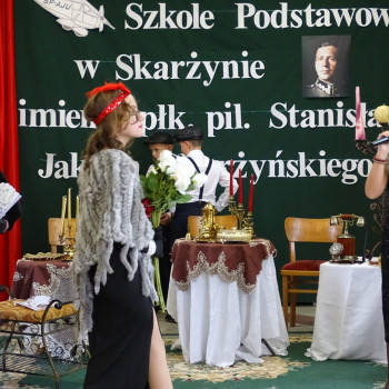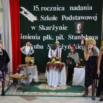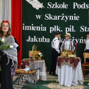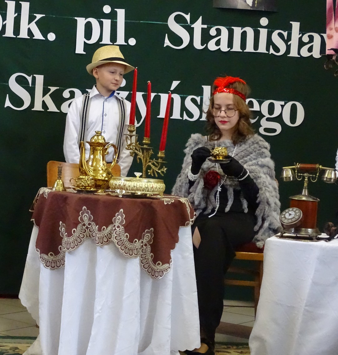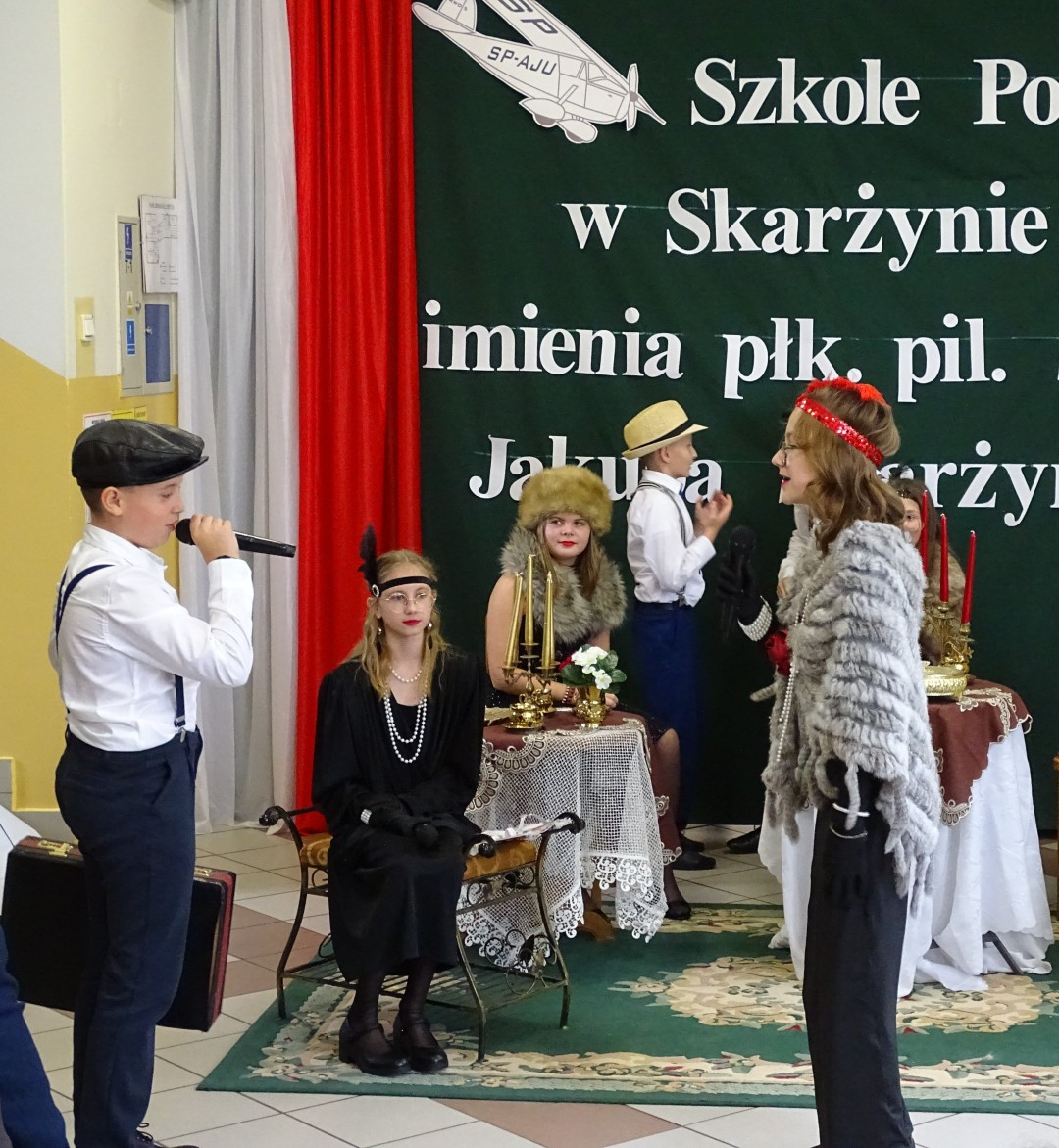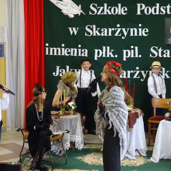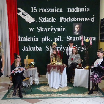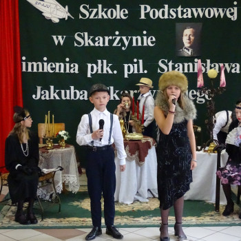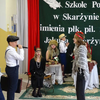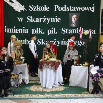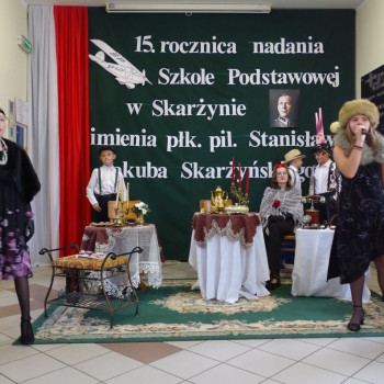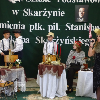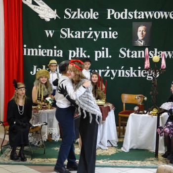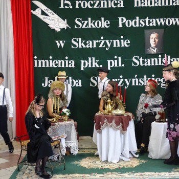 Kulminacyjnym punktem uroczystości była część artystyczna pt. „Śladami naszego Patrona” w wykonaniu uczniów klasy V przygotowana przez p. Angelikę Dzikowską. Barwna, słowno – muzyczna inscenizacja przedstawiająca scenki z życia Stanisława Jakuba Skarżyńskiego zaprosiła widzów do klimatycznej kawiarni dwudziestolecia międzywojennego i została nagrodzona gromkimi brawami.