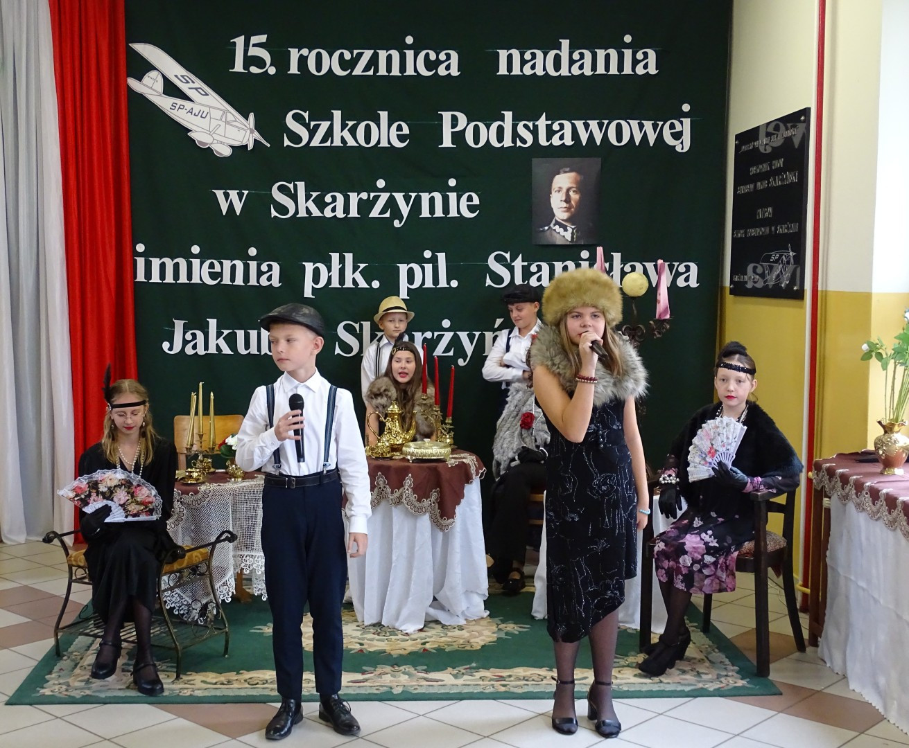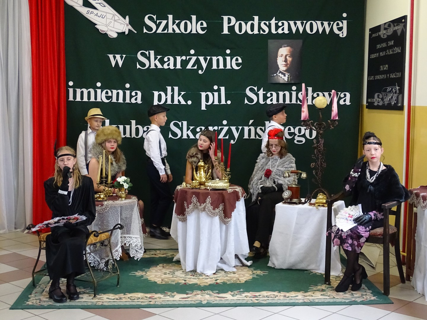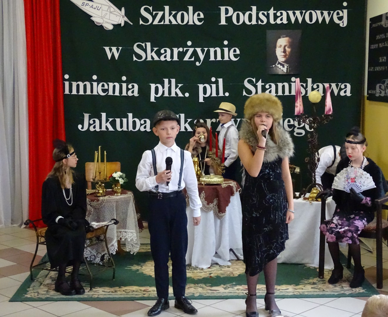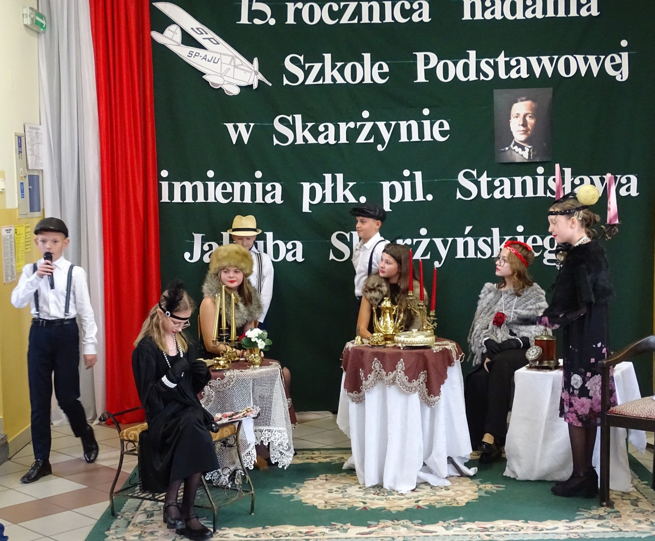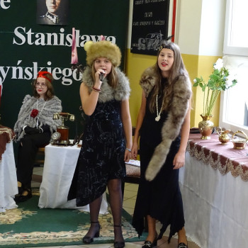 Kulminacyjnym punktem uroczystości była część artystyczna pt. „Śladami naszego Patrona” w wykonaniu uczniów klasy V przygotowana przez p. Angelikę Dzikowską. Barwna, słowno – muzyczna inscenizacja przedstawiająca scenki z życia Stanisława Jakuba Skarżyńskiego zaprosiła widzów do klimatycznej kawiarni dwudziestolecia międzywojennego i została nagrodzona gromkimi brawami.