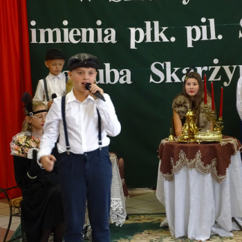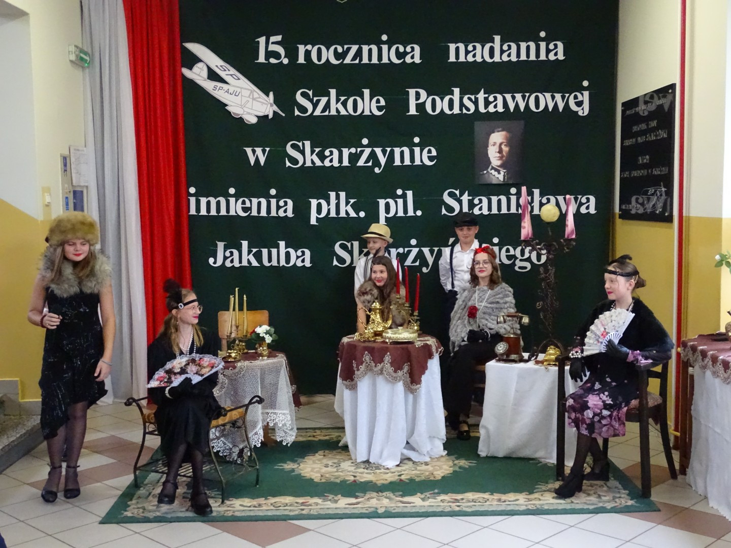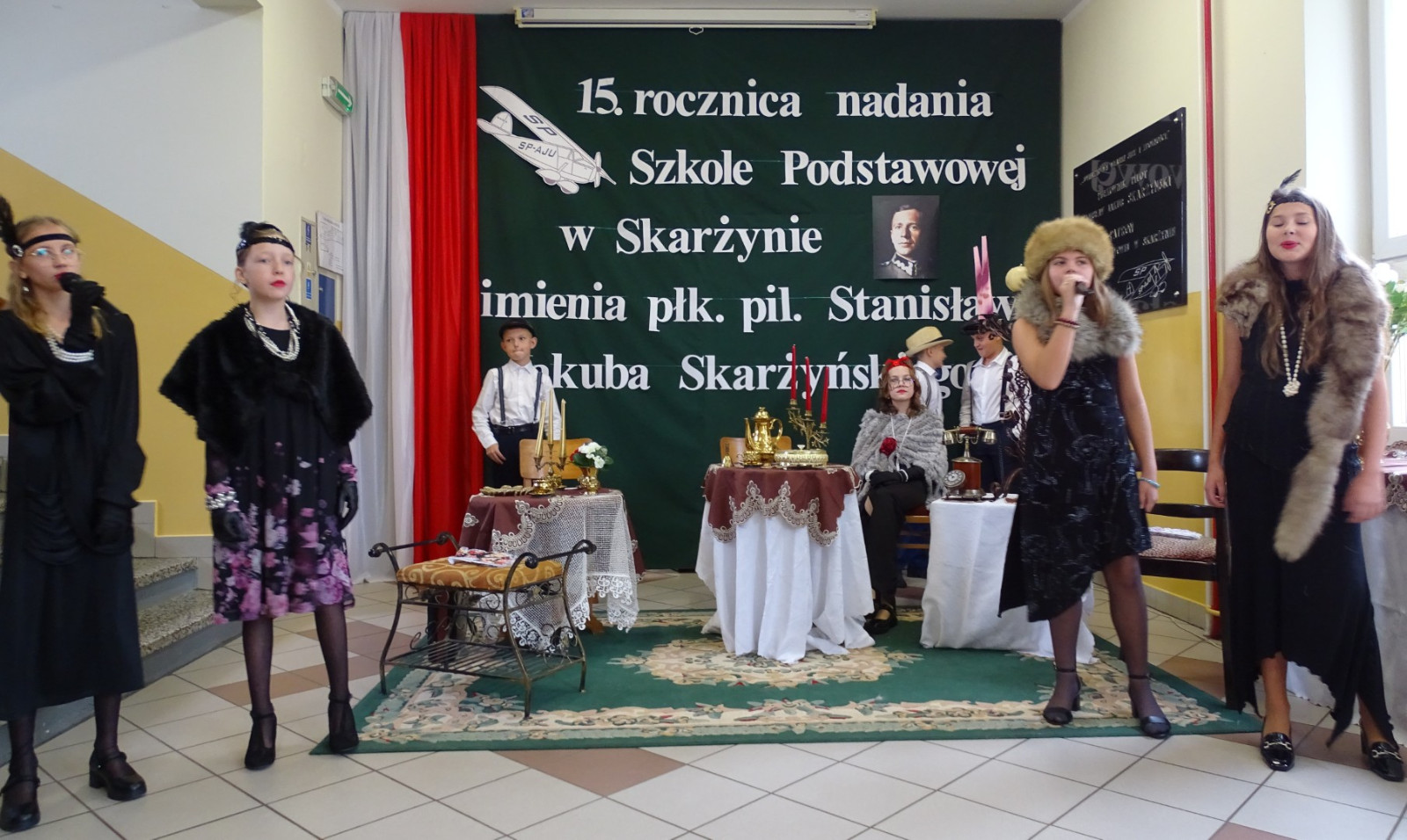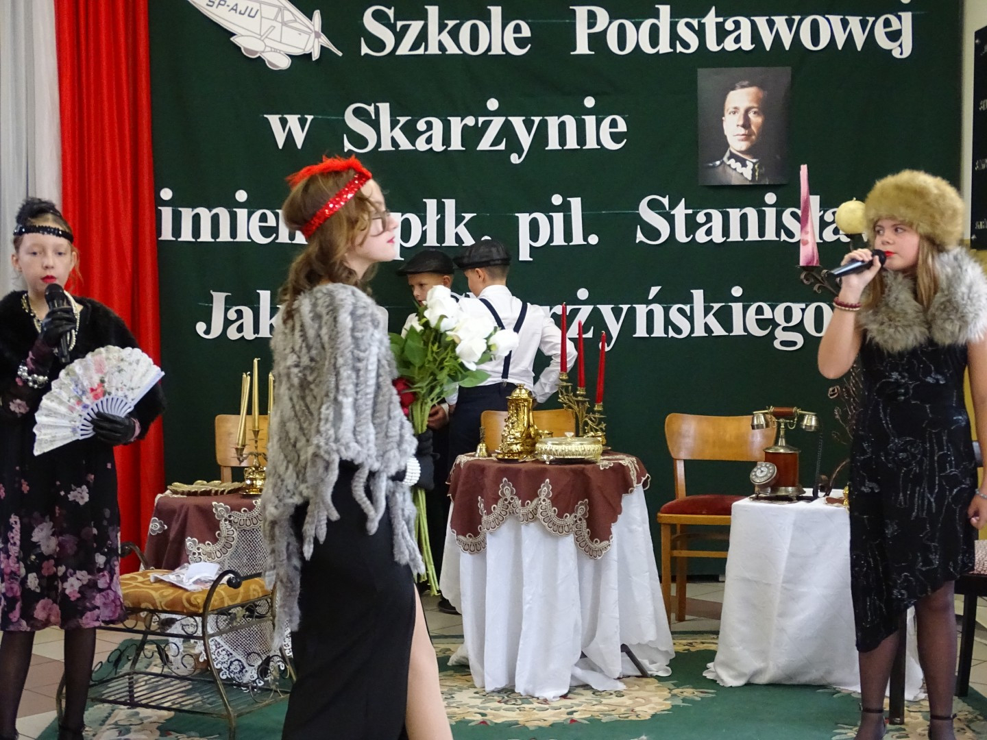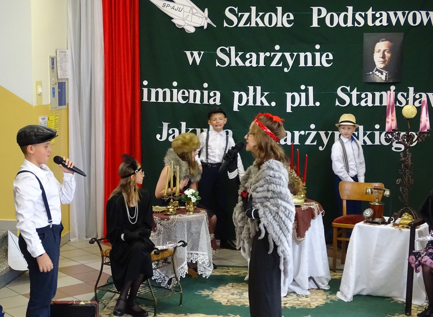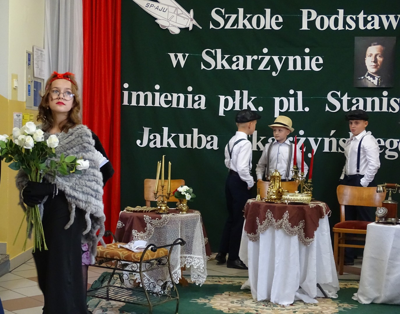 Kulminacyjnym punktem uroczystości była część artystyczna pt. „Śladami naszego Patrona” w wykonaniu uczniów klasy V przygotowana przez p. Angelikę Dzikowską. Barwna, słowno – muzyczna inscenizacja przedstawiająca scenki z życia Stanisława Jakuba Skarżyńskiego zaprosiła widzów do klimatycznej kawiarni dwudziestolecia międzywojennego i została nagrodzona gromkimi brawami.