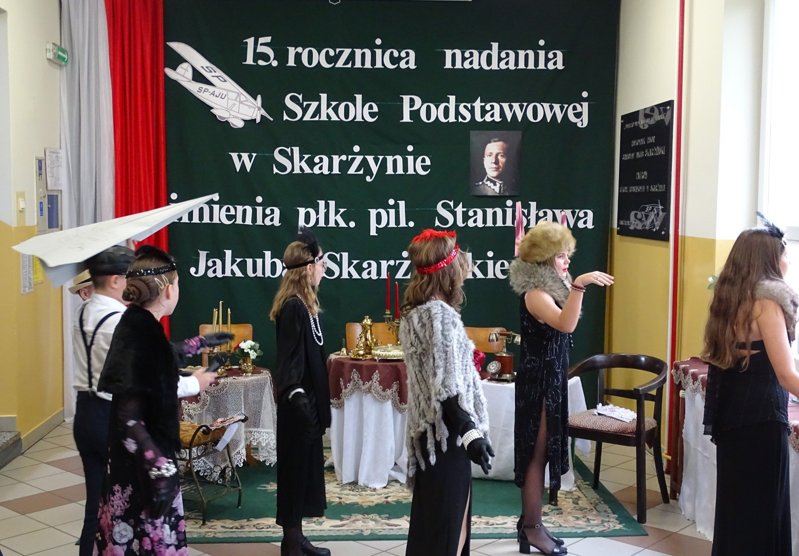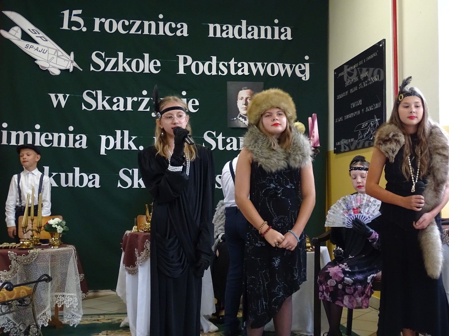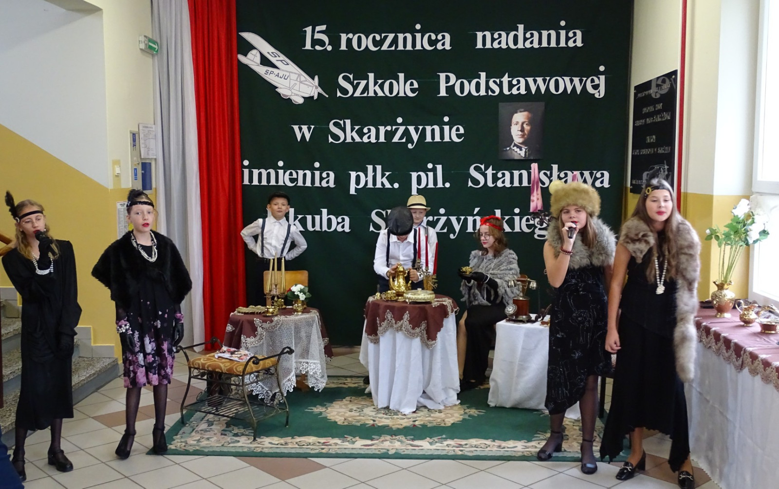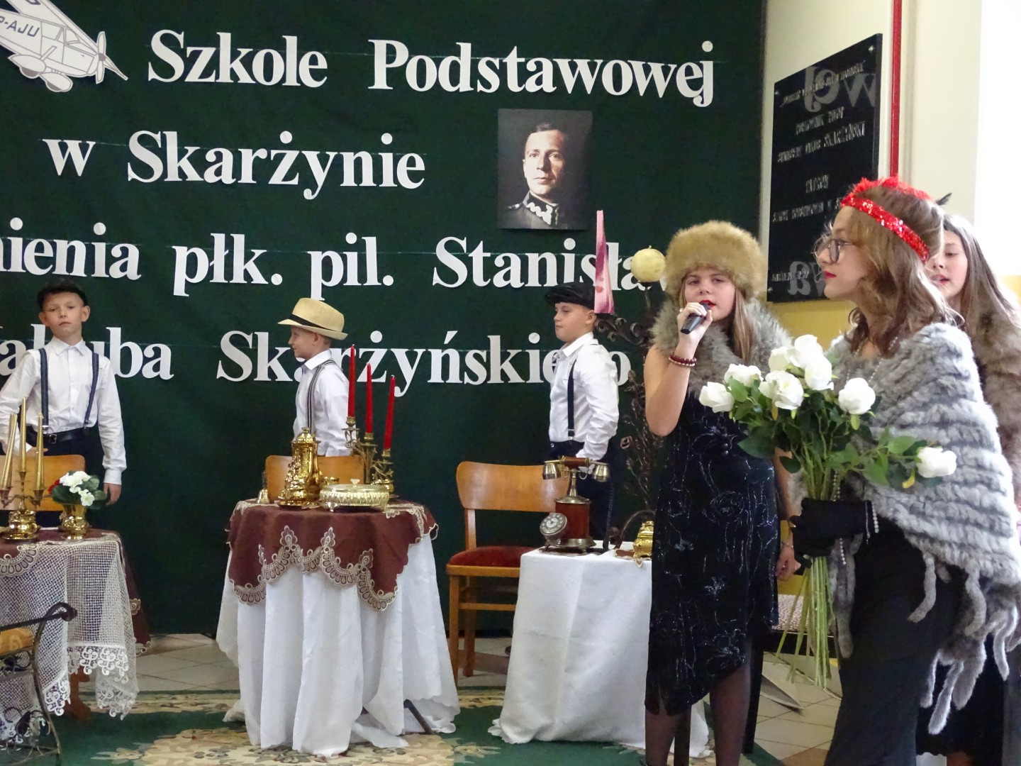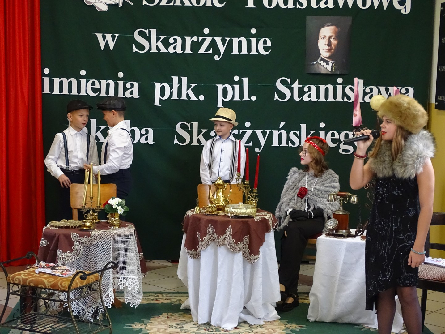 Kulminacyjnym punktem uroczystości była część artystyczna pt. „Śladami naszego Patrona” w wykonaniu uczniów klasy V przygotowana przez p. Angelikę Dzikowską. Barwna, słowno – muzyczna inscenizacja przedstawiająca scenki z życia Stanisława Jakuba Skarżyńskiego zaprosiła widzów do klimatycznej kawiarni dwudziestolecia międzywojennego i została nagrodzona gromkimi brawami.