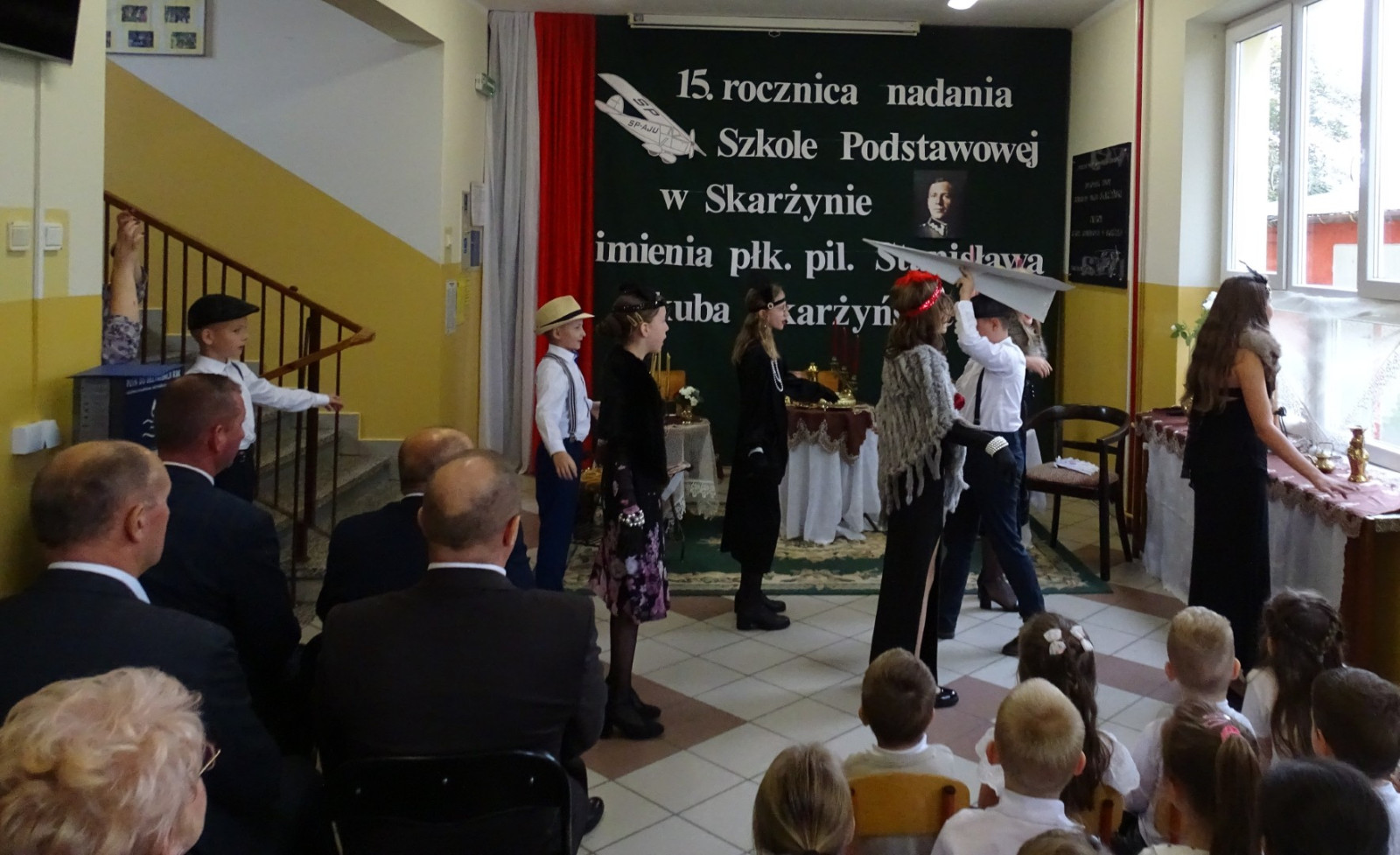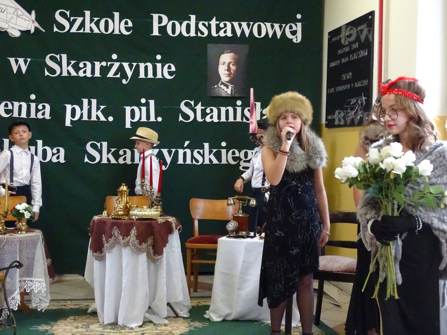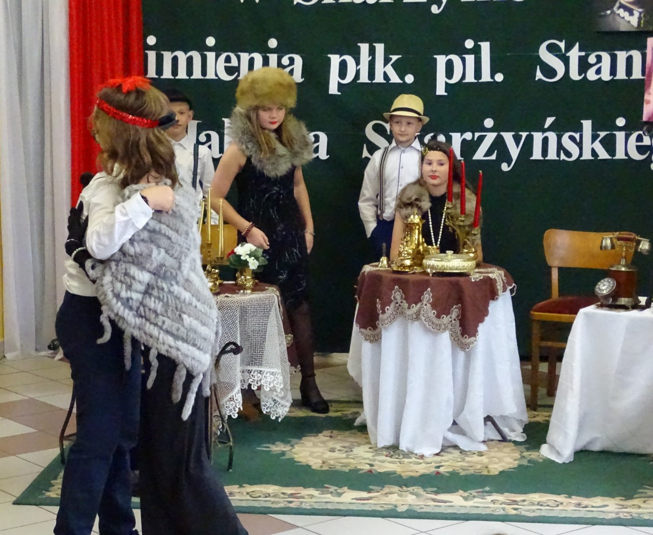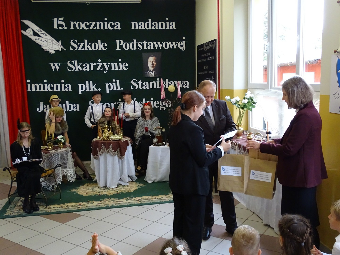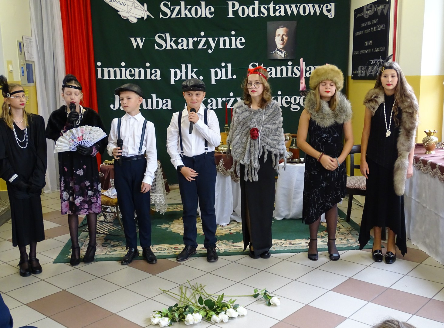 Kulminacyjnym punktem uroczystości była część artystyczna pt. „Śladami naszego Patrona” w wykonaniu uczniów klasy V przygotowana przez p. Angelikę Dzikowską. Barwna, słowno – muzyczna inscenizacja przedstawiająca scenki z życia Stanisława Jakuba Skarżyńskiego zaprosiła widzów do klimatycznej kawiarni dwudziestolecia międzywojennego i została nagrodzona gromkimi brawami.