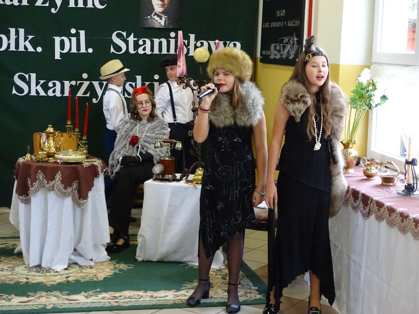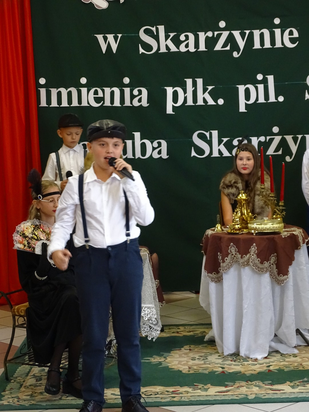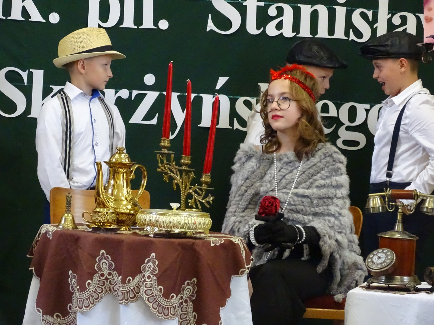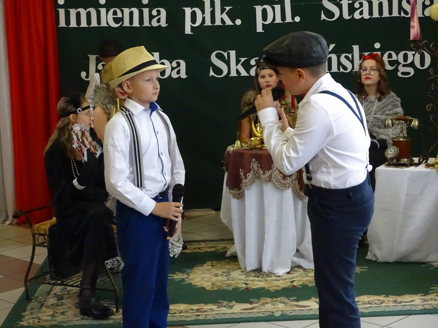 Kulminacyjnym punktem uroczystości była część artystyczna pt. „Śladami naszego Patrona” w wykonaniu uczniów klasy V przygotowana przez p. Angelikę Dzikowską. Barwna, słowno – muzyczna inscenizacja przedstawiająca scenki z życia Stanisława Jakuba Skarżyńskiego zaprosiła widzów do klimatycznej kawiarni dwudziestolecia międzywojennego i została nagrodzona gromkimi brawami.
