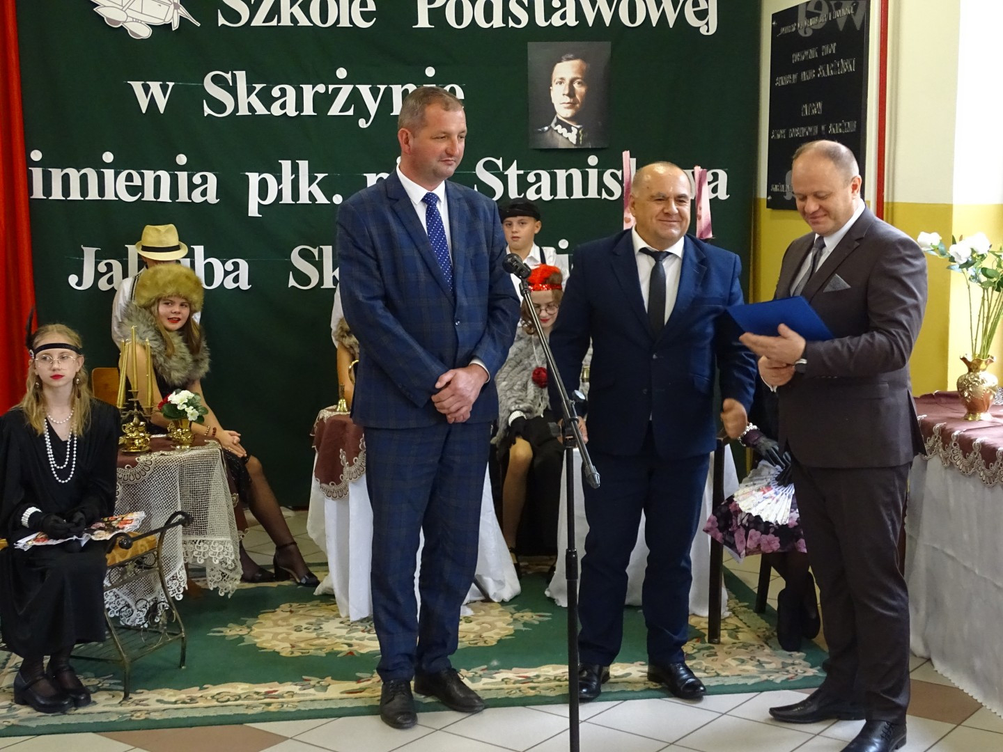 W uroczystości wzięła udział cała społeczność szkolna oraz zaproszeni goście a wśród nich: Wójt Gminy Kawęczyn – p. Jan Gruca, były wójt naszej gminy – p. Jan Nowak, przewodniczący Rady Gminy Kawęczyn – p. Łukasz Mila, Radna Gminy Kawęczyn oraz przewodnicząca Rady Rodziców – p. Marzena Barcka, byłe p. dyrektor naszej szkoły – p. Maria Antoszczyk i p. Beata Ryśkiewicz, sołtys wsi Skarzyn – p. Edward Tobijas, Radny Gminy Kawęczyn i prezes OSP Skarżyn – p. Karol Rygas, przewodniczący Koła Miłośników Dziejów i Tradycji Regionu w Kawęczynie – p. Sylwester Dzikowski, przedstawicielki Rady Rodziców – p. Honorata Tomasik oraz emerytowane pracownice naszej szkoły.