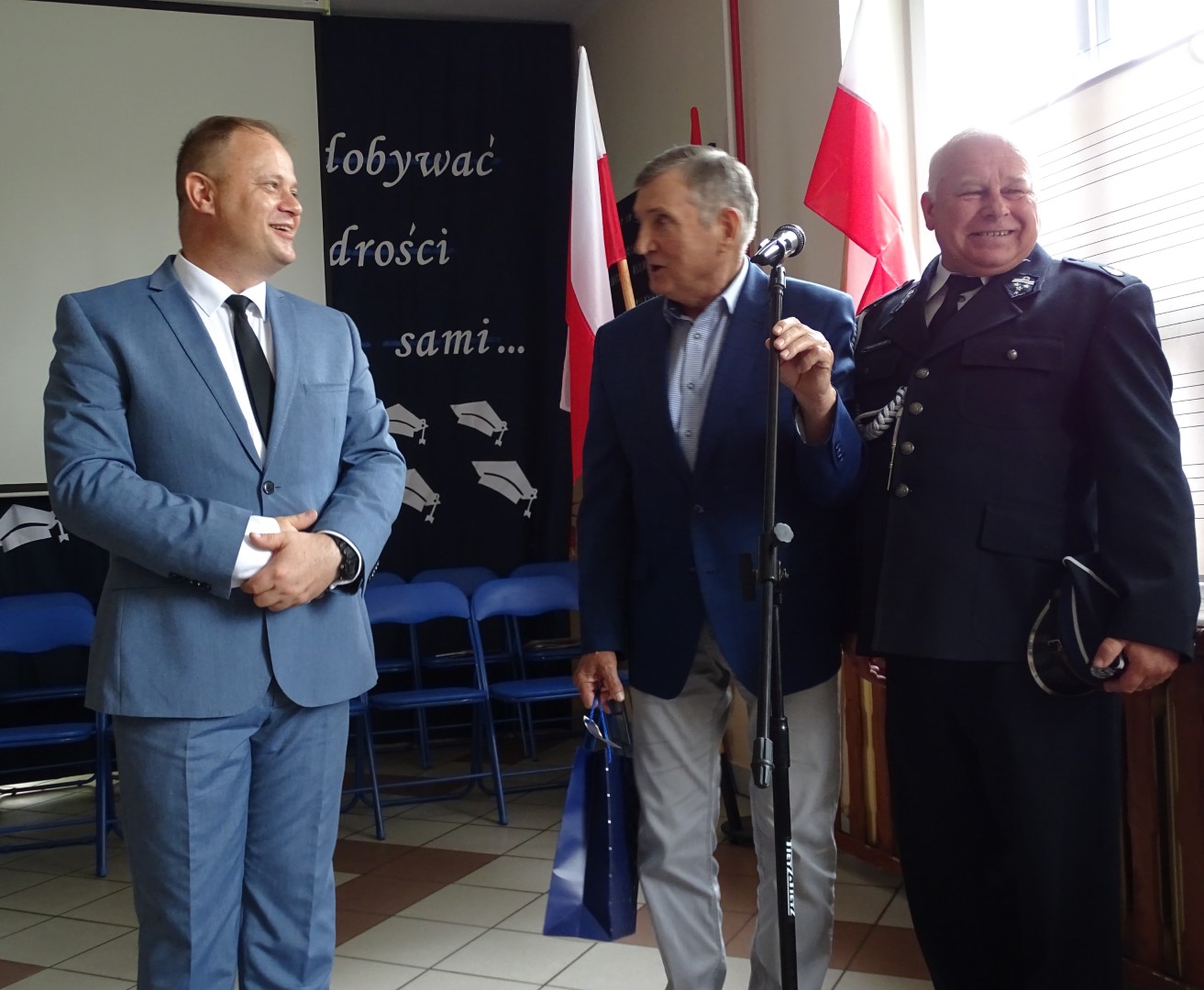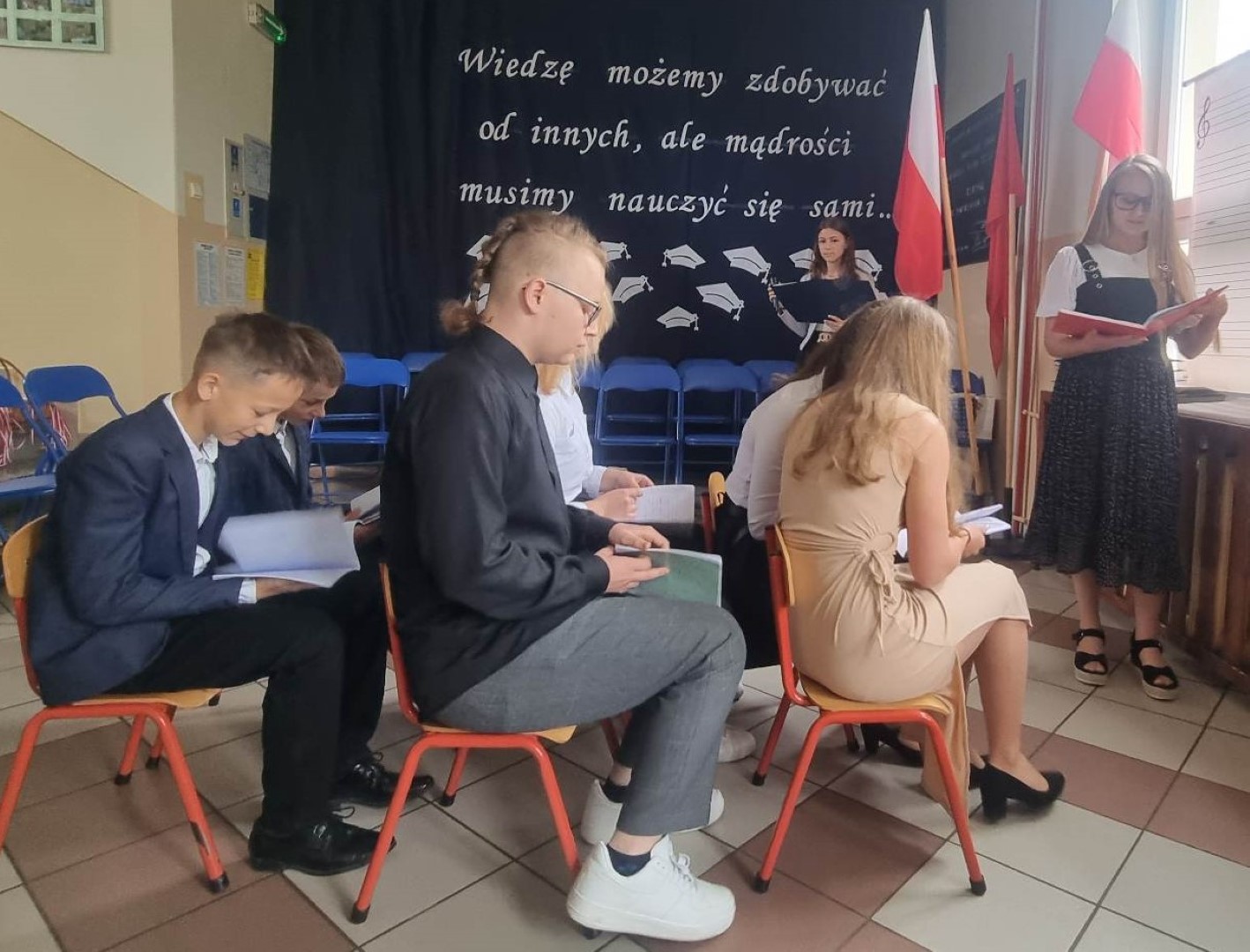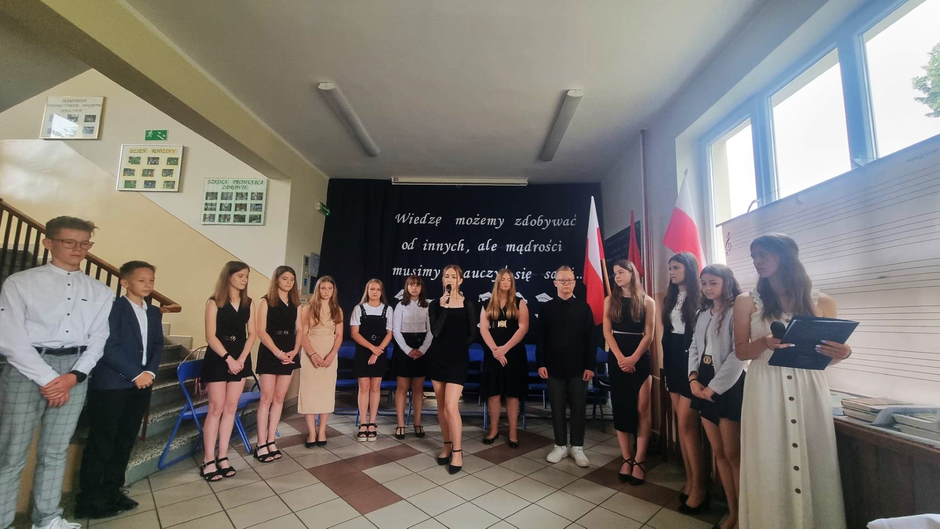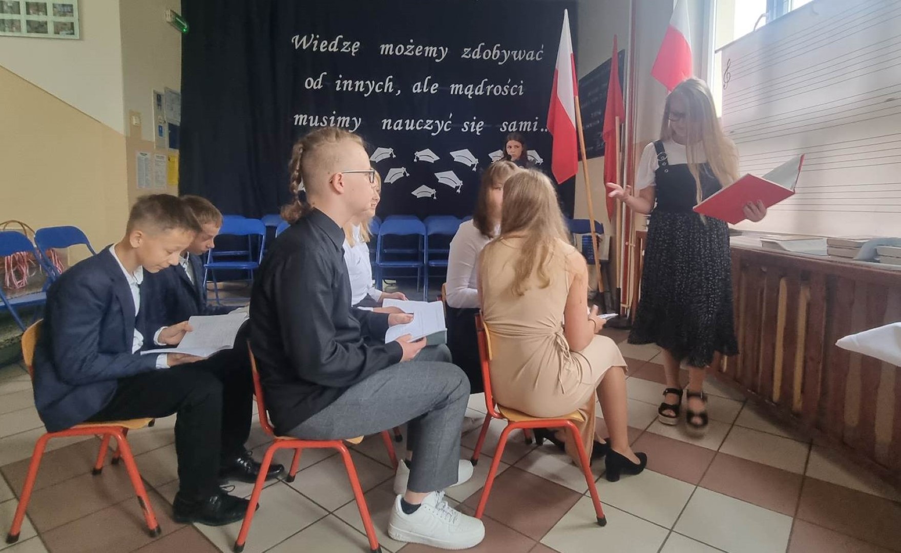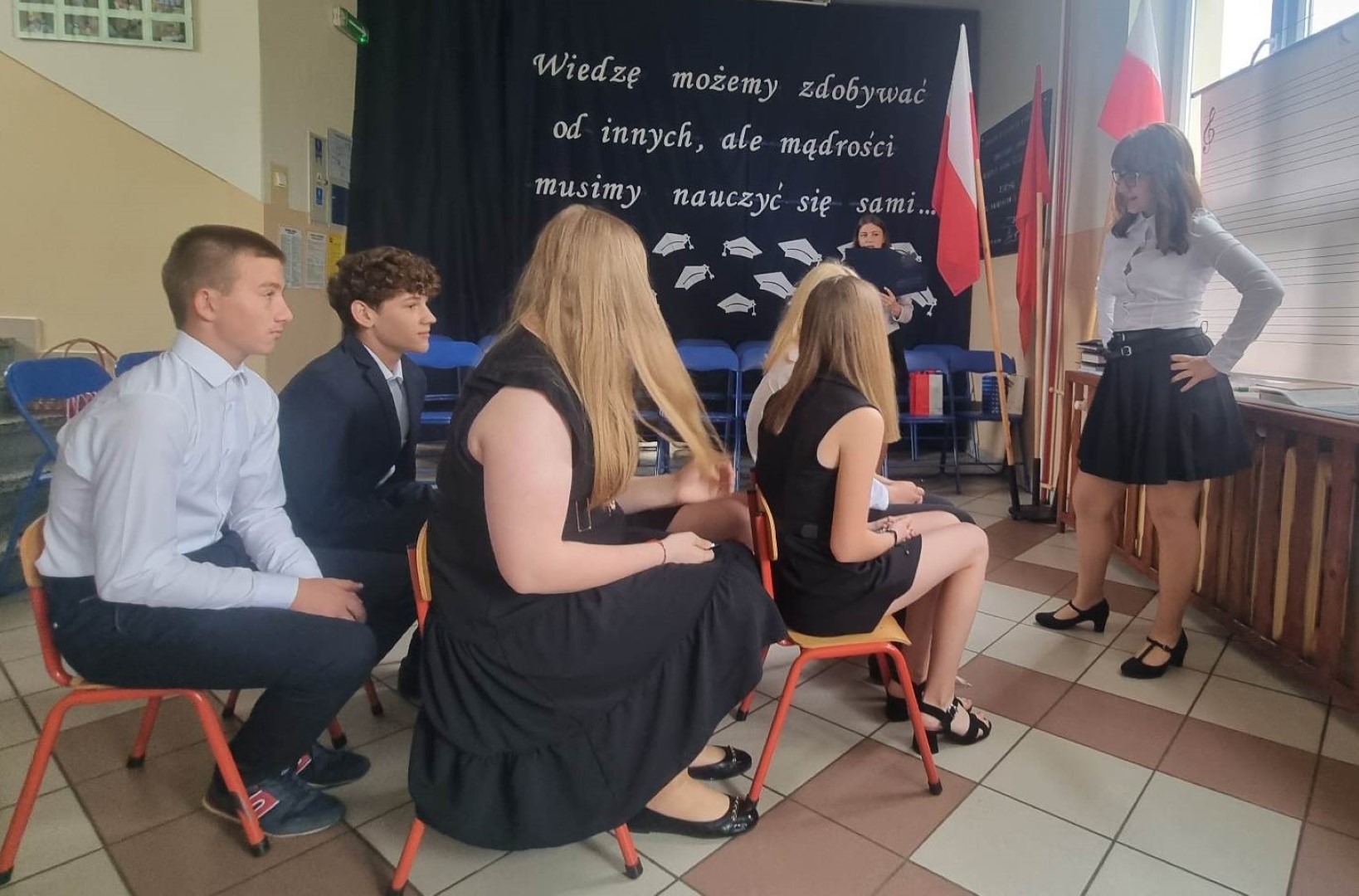 Po nabożeństwie uczniowie wraz z nauczycielami przybyli do szkoły na uroczystą akademię. Uroczystość rozpoczęto wprowadzeniem pocztu sztandarowego oraz odśpiewaniem hymnu narodowego.