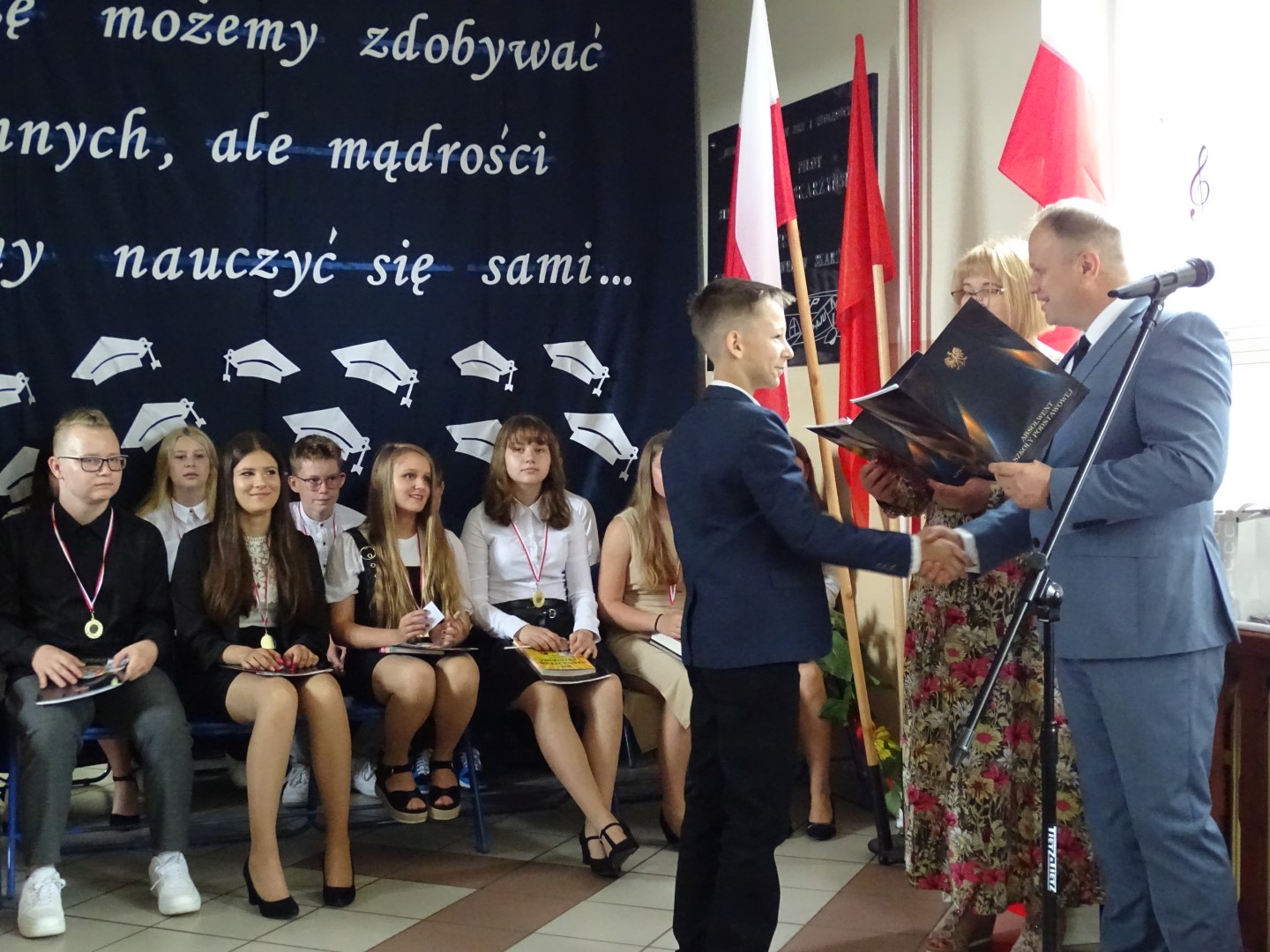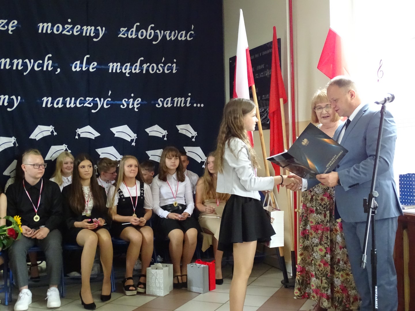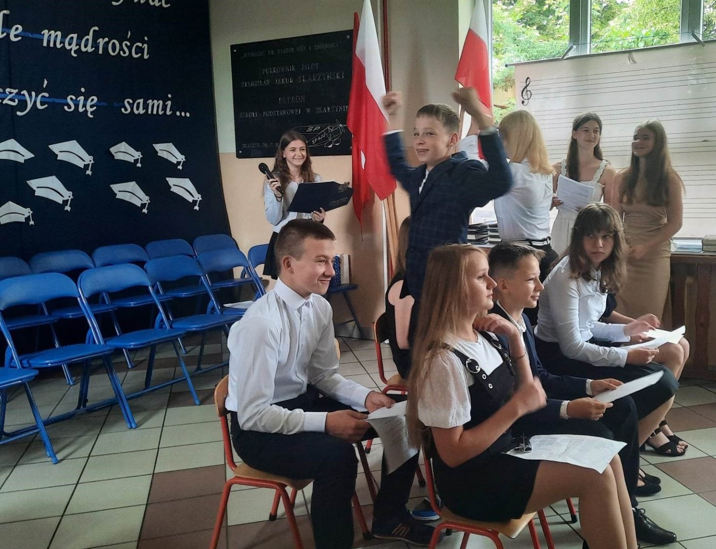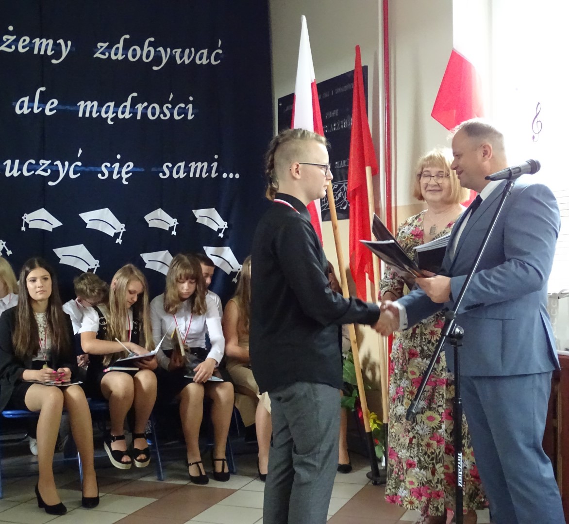 Dumni rodzice nagrodzonych uczniów otrzymali listy gratulacyjne. Pozostali uczniowie klasy ósmej otrzymali świadectwa oraz tytuł absolwenta Szkoły Podstawowej im. płk. pil. St. J. Skarżyńskiego w Skarżynie wraz z najlepszymi życzeniami. Ceremonii wręczenia dokonał dyrektor szkoły wraz z wychowawczynią klasy ósmej.