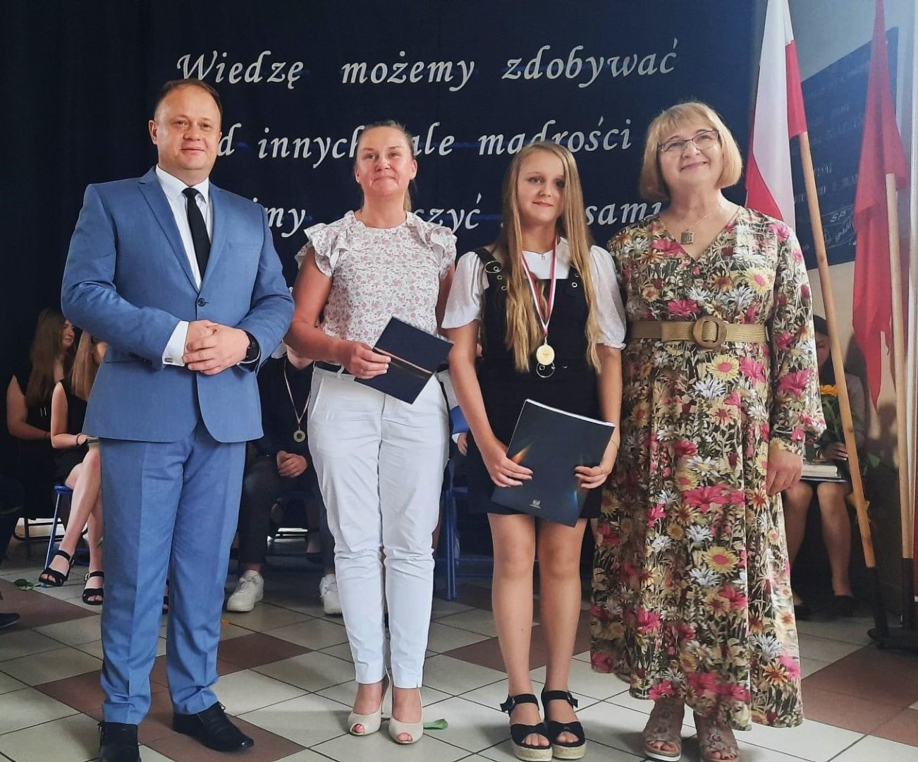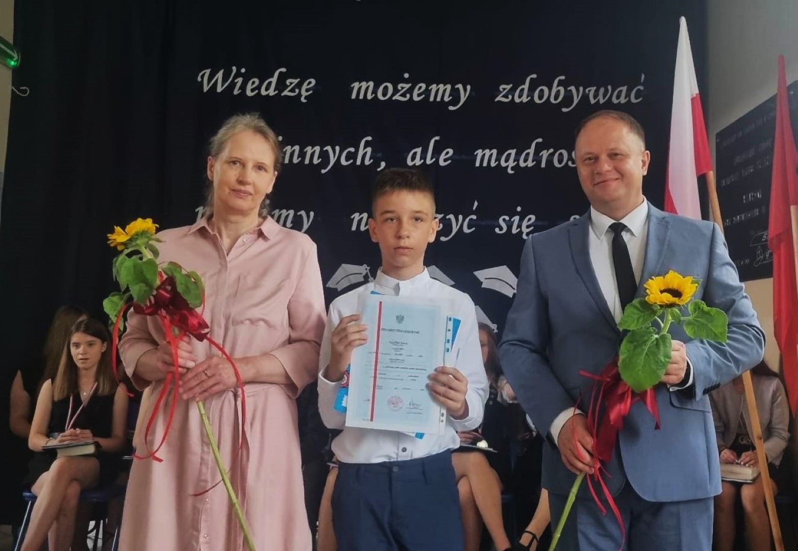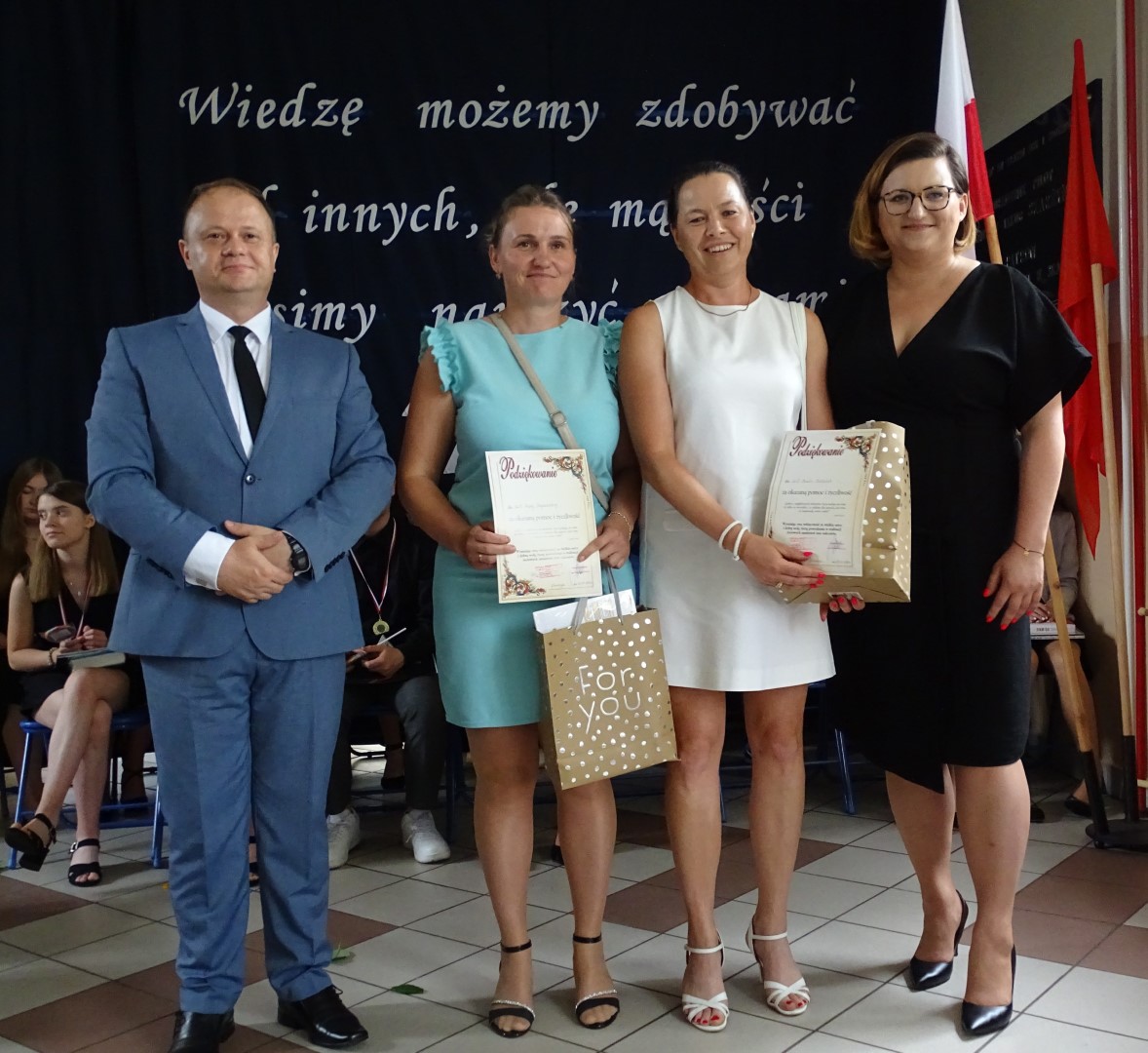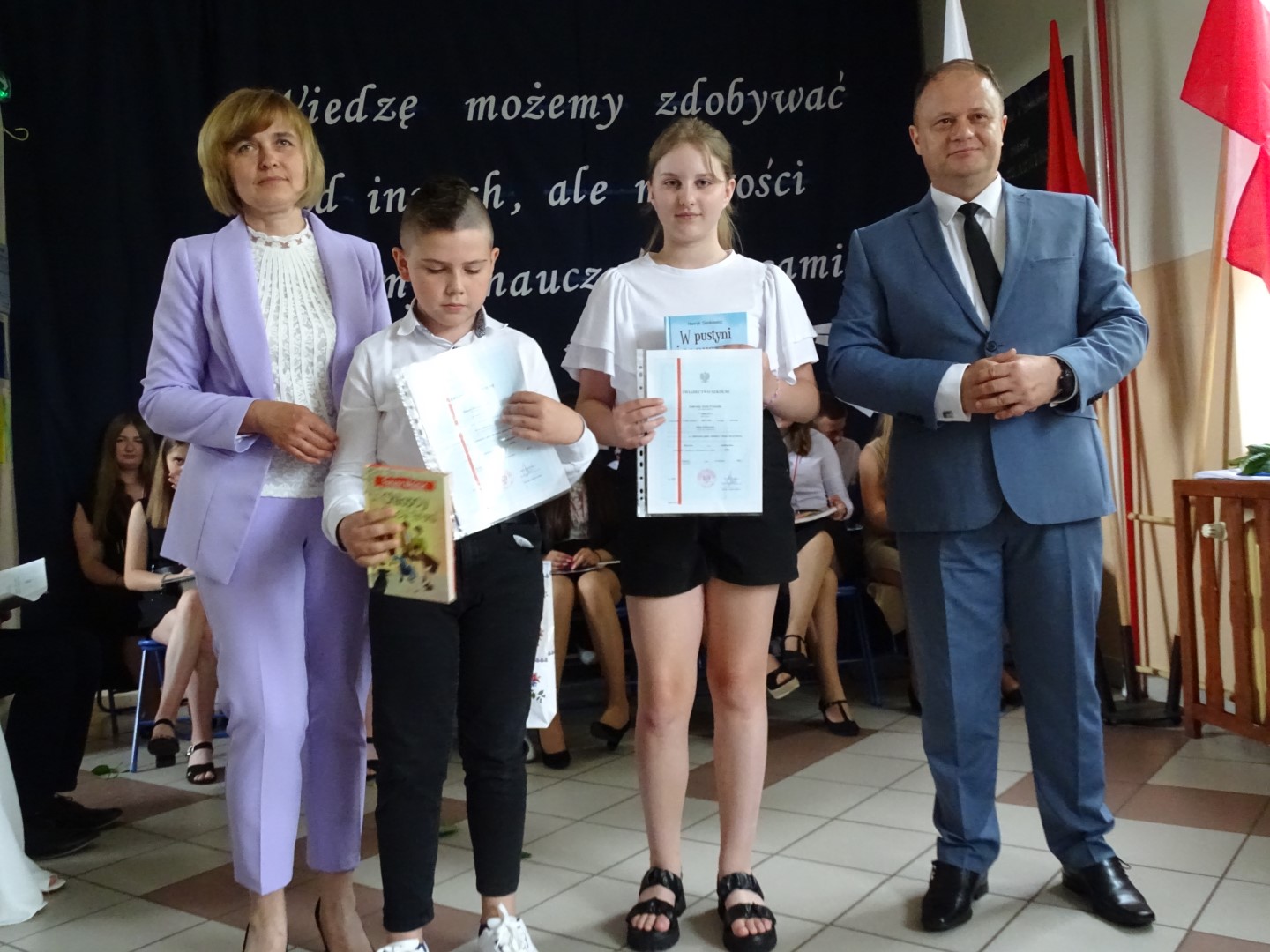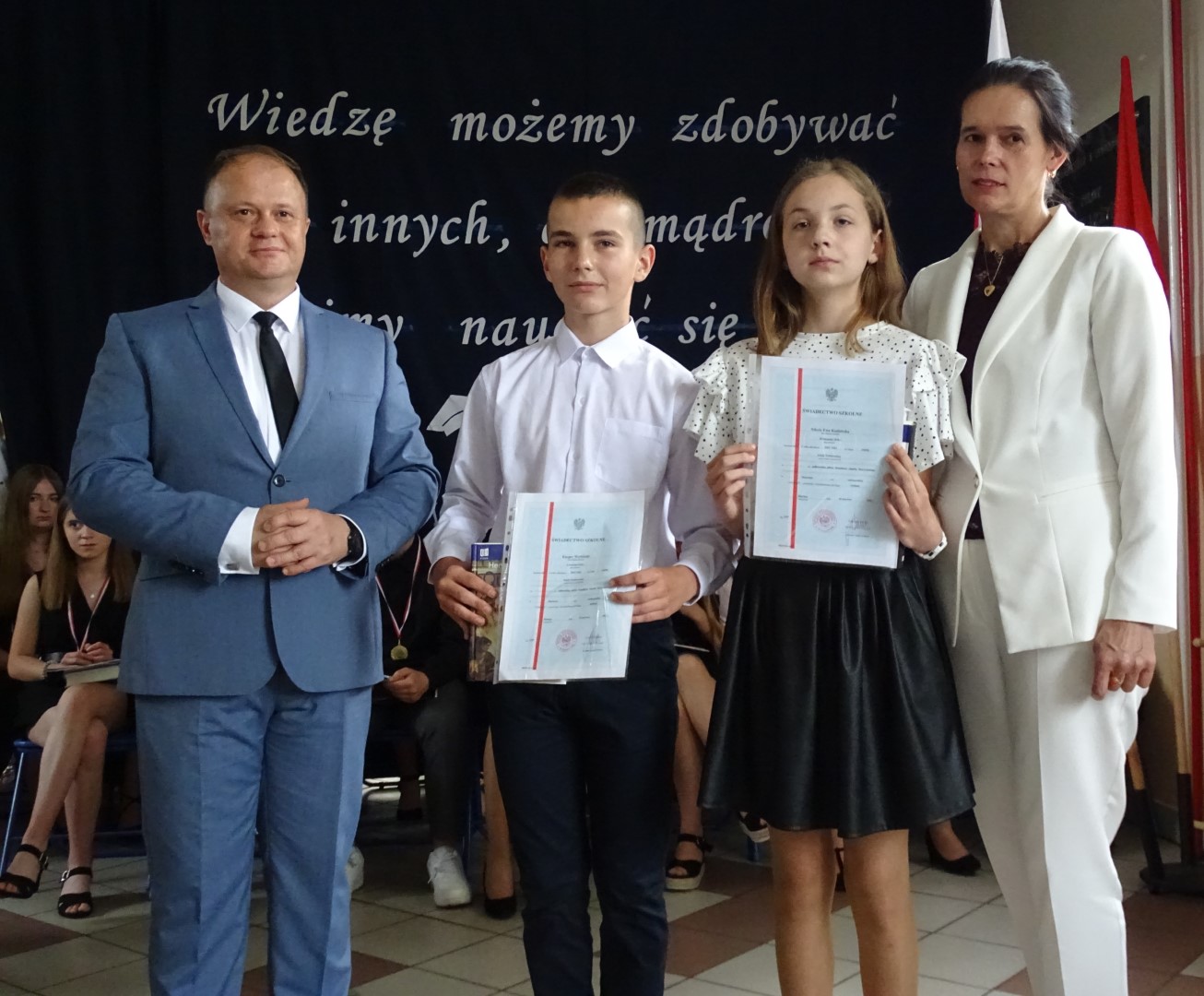 Dumni rodzice nagrodzonych uczniów otrzymali listy gratulacyjne. Pozostali uczniowie klasy ósmej otrzymali świadectwa oraz tytuł absolwenta Szkoły Podstawowej im. płk. pil. St. J. Skarżyńskiego w Skarżynie wraz z najlepszymi życzeniami. Ceremonii wręczenia dokonał dyrektor szkoły wraz z wychowawczynią klasy ósmej.
