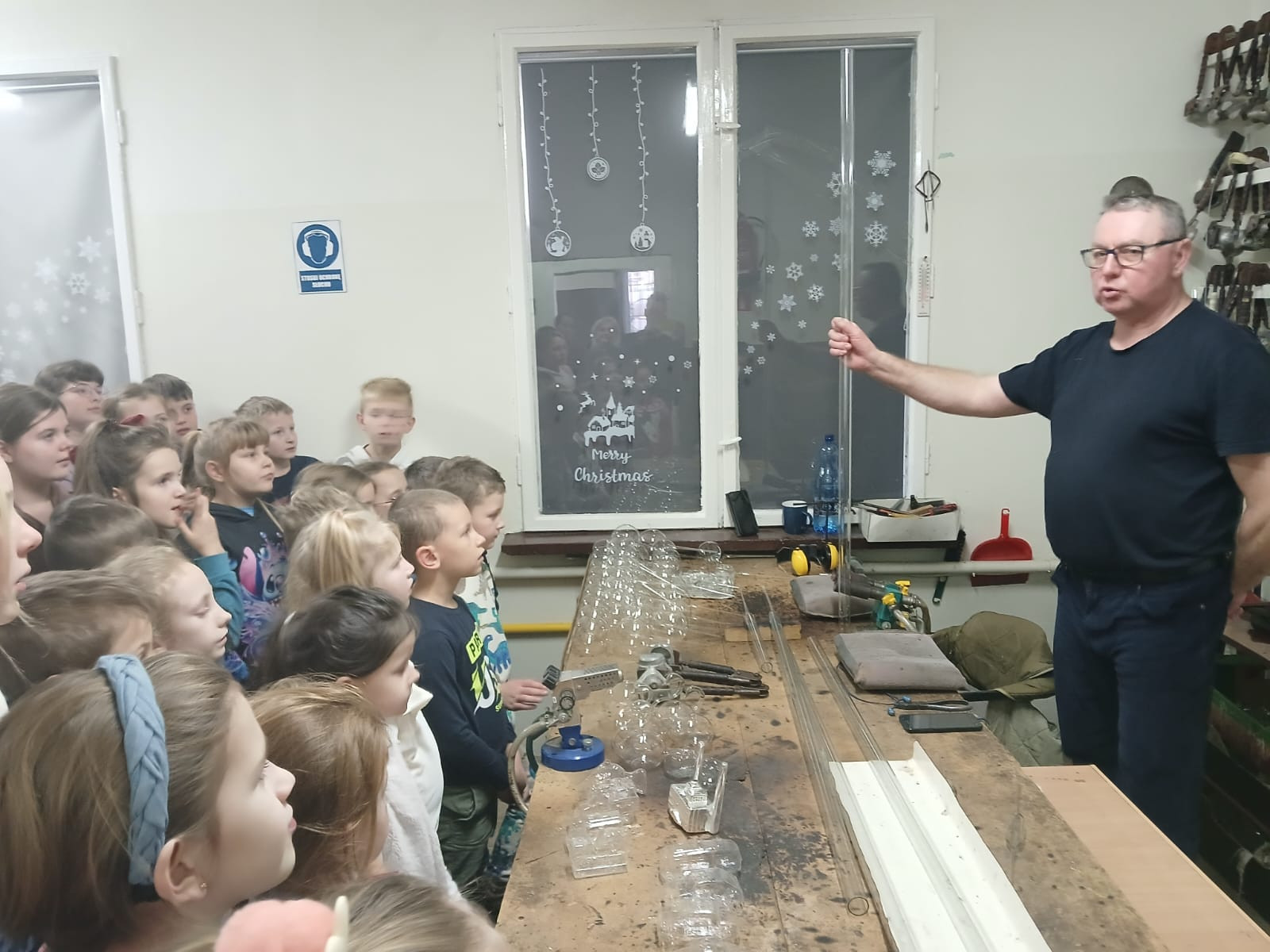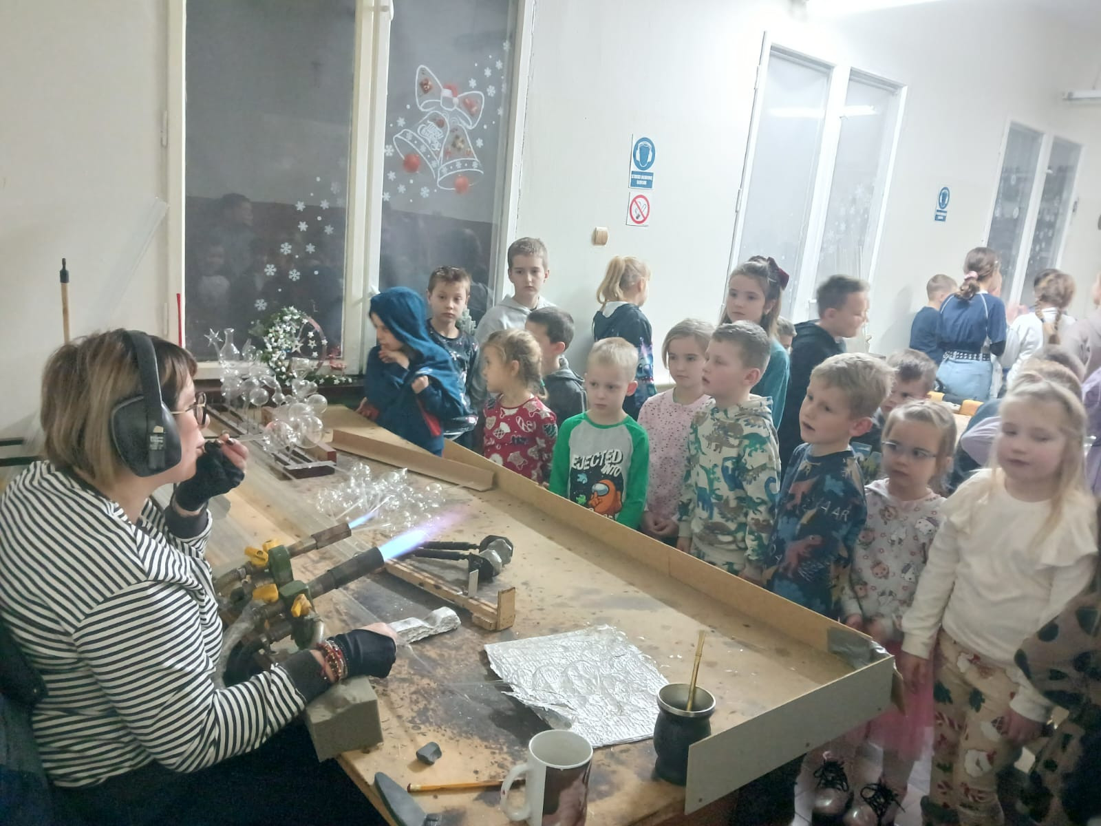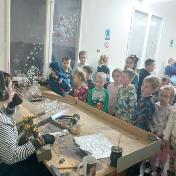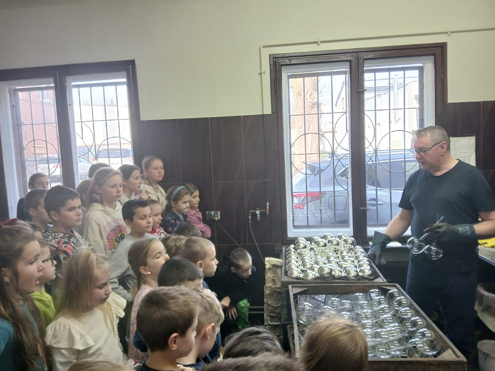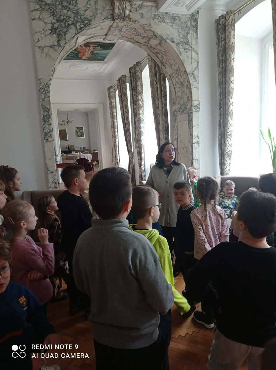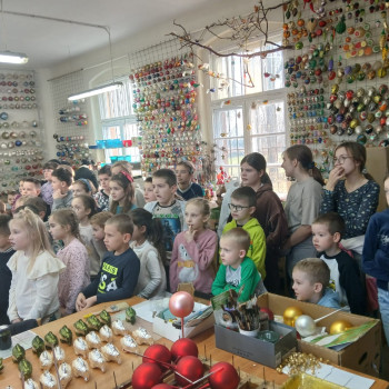 Nasi uczniowie mieli okazję poczuć klimat pałacowy zwiedzając poszczególne sale, które przeznaczone są na potrzeby sal lekcyjnych, auli, biblioteki czy też salonu reprezentacyjnego. Pełni pozytywnych wrażeń przejechaliśmy malowniczą trasą Doliny Baryczy do kolejnego punktu naszej wycieczki jakim była spółdzielnia socjalna produkująca bombki - ,,Szklany Świat” w Krośnicach. Tam uczestnicy zostali przywitani przez przewodnika, który opowiedział o historii fabryki oraz o tym, jak zmieniała się produkcja bombek na przestrzeni lat. Następnie uczniowie mieli okazję zobaczyć cały proces tworzenia ozdób. Pierwszym punktem był pokaz dmuchania szkła – uczniowie mogli obserwować, jak z rozgrzanej masy szklanej powstają delikatne ozdoby. W kolejnym etapie obserwowali ich srebrzenie, aż po ręczne malowanie i zdobienie brokatem. Wszyscy z zachwytem obserwowali, jak z prostego kawałka szkła powstaje błyszcząca bombka, gotowa do zawieszenia na choince.