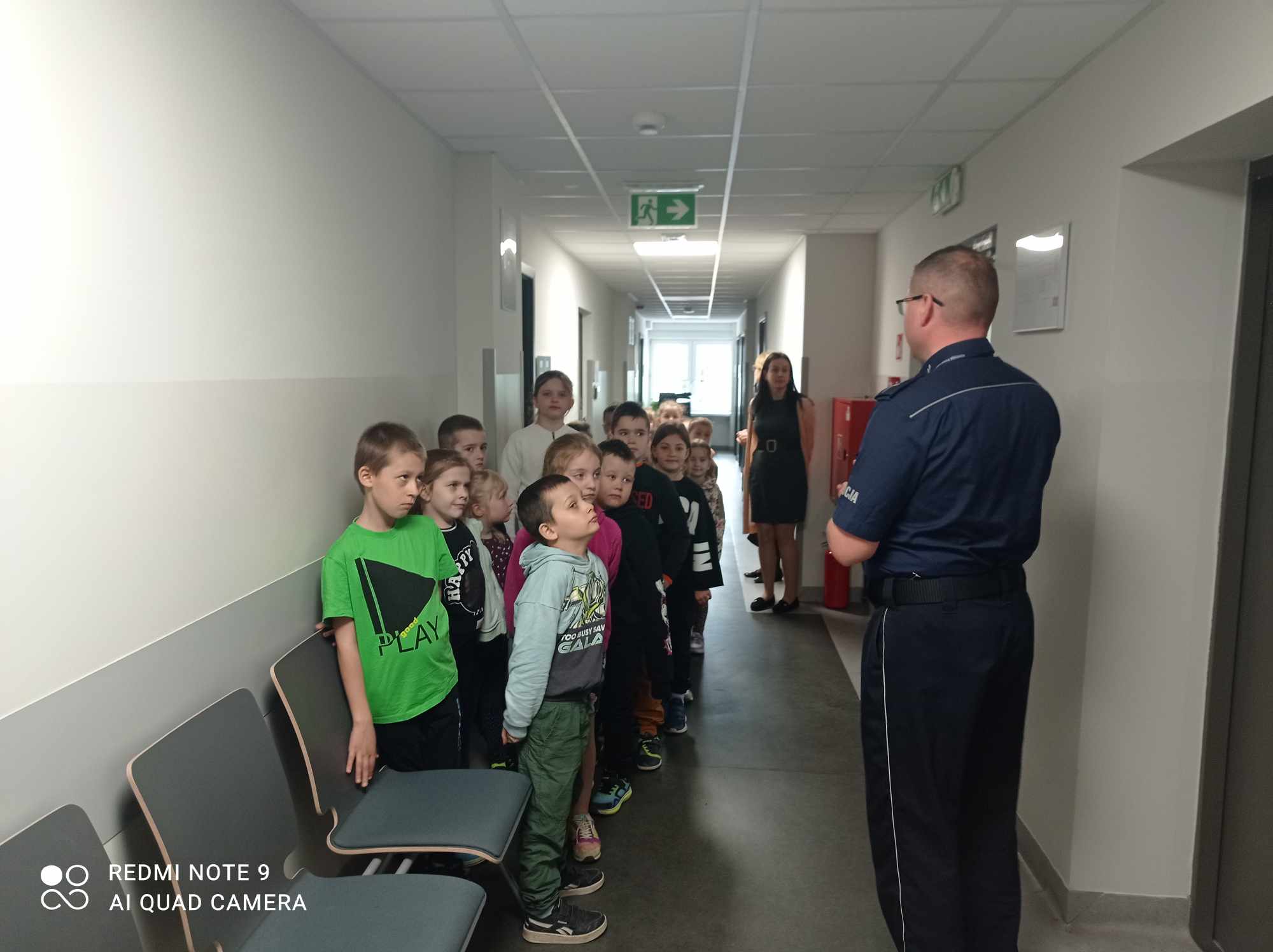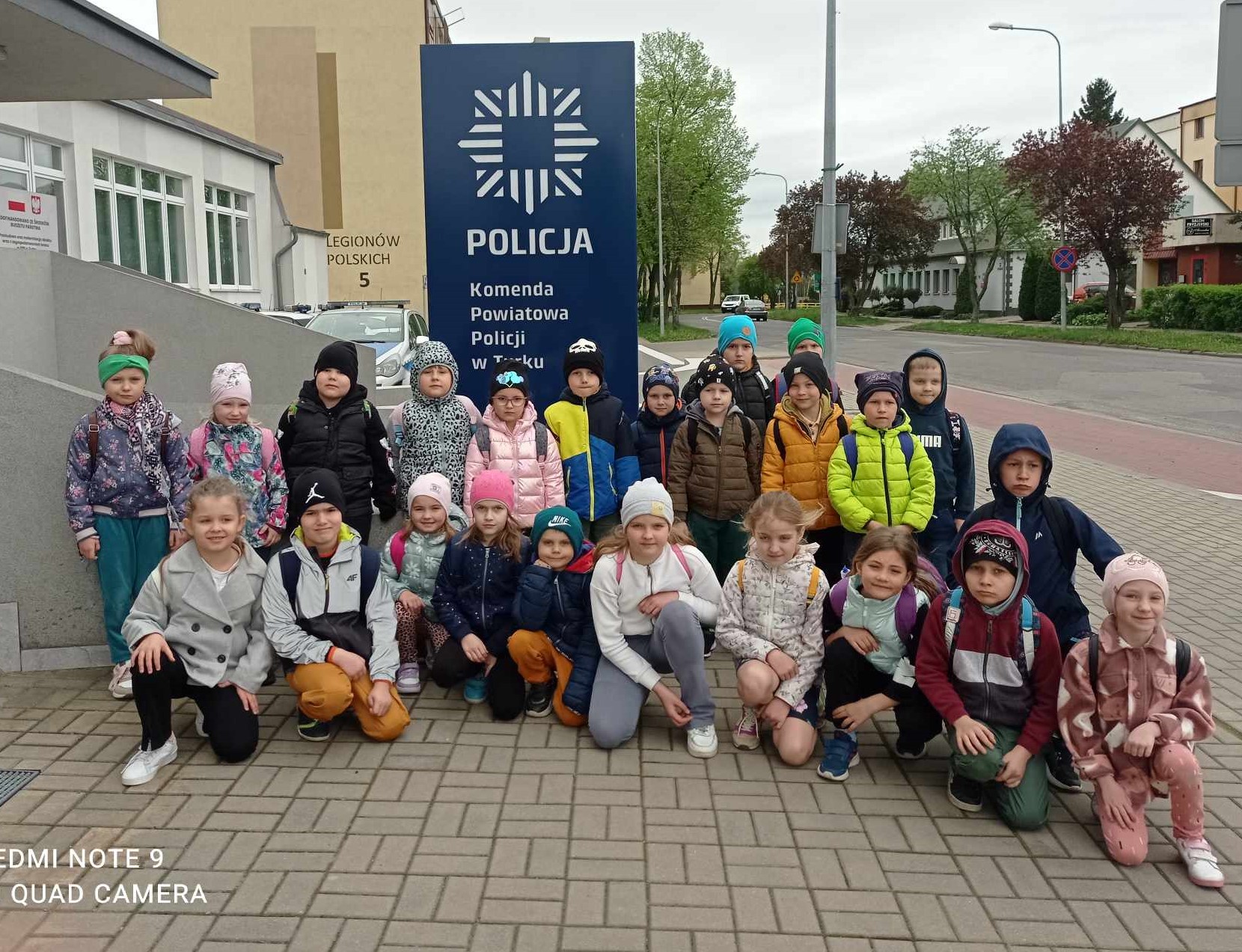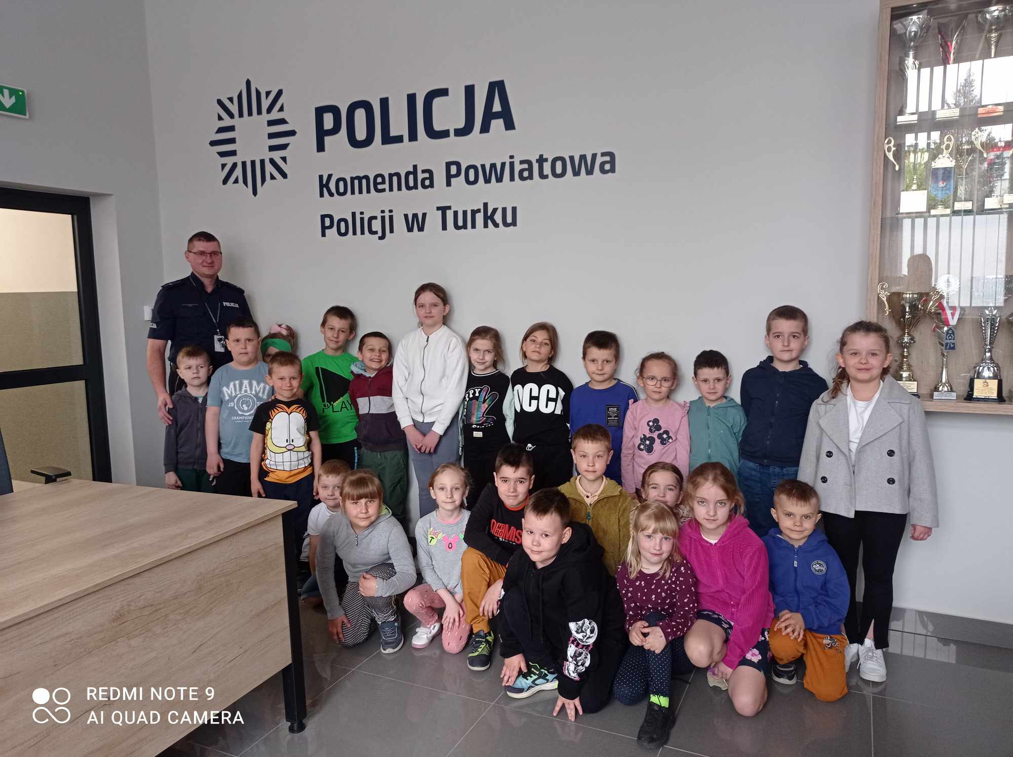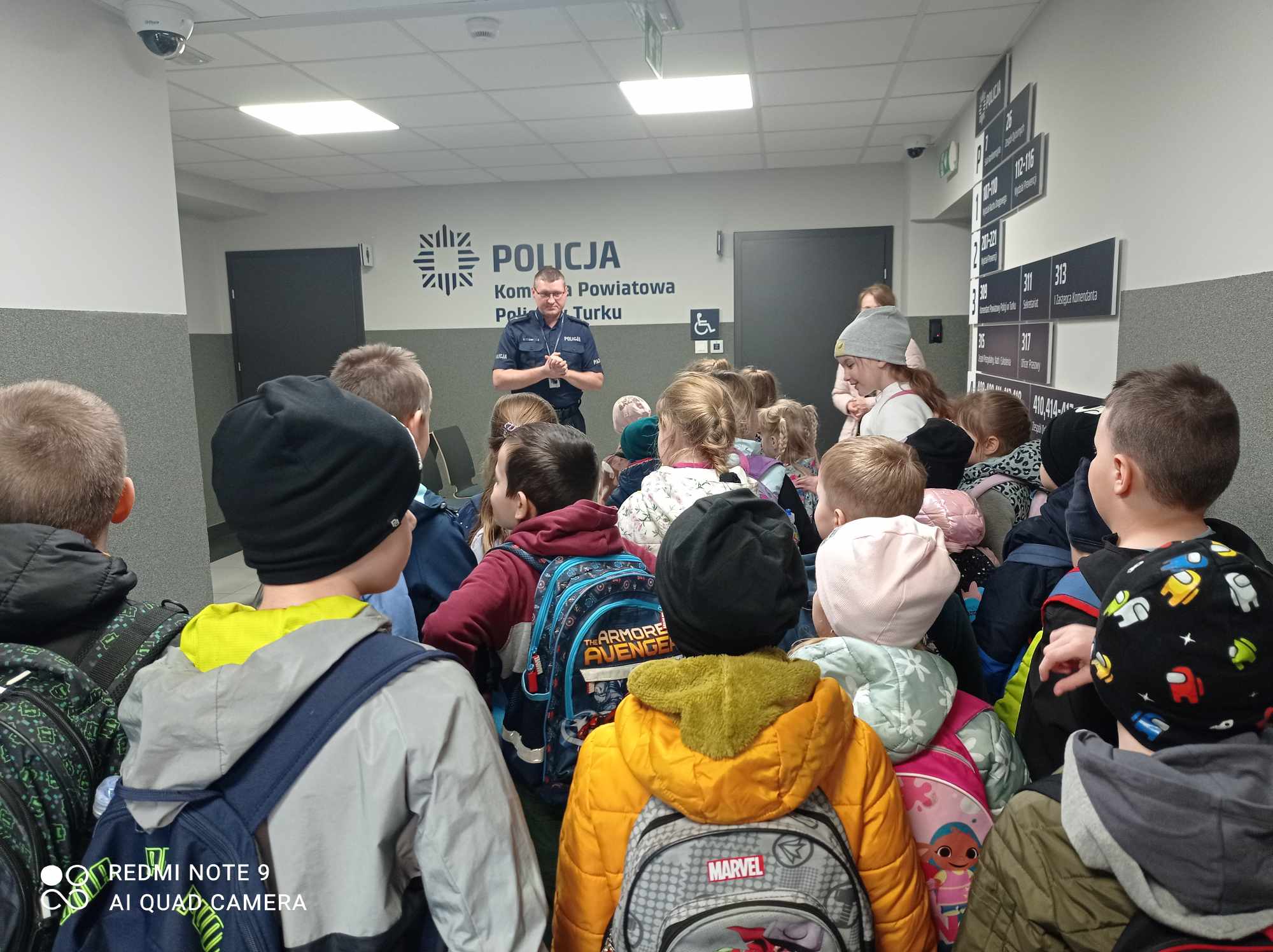 Następnie spacerując przez miasto, udaliśmy się do Komendy Powiatowej Policji w Turku, gdzie już czekał na nas mł. asp. p. Karol Fryt, z którym zwiedzaliśmy budynek komendy. Podczas zwiedzania pan Karol opowiedział nam o pracy policjantów pracujących w różnych wydziałach, w szczególności poznaliśmy prace technika kryminalistyki. Dzieci miały okazję zobaczyć w jaki sposób pobiera się odciski palców, wykonuje zdjęcia sygnalityczne oraz zabezpiecza ślady kryminalistyczne. Mieliśmy możliwość zobaczyć pracę policjantów na stanowisku kierowania, a także obejrzeć pomieszczenia dla osób zatrzymanych i salę odpraw do służby.