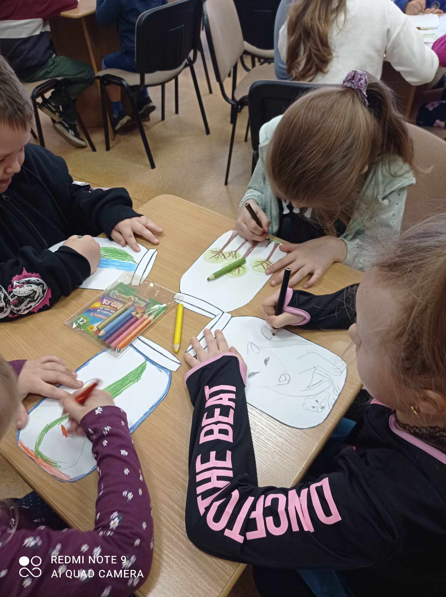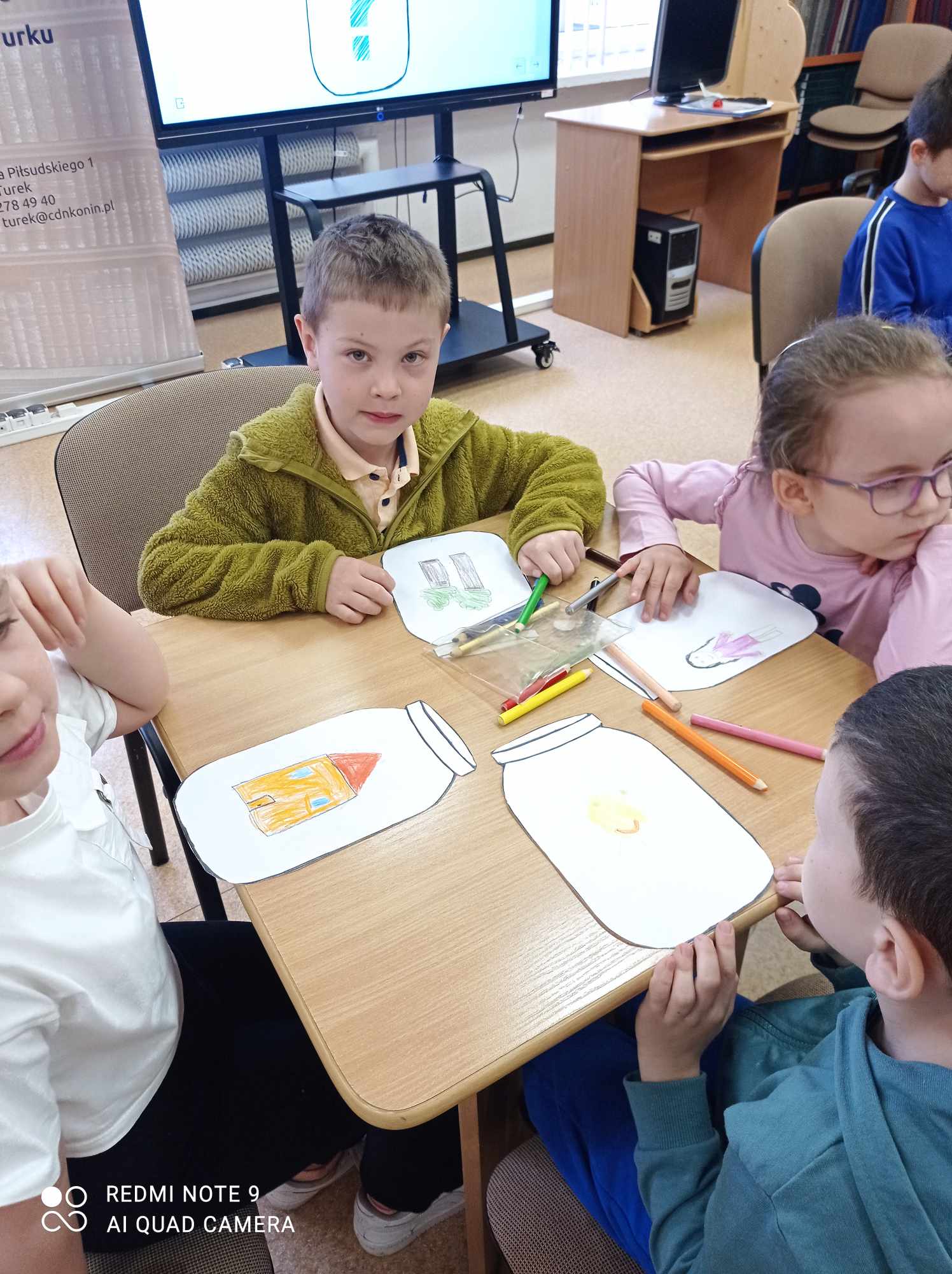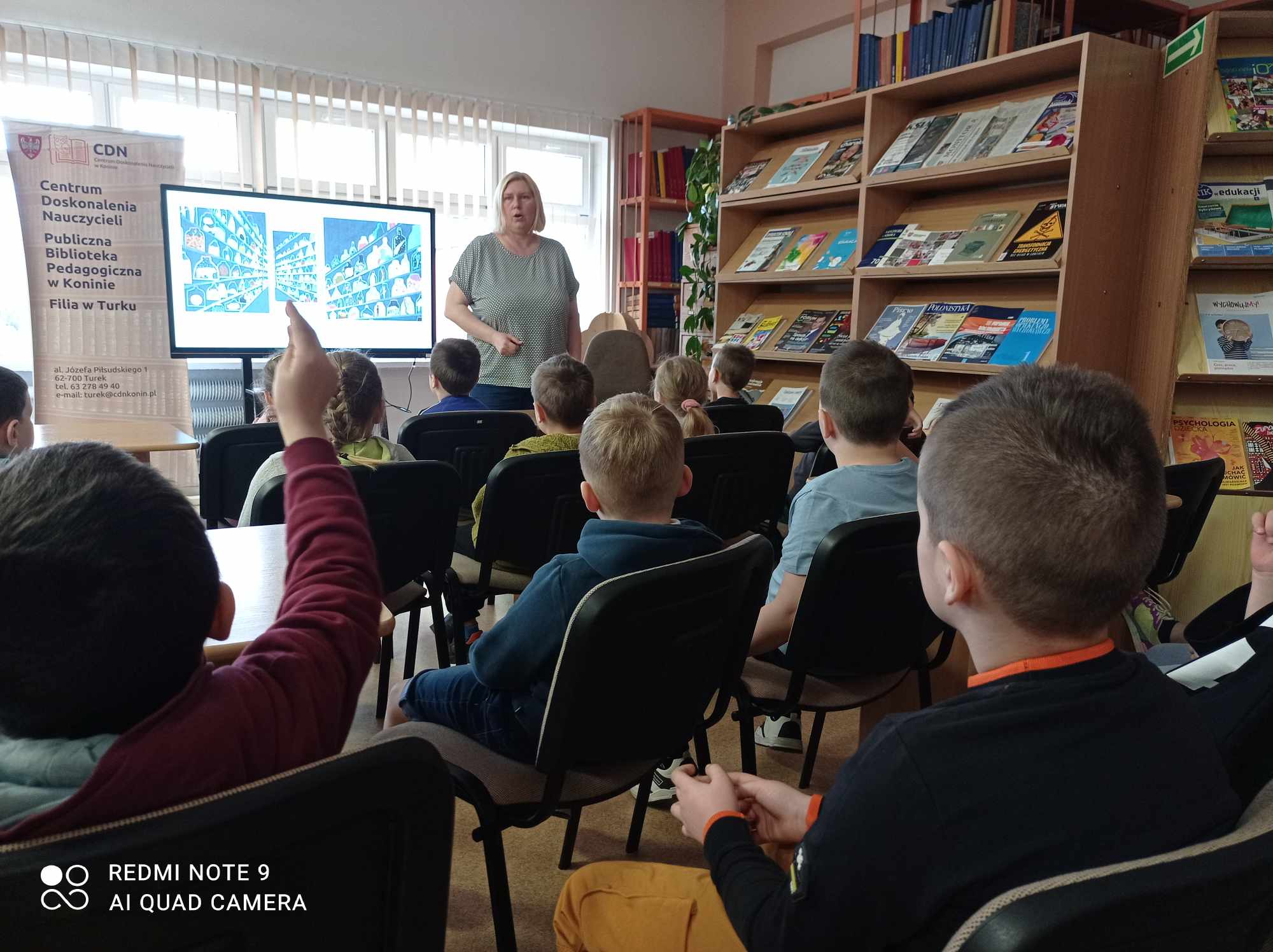 Uczniowie klas I i II oraz dzieci ze starszego oddziału przedszkolnego wycieczkę rozpoczęły od zajęć czytelniczych w CDN Publicznej Bibliotece Pedagogicznej filia w Turku, gdzie wzięły udział w warsztatach pt. „Skarby naszej planety – zajęcia oparte na treści książki pt. Planeta zamknięta w słoiku Martina Staneva”. Celem tych zajęć było kształtowanie wrażliwości na piękno przyrody i postaw proekologicznych oraz wyrabianie poczucia odpowiedzialności za naszą planetę.