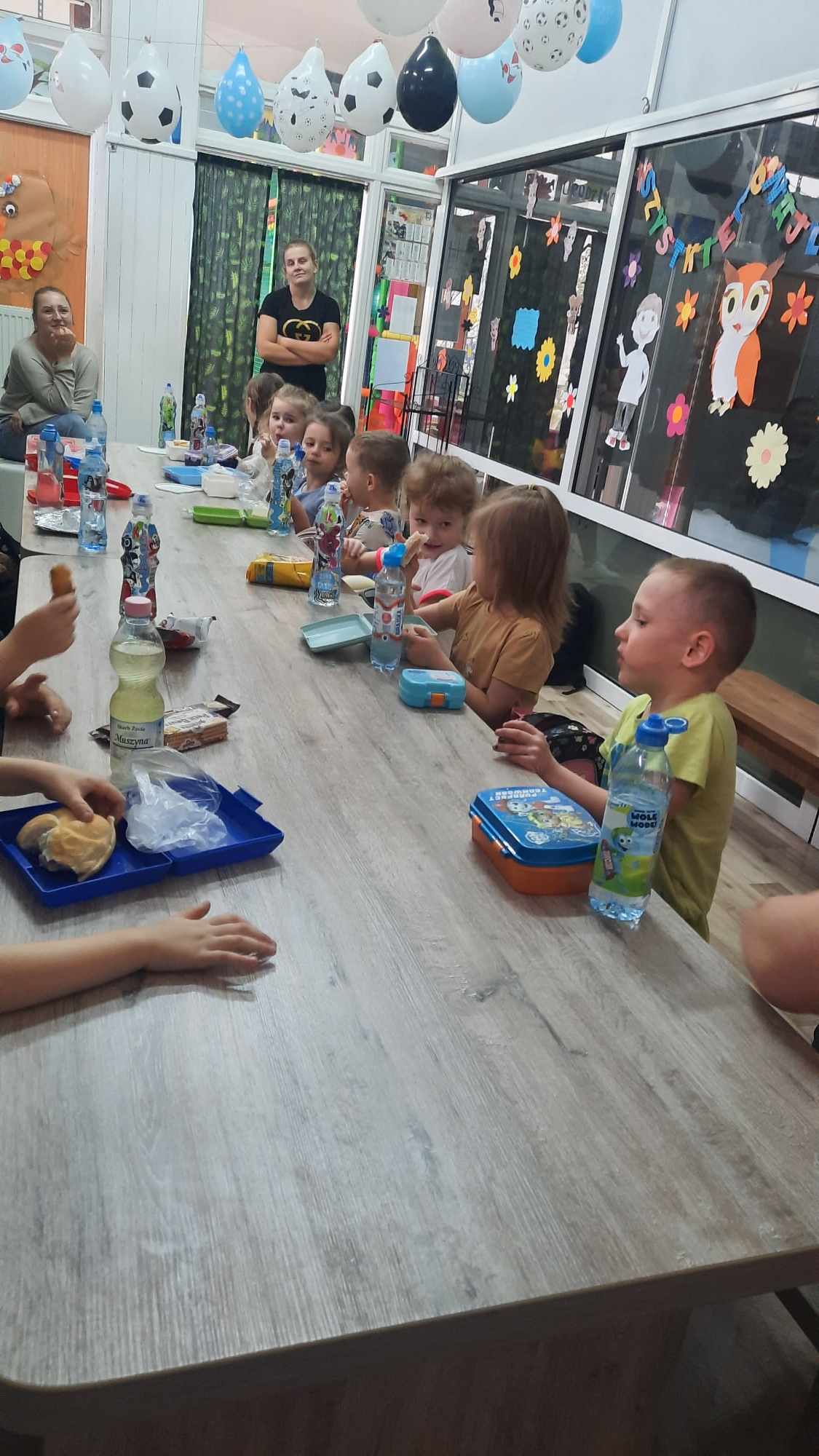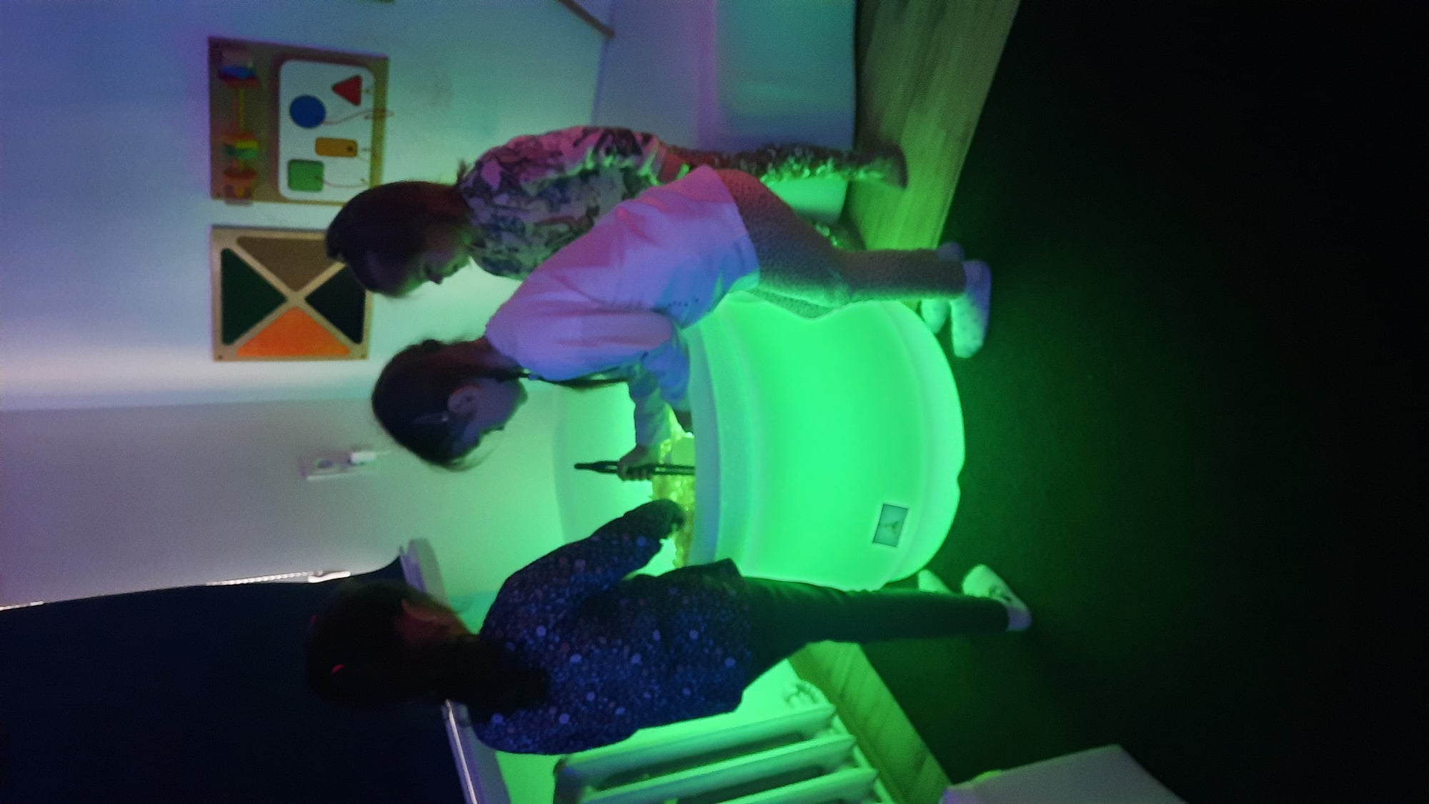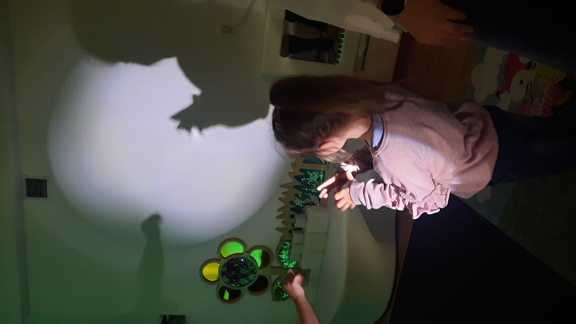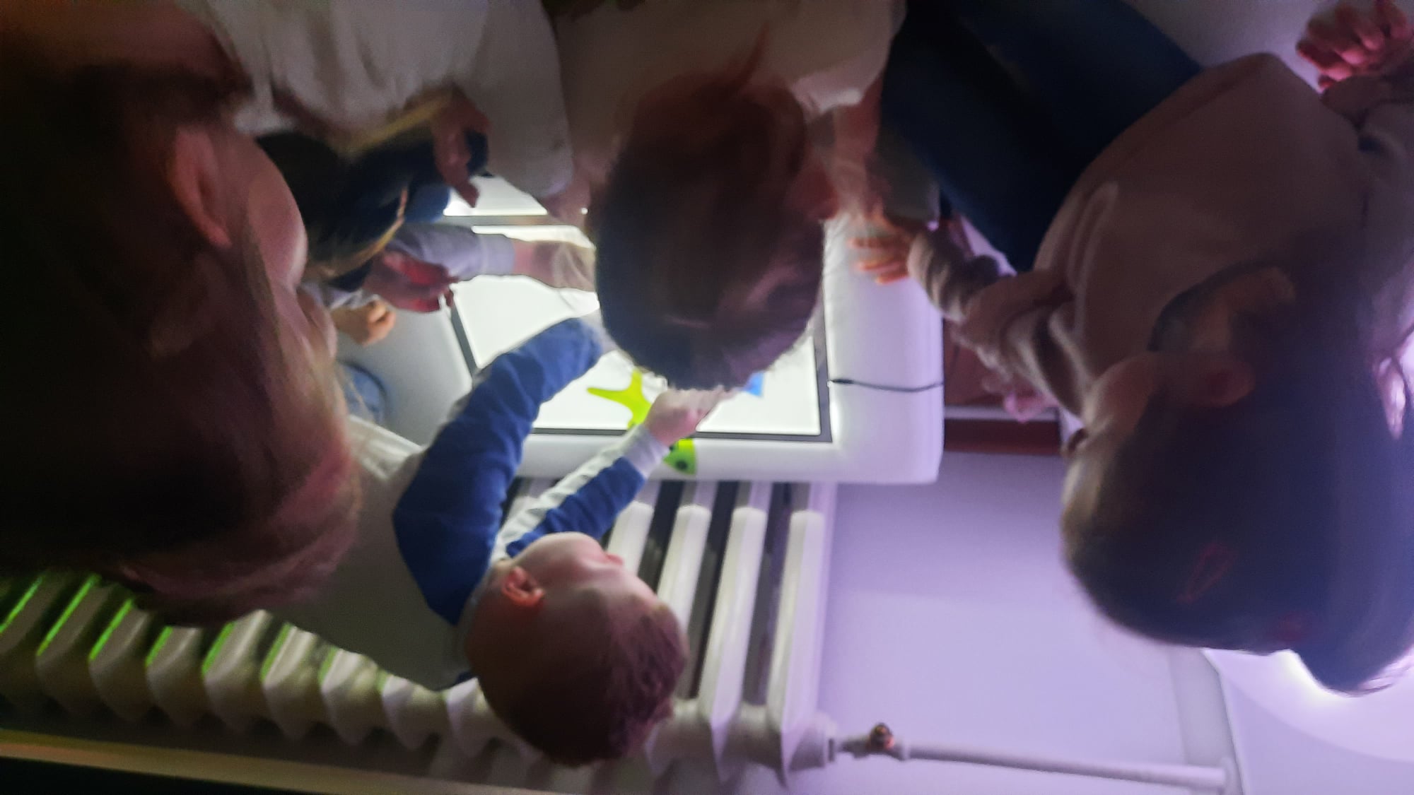 Natomiast dzieci z młodszego oddziału przedszkolnego odwiedziły Salę Doświadczenia Świata w Poradni Psychologoczno-Pedagogicznej. Pobyt w zaciemnionej sali i możliwość oddziaływania na wszystkie zmysły światłem, dźwiękiem, zapachem oraz dotykiem wyciszyła dzieci a jednocześnie delikatnie je stymulowała. Maluchy były pod ogromnym wrażeniem kuli UV, urządzenia nagłaśniającego i podświetlanego stolika wodnego. Kolejnym punktem wycieczki młodszych dzieci była sala zabaw „Sowa”, gdzie dzieci wspólnie świetnie się bawiły.