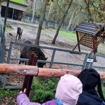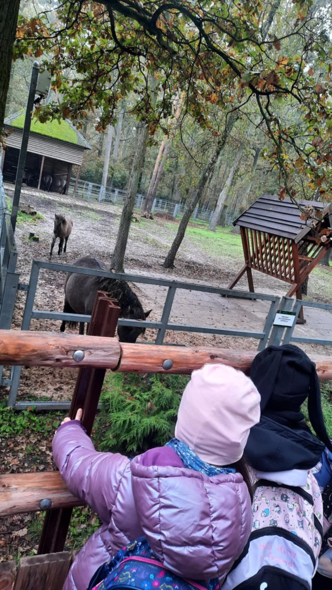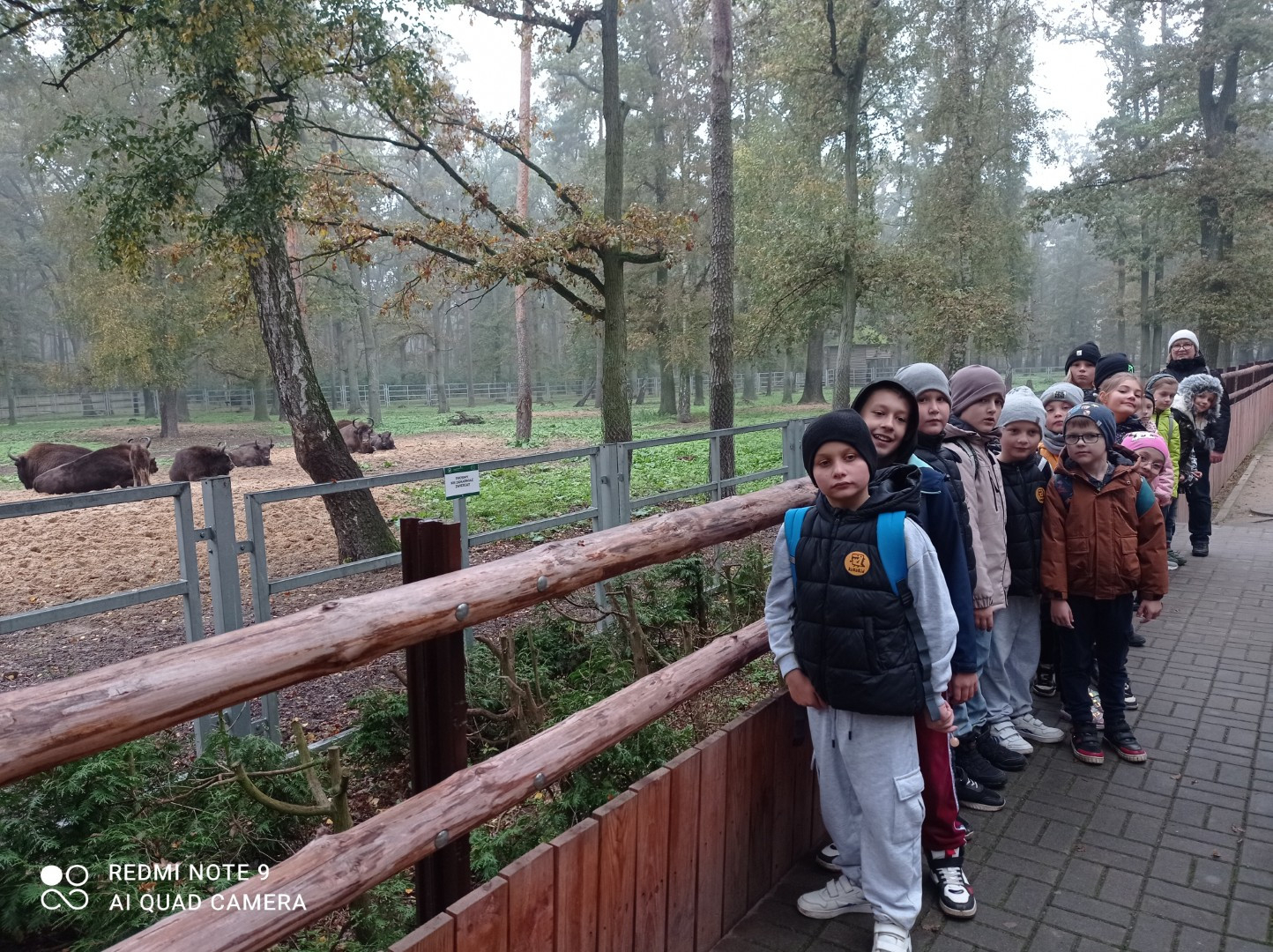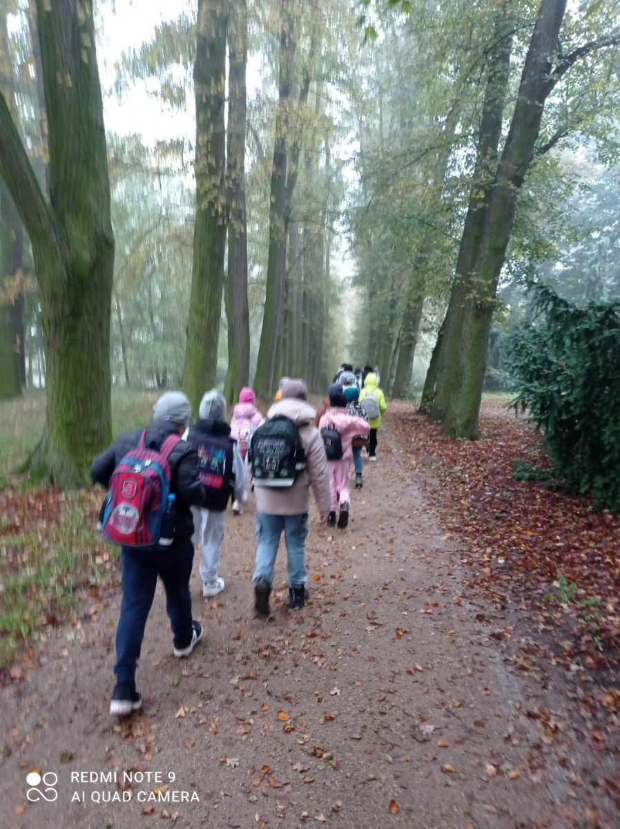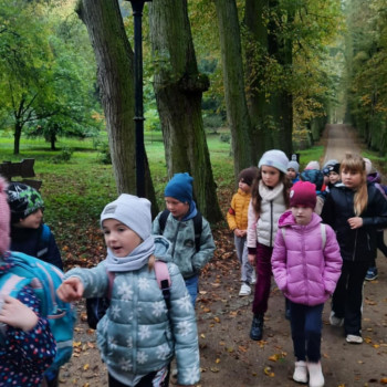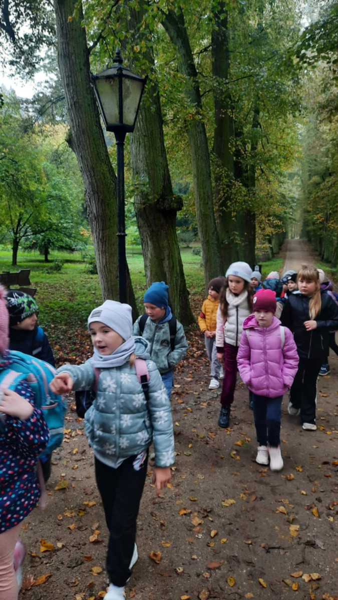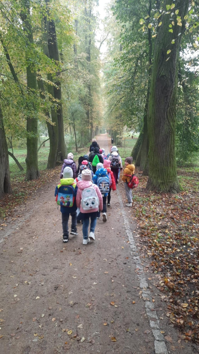 Następnie dzieci udały się na spacer po kompleksie leśnym przylegającym do parku-arboretum aby dotrzeć do Pokazowej Zagrody Zwierząt w Gołuchowie, gdzie mogły podziwiać nie tylko żubry ale również dziki, koniki polskie i daniele. Podczas spaceru po parku uczniowie podziwiali różne gatunki drzew w jesiennej odsłonie oraz liczne wiewiórki biegające miedzy drzewami.
