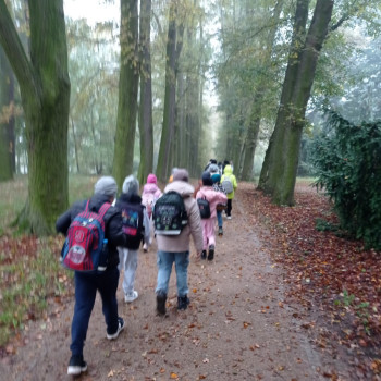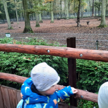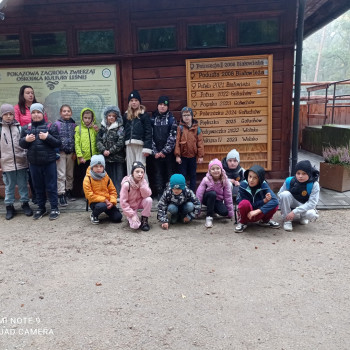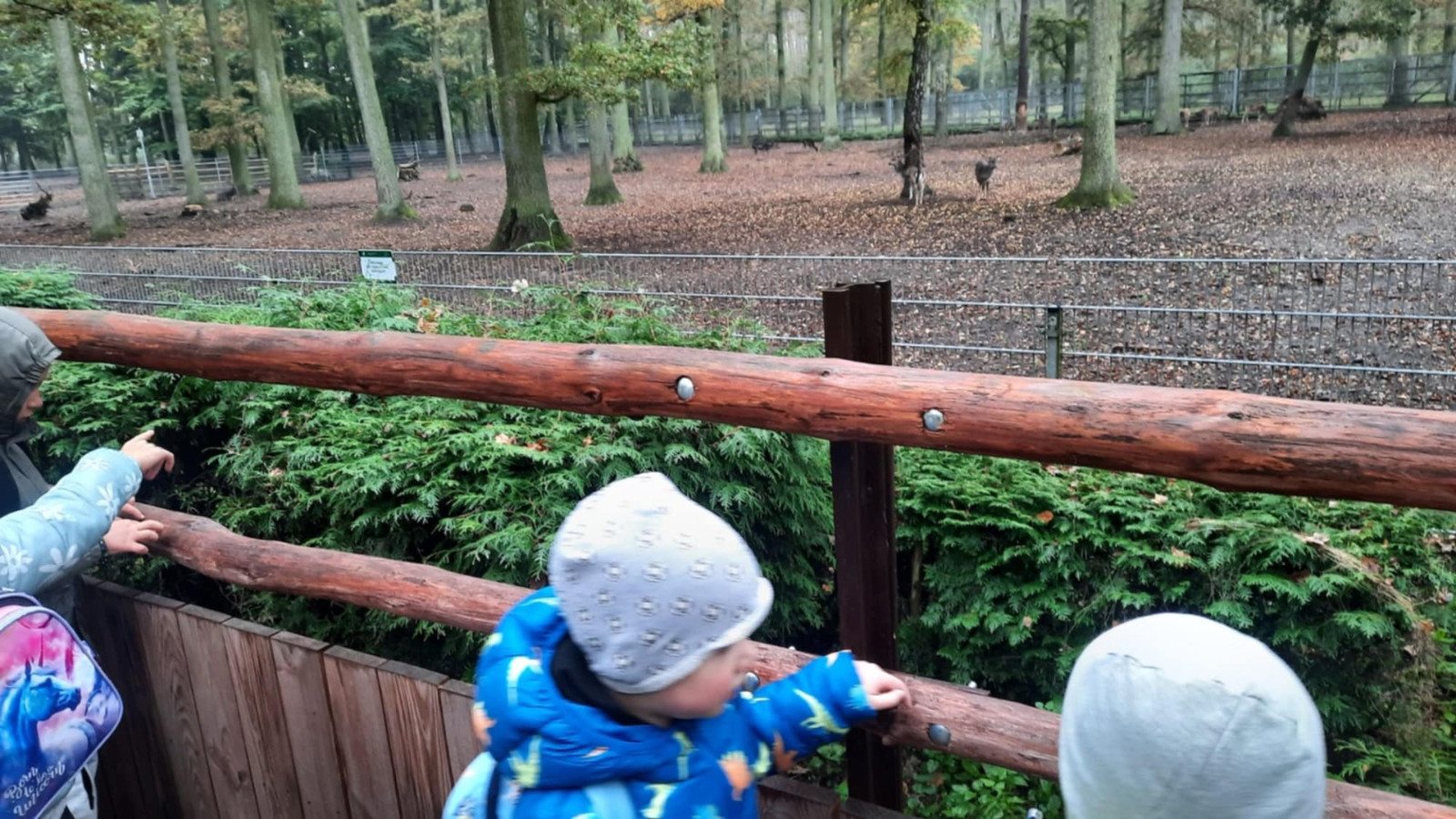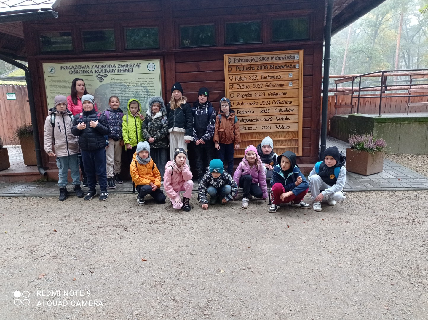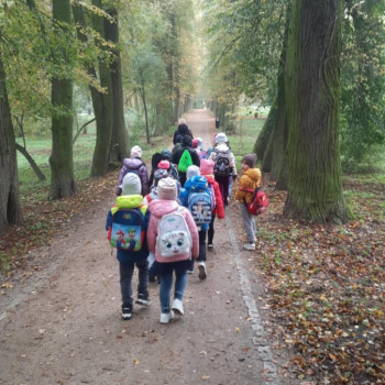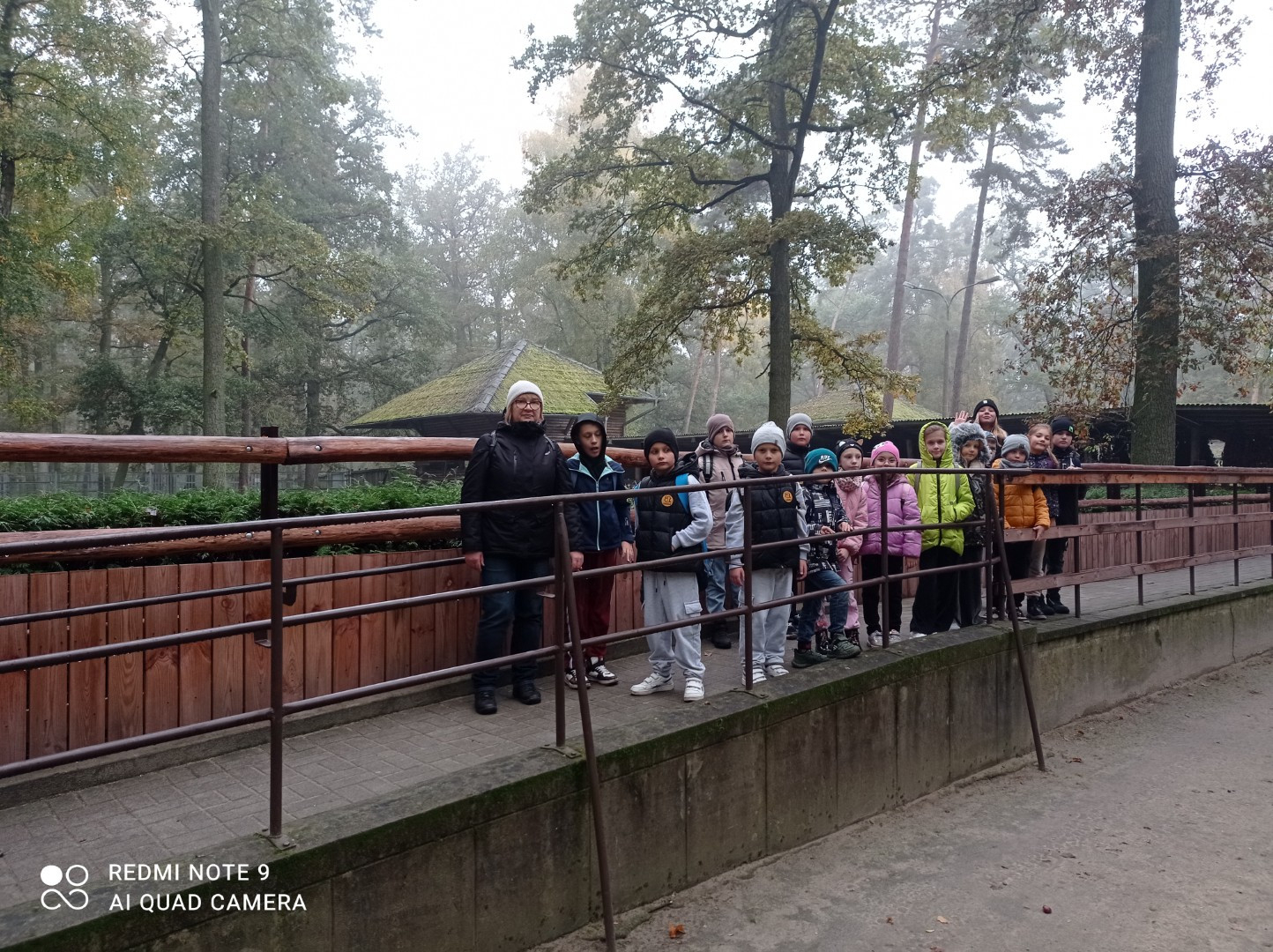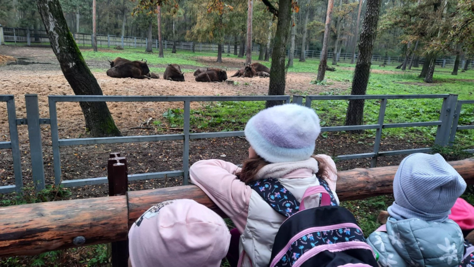 Następnie dzieci udały się na spacer po kompleksie leśnym przylegającym do parku-arboretum aby dotrzeć do Pokazowej Zagrody Zwierząt w Gołuchowie, gdzie mogły podziwiać nie tylko żubry ale również dziki, koniki polskie i daniele. Podczas spaceru po parku uczniowie podziwiali różne gatunki drzew w jesiennej odsłonie oraz liczne wiewiórki biegające miedzy drzewami.